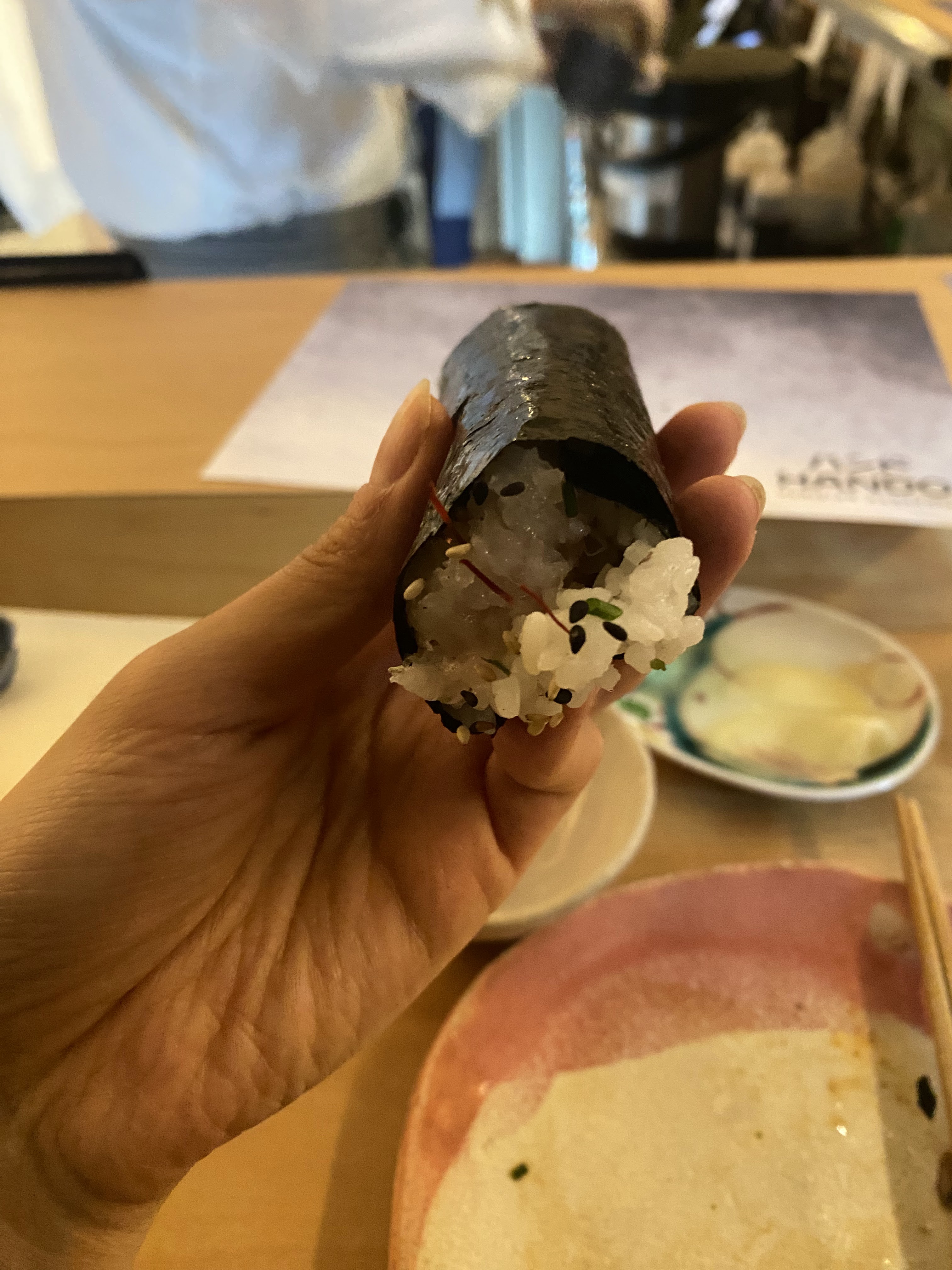 Super moment dans ce restaurant que je voulais faire depuis longtemps ! Pas déçue du tout de la nourriture (fraîcheur des poissons) , du cadre, du service et de la gentillesse des hôtes. Nous avons pris un menu handroll (félicitations aux chef!) et deux entrées super bien faites (salade de wakame/champignons et salade épinard/wakame) C’était un repas de haut vol ! (Toute petite remarque: sur la salade de wakame/champignon et certains handroll, le sel était un peu trop présent , mais cela est à l’appréciation de chacun!) A recommander !!