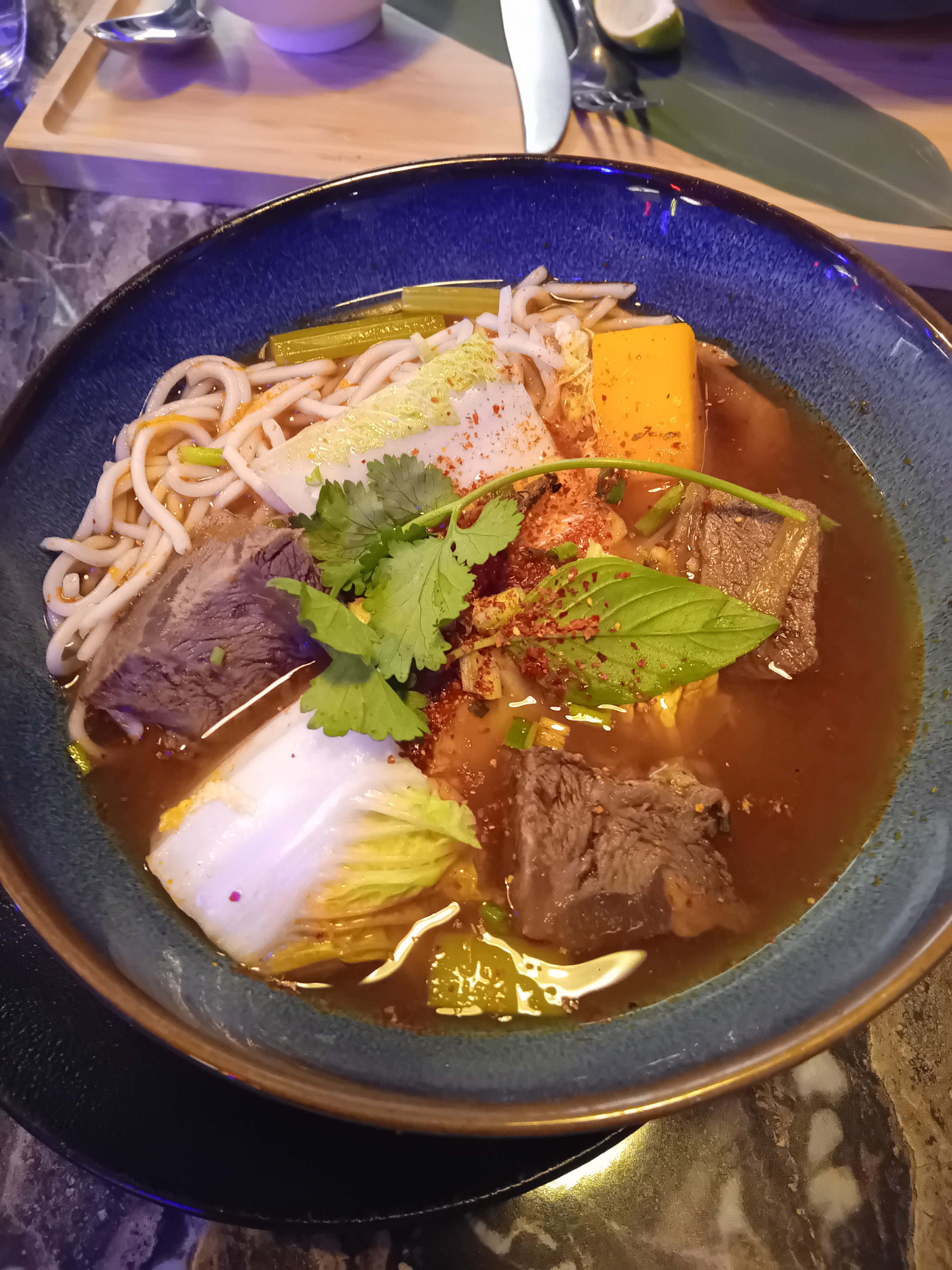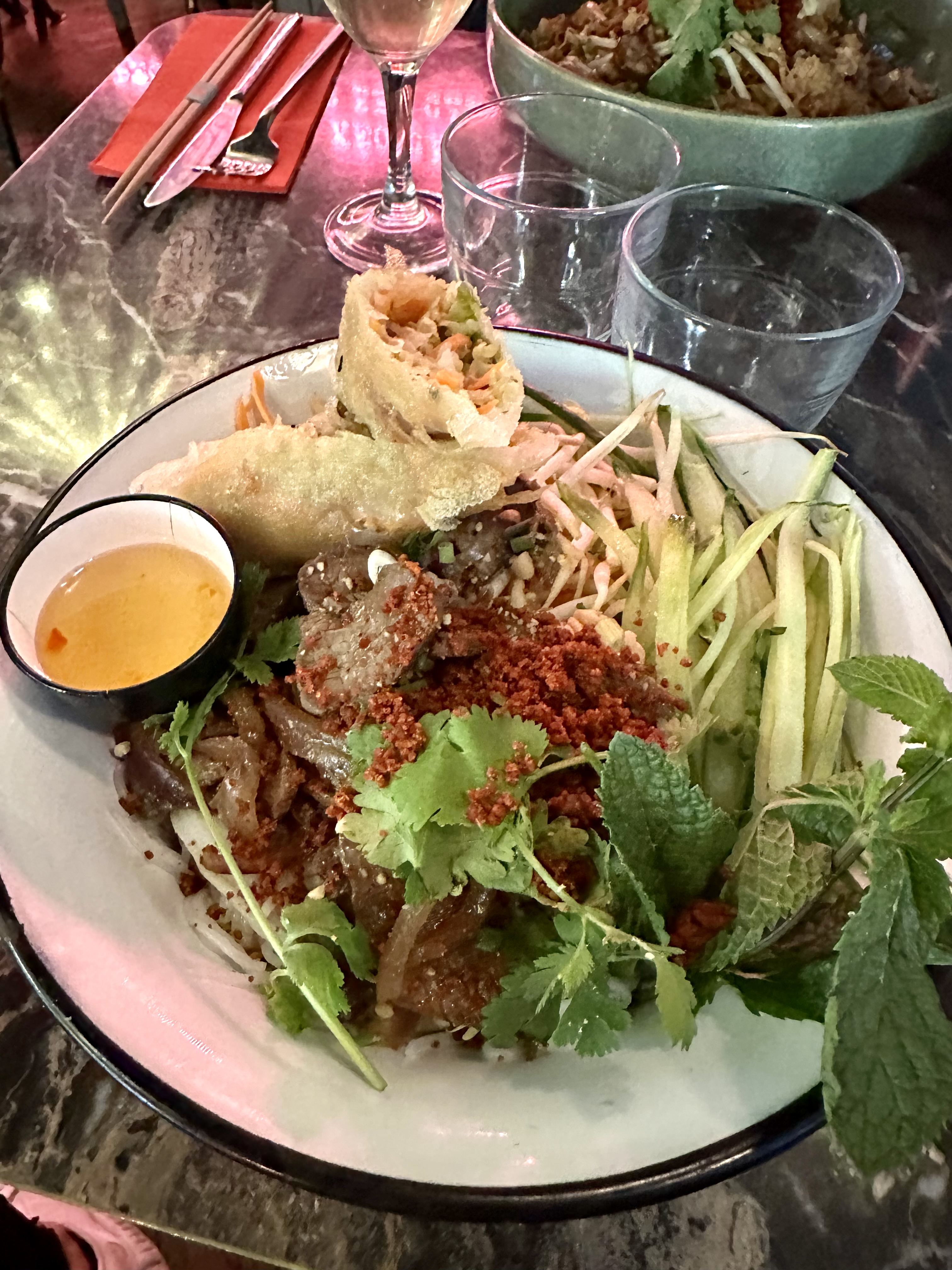 Le décor est vraiment très beau, le service était aussi correct. Les plats étaient plutôt bons mais assez chers pour la qualité. J’ai goûté bien meilleur pour moins cher donc c’était un peu décevant. J’aurais préféré que une partie de la viande du phô soit moins cuite pour la laisser cuire doucement dans le bouillon mais toute la viande était déjà cuite malheureusement. Les portions sont aussi un peu petites.