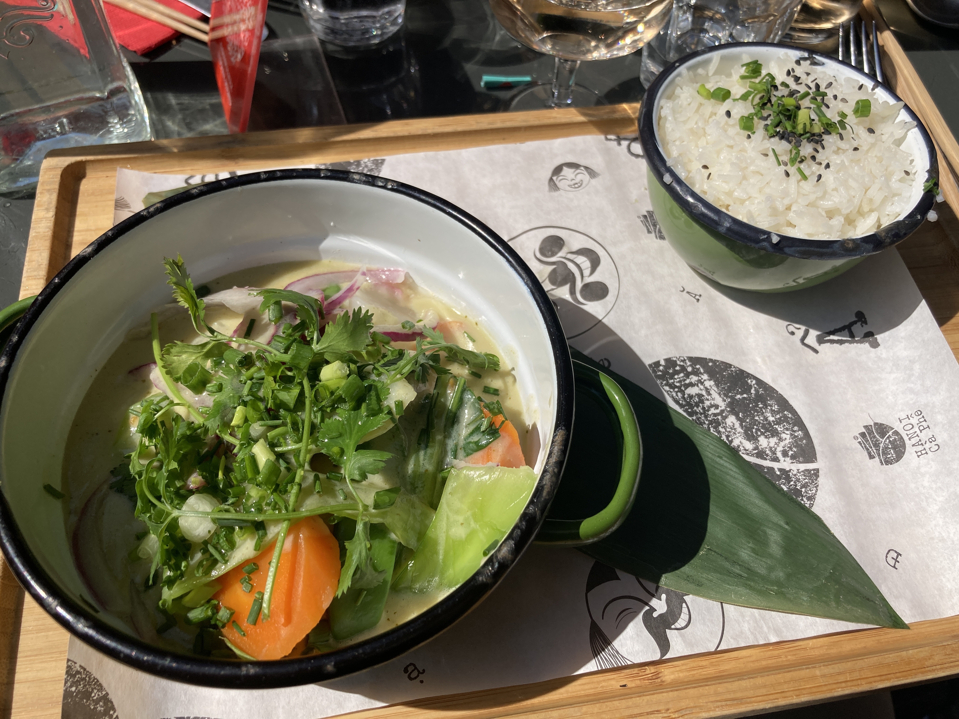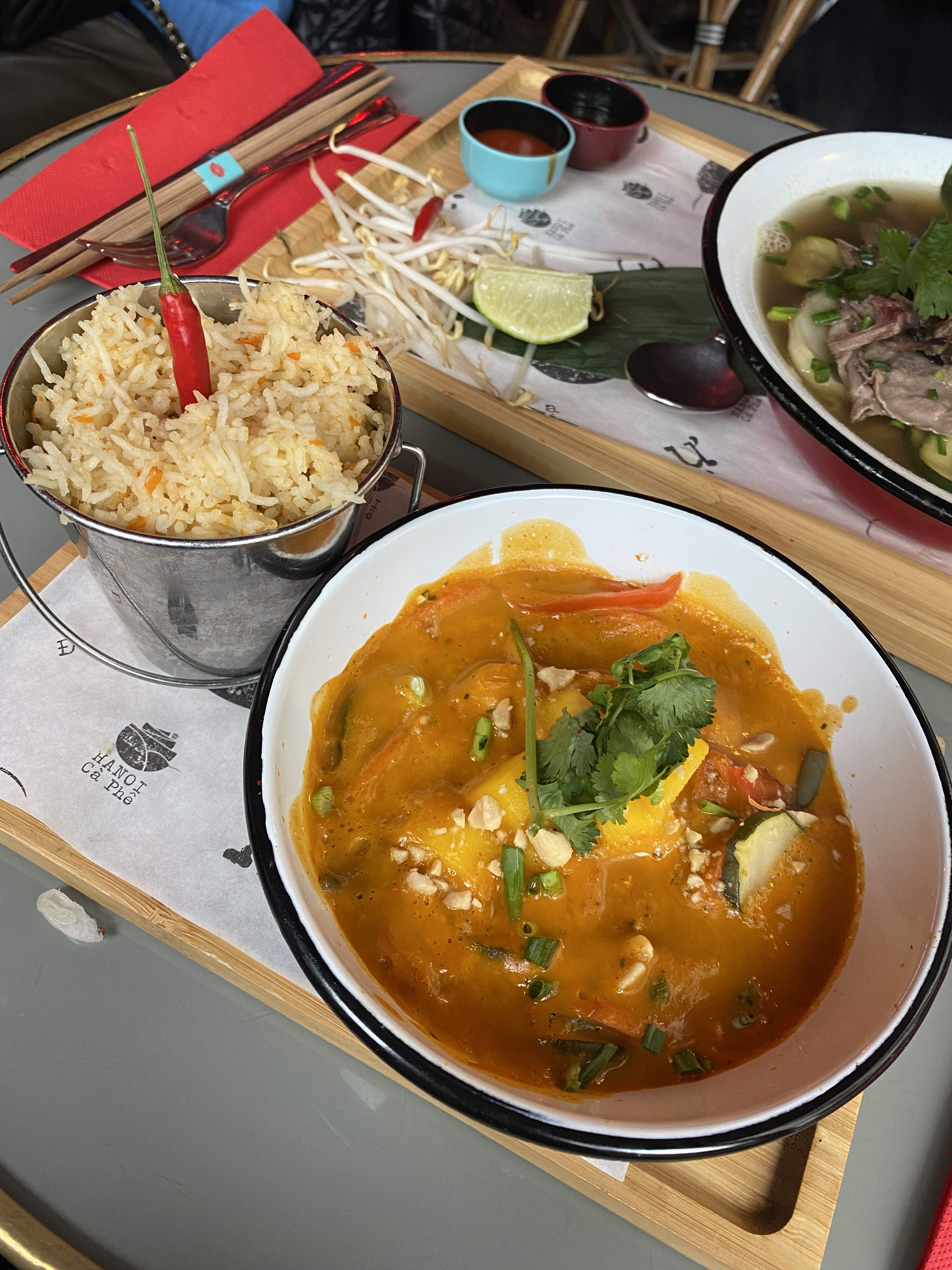 Nous avons passé un très bon moment au sein du Hanoï Ca Phe Opéra. Le service exercé par Yann fut exemplaire, professionnel, et de bon conseil. Les quantités servies sont importantes, difficile de terminer son assiette alors que c'est pourtant bon. Quelques choix végétariens, les nems au kiri sont très bons! Le lieu est convivial, chauffé (humainement et aussi grâce aux lampes hihi), et il y a même un DJ sur place. Nous reviendrons certainement.