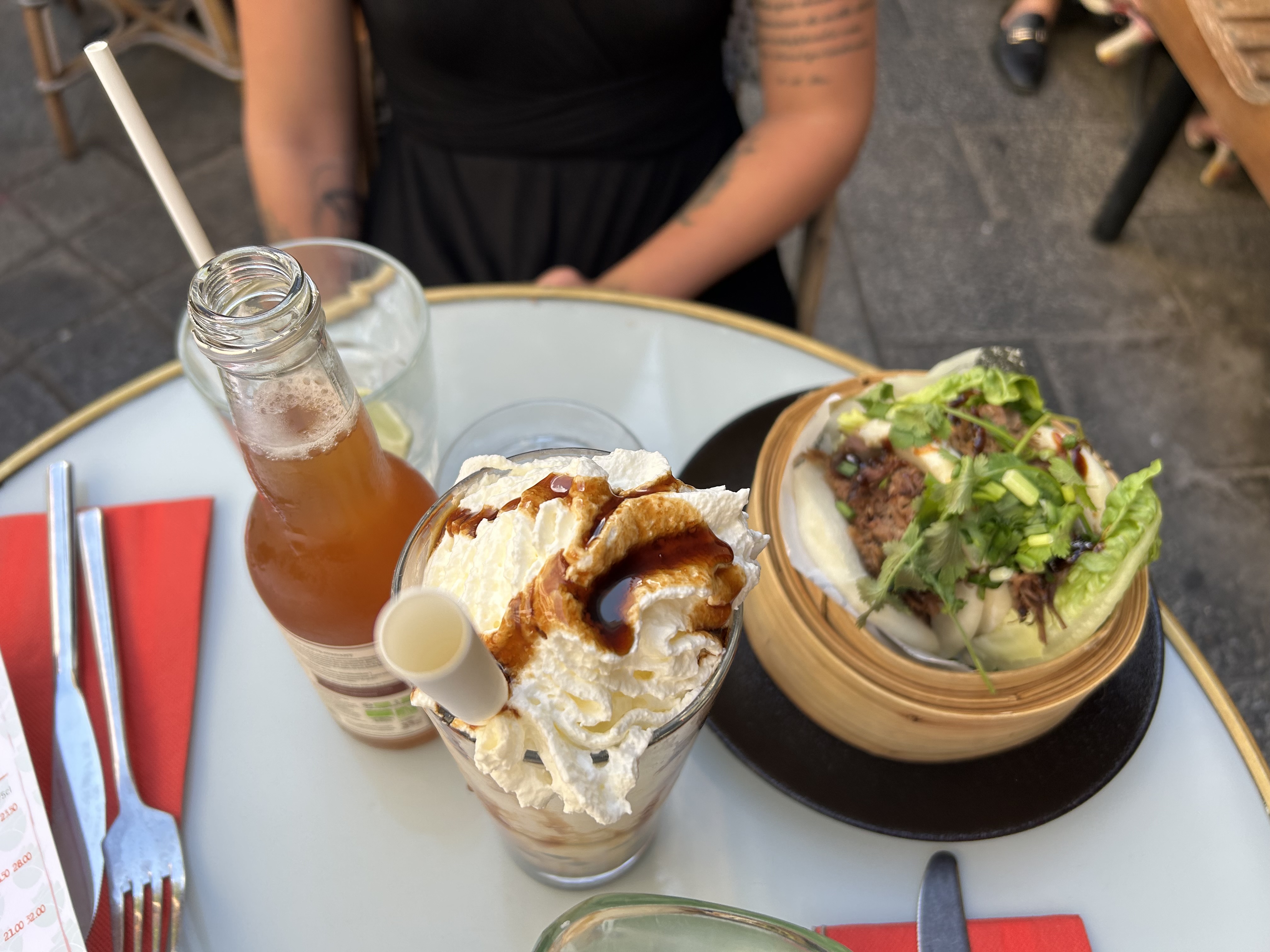 Terrasse agréable, les ravioles aux légumes sont bonnes. Malheureusement, le bubble tea (passion) n’avait pas de goût, seulement de l’eau avec des perles de tapioca trop cuites… à déguster avec des couverts semble-t-il.