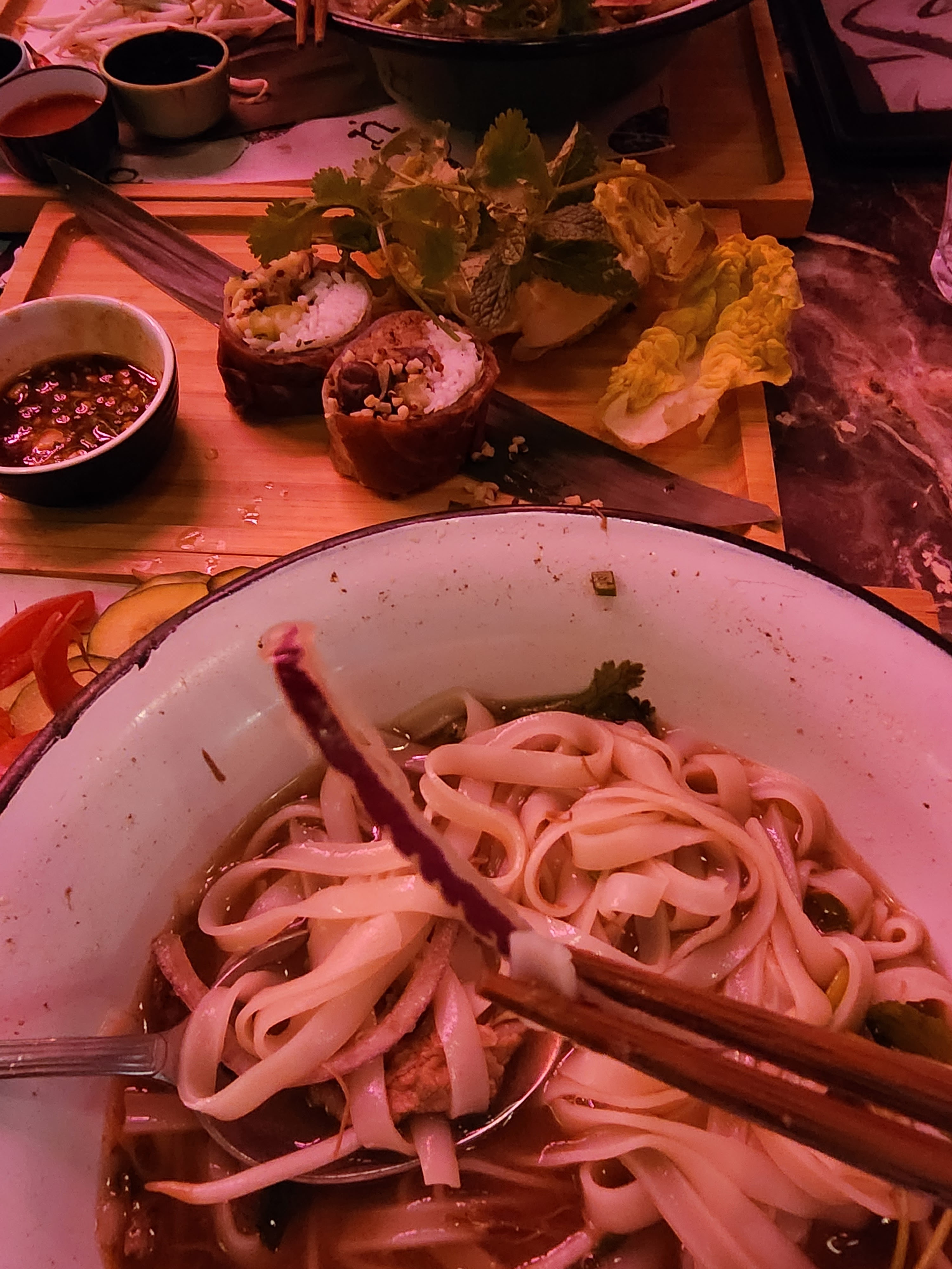 Restaurant de cuisine fusion asiatique. Il y a Pho dans leur nom mais ce n'est en réalité pas un restaurant vietnamien. L'ambiance était incroyable. Ils ont mélangé les arts et la culture de nombreux pays dans ce bel endroit. La nourriture était également fusionnée dans un nouveau look familier. Par exemple, vous avez commandé du Phad Thai et cela ressemble presque à ceux de Thaïlande. Mais lorsque vous l'aurez essayé, vous aurez un goût un peu détourné des épices d'autres pays. La nourriture était bonne, le service était sympathique.