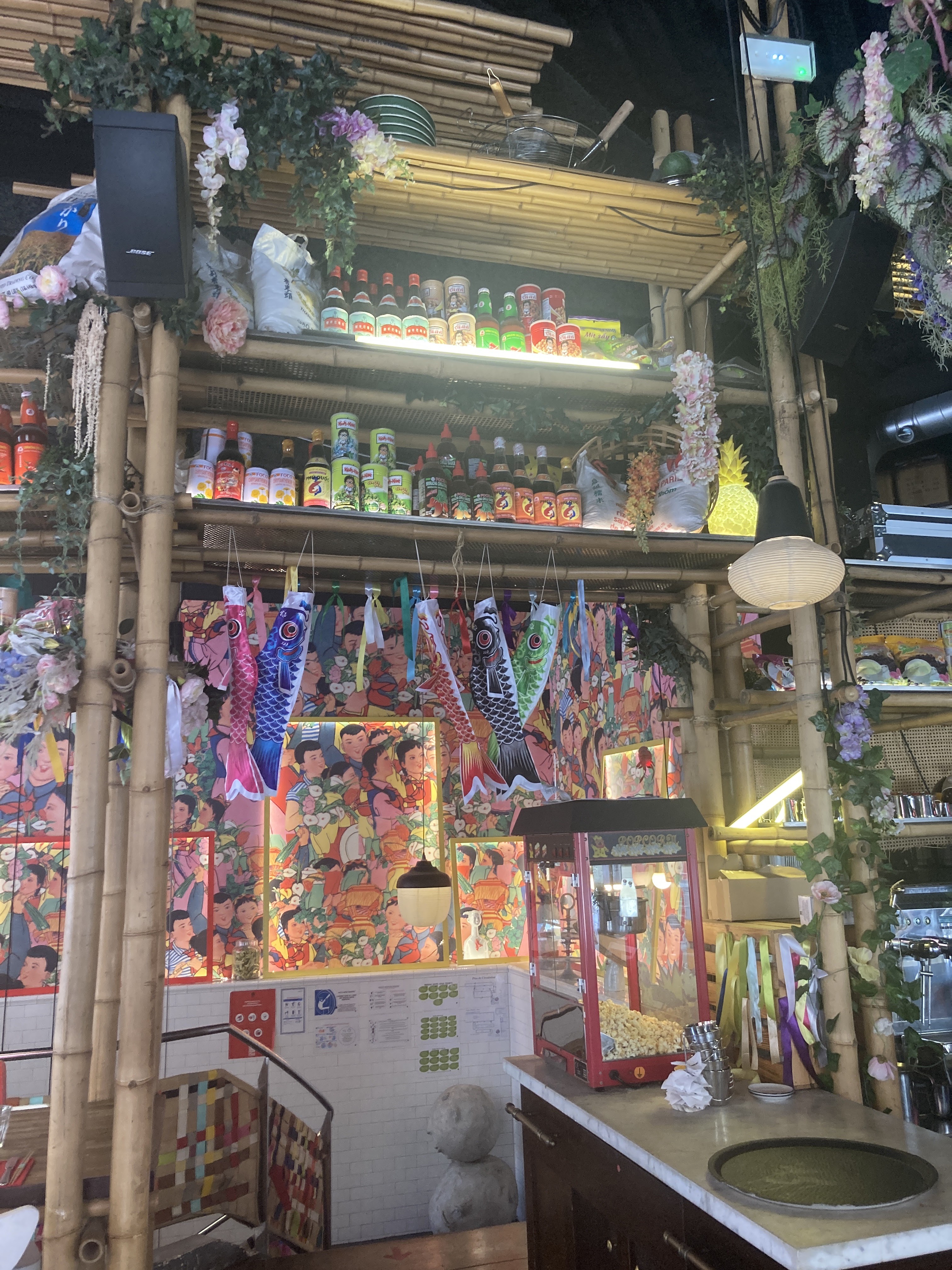 Bel endroit! Très beau design, personnel sympathique et grande diversité de plats et aussi de cocktails. J'ai pris la soupe pho, ce n'était pas la meilleure à mon goût mais j'ai apprécié l'expérience globale. Les portions sont relativement grosses et elles sont préparées et apportées très rapidement. Dans l'ensemble, c'est un lieu incontournable en raison de l'atmosphère générale, mais il peut y avoir un peu de monde et de bruit.
