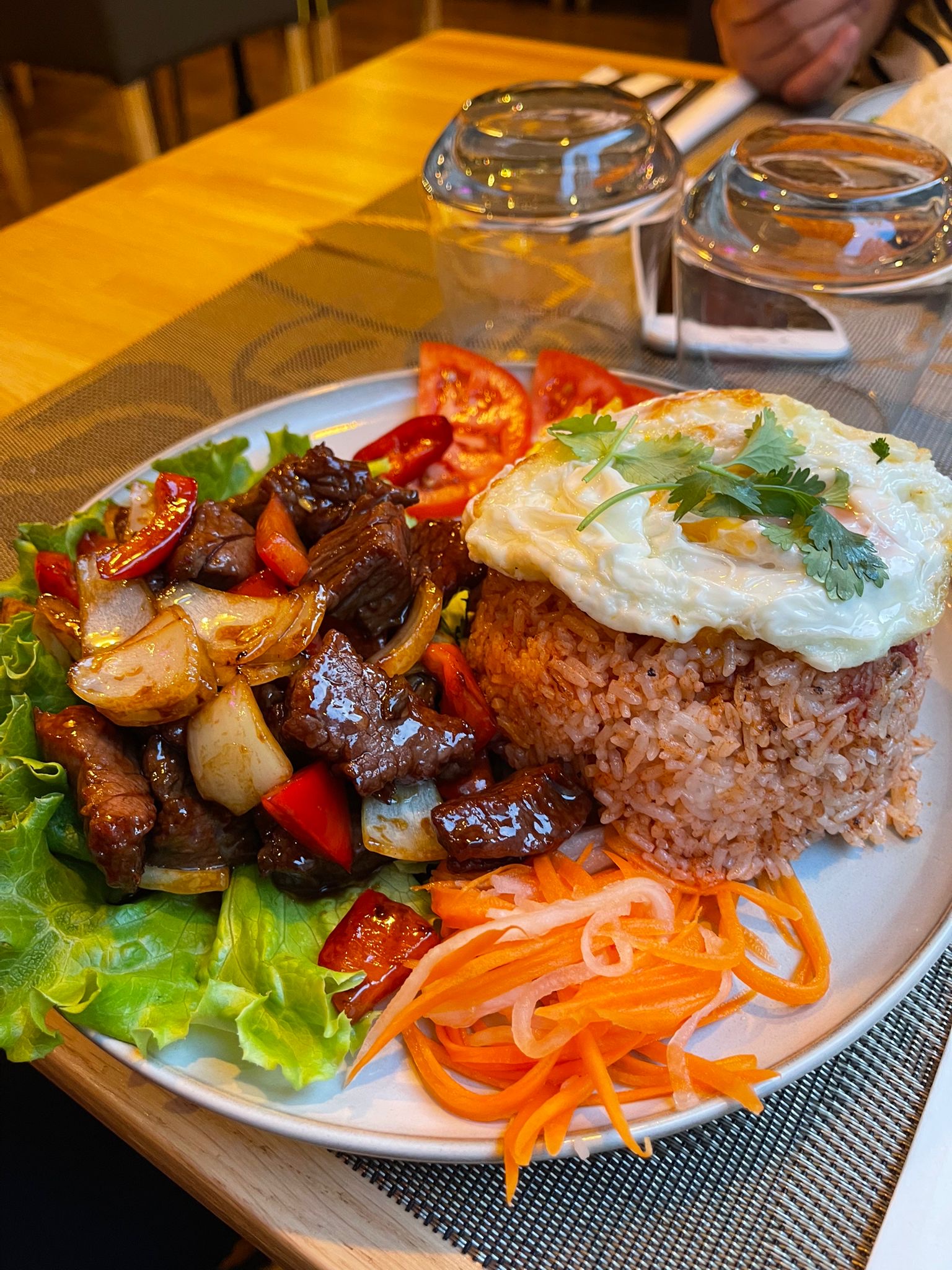 Nourriture délicieuse avec une belle présentation. La nourriture avait l'air esthétiquement savoureuse en plus d'être savoureuse à manger. La taille des portions était excellente et nous étions rassasiés à la fin. L'entrée de crevettes frites était accompagnée d'une sauce délicieuse à lécher les doigts. Nous avons eu un plat de Pho Bo et de riz au bœuf et à l'oignon. Je suis partial parce que j'adore Pho donc c'était génial mais je pense que les deux plats étaient excellents. Le dessert, le gingembre confit, a été une agréable surprise et une fin parfaite à un repas copieux et copieux. Heureux que nous soyons venus ici!