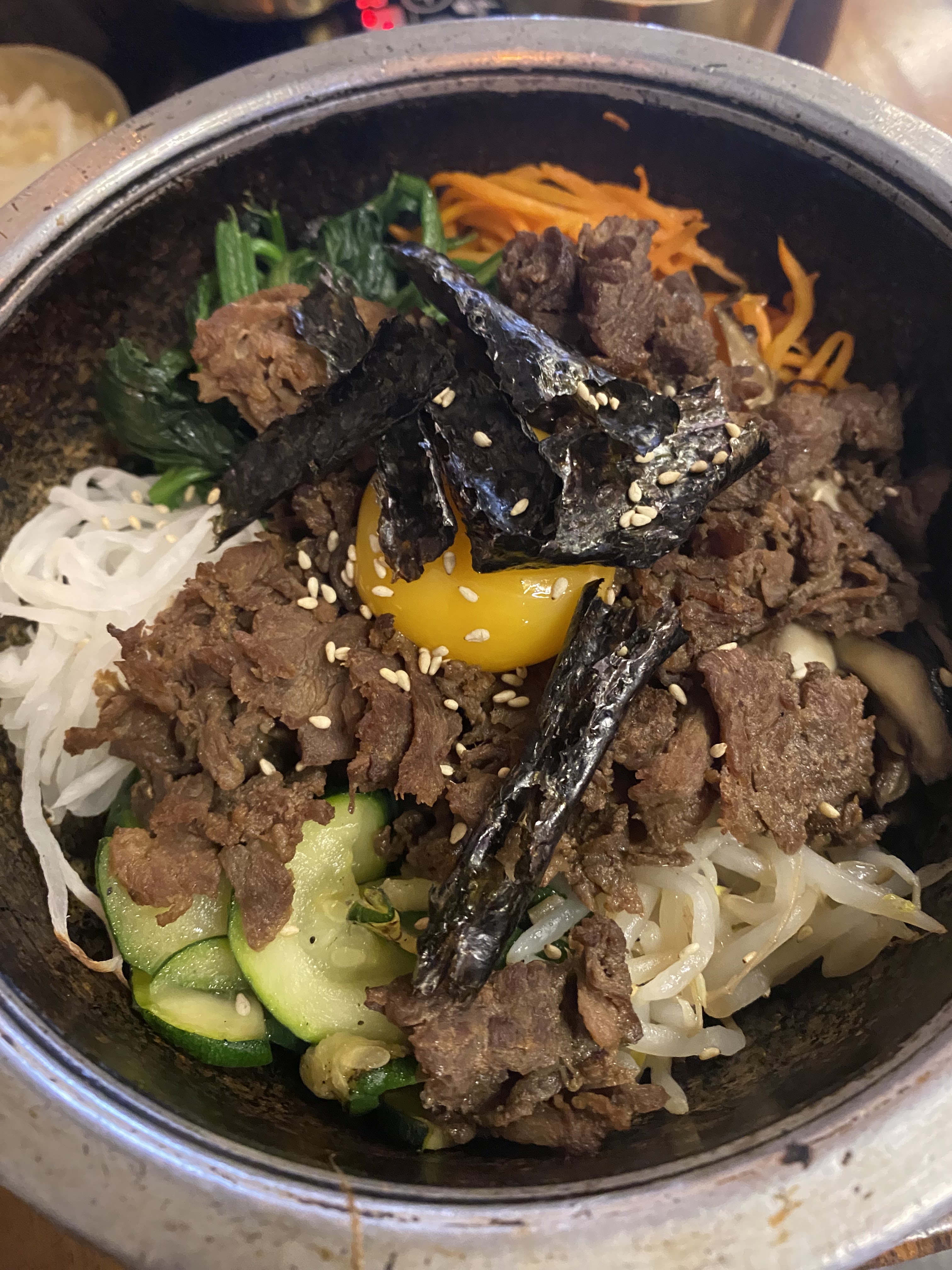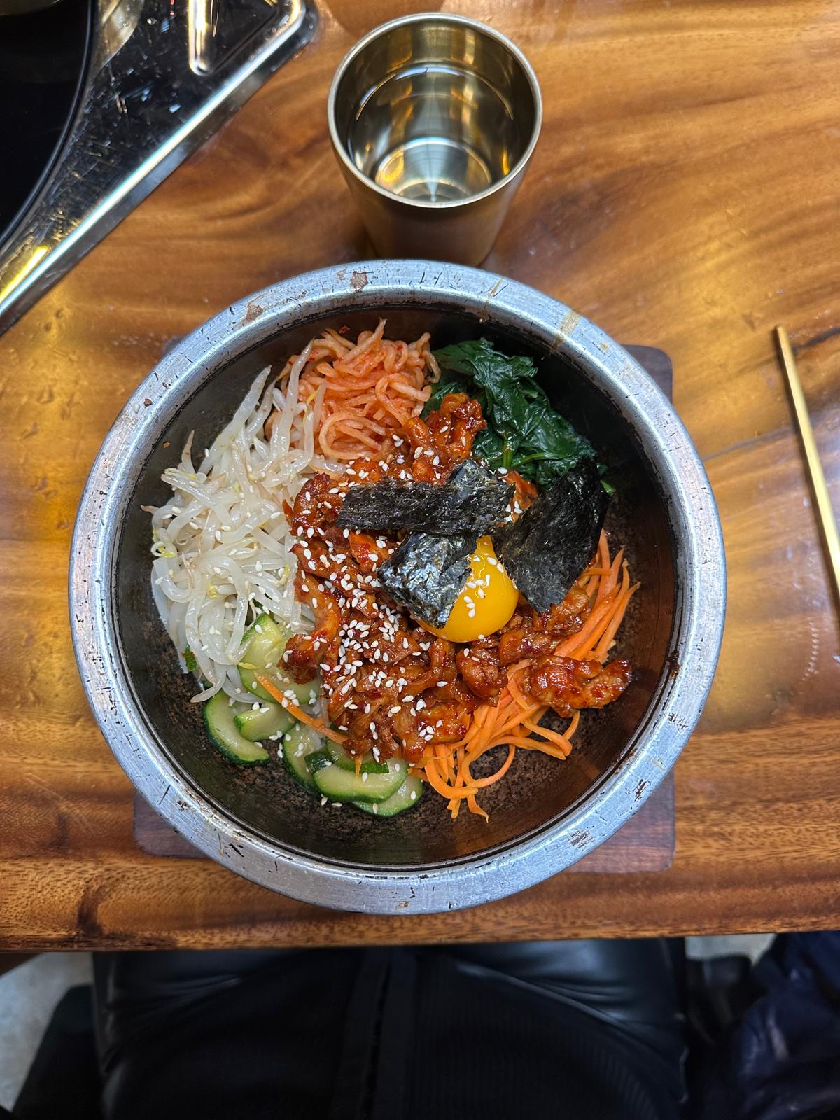 Bimbimbap au poulet très correct et très copieux (indiqué épicé, ne l’est pas du tout) en revanche grosse déception sur les pickles d’un niveau très moyen en comparaison à d’autres restaurants coréens authentiques. Thé au gingembre et au miel IMBUVABLE tant il était sucré (ce que j’ai indiqué à la serveuse qui n’a proposé aucune solution). Si vous êtes amateurs d’authentique cuisine coréenne, d’autres options s’offrent à vous.