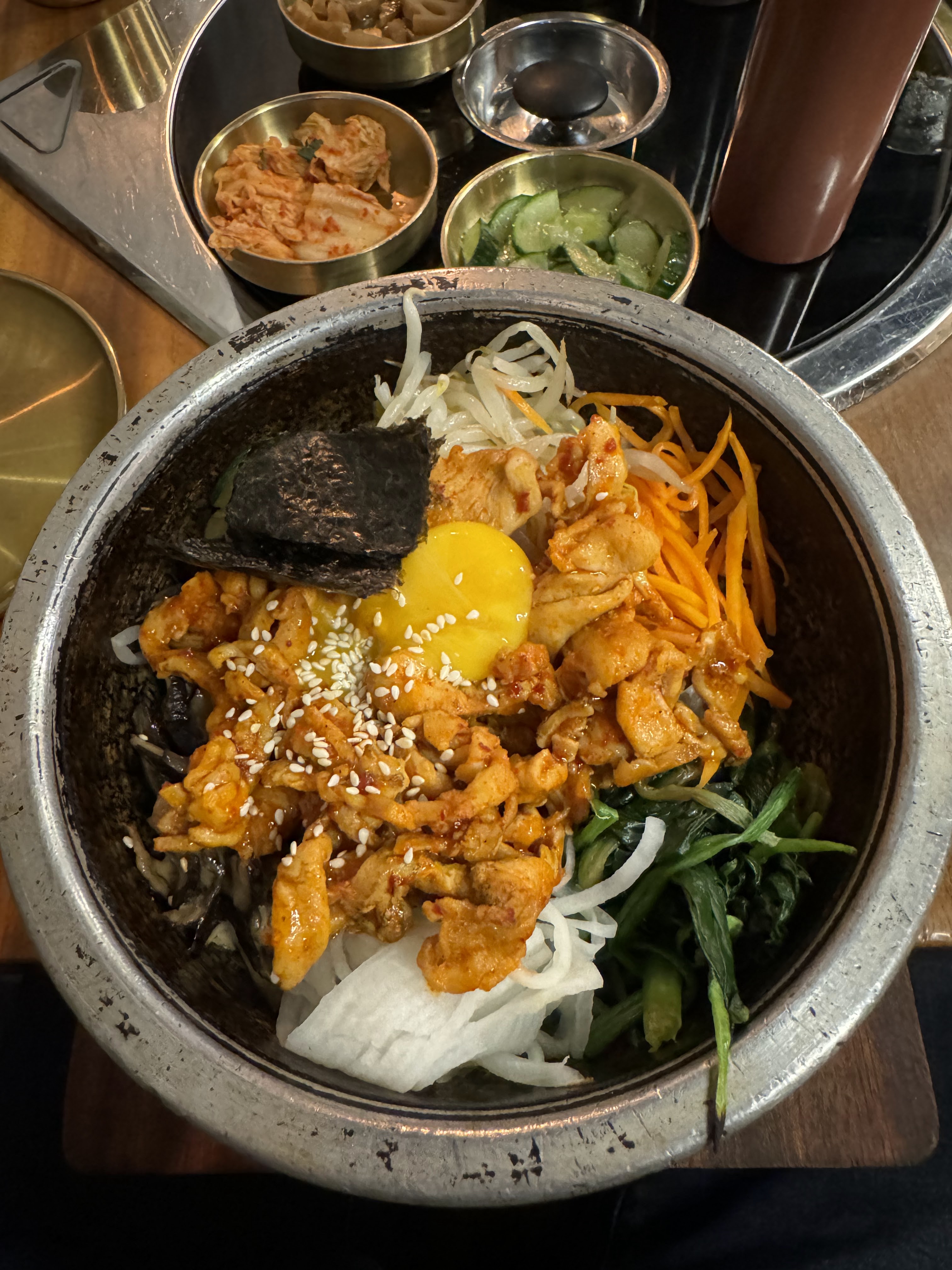 Bimbimbap poulet épicé + thé glacé prune maison Super bon Vrai régal Vaut le détour Accompagnements à volonté et peuvent être demandés sur préférence. Le radis mariné est sucré et a presque un goût de bonbon, ce que j’aime beaucoup personnellement. Service rapide efficace et cordial Les thés “glacés” ne sont pas précisés sur la carte. Il faut juste le préciser à la commande parmi les thés chauds. Celui à la prune est vraiment très bon !! Très suave. Pas fan de la musique pop de restaurant mais je reviendrai quand même. Merci à tous les serveurs !