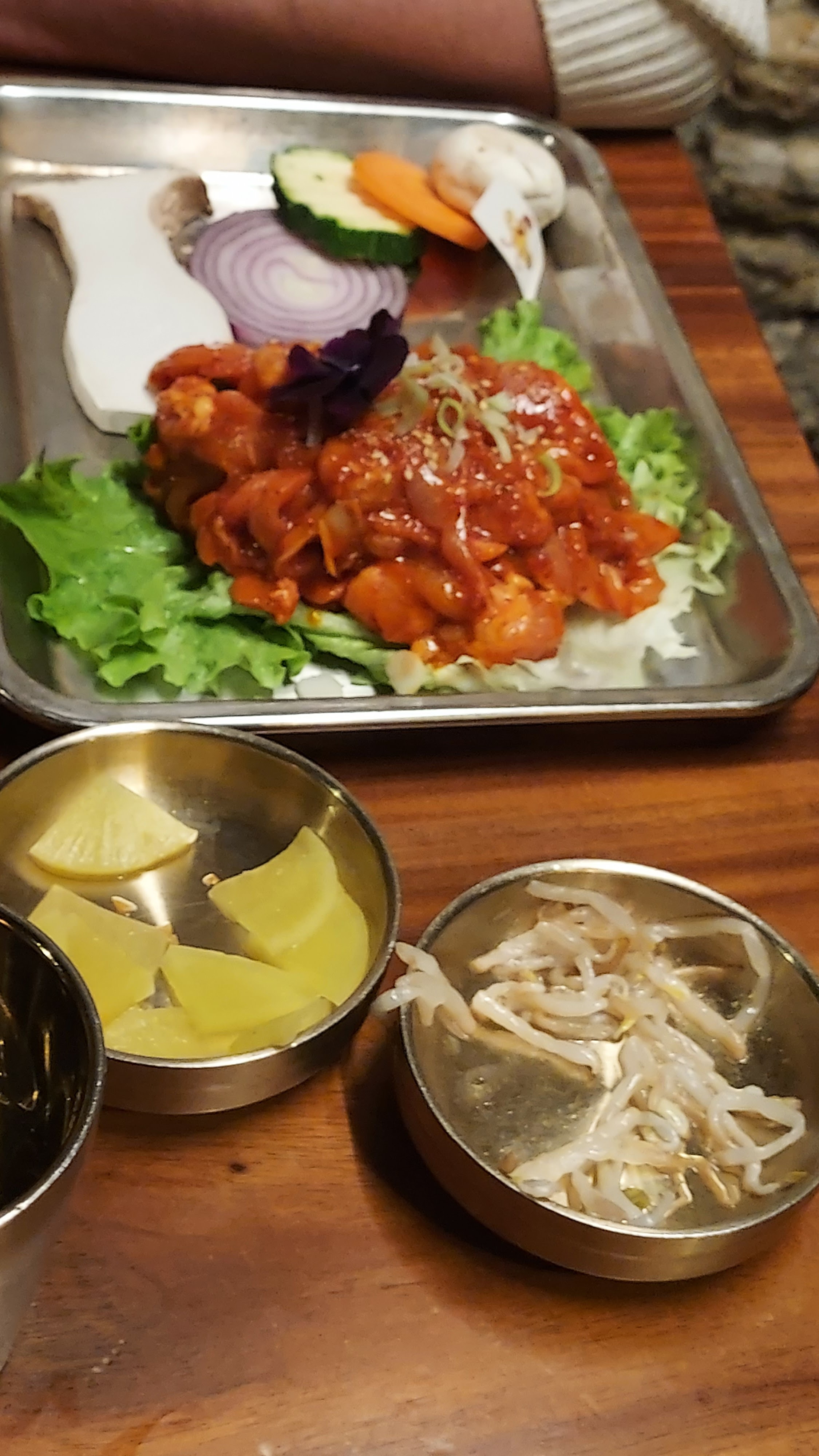 Nous avons essayé le bbq coréen avec 3 protéines différentes : calamar pimenté, poulet pimenté et bœuf pimenté. Le tout est accompagné de petites amuse-bouches telles que du kimchi, des pousses de soja ou encore des tranches de concombre. Ce fut étonnamment bon, le prix est abordable et les portions sont copieuses. Les amuse-bouches sont illimitées. Le personnel est à la fois très professionnel et chaleureux. Le cadre est sympathique également.