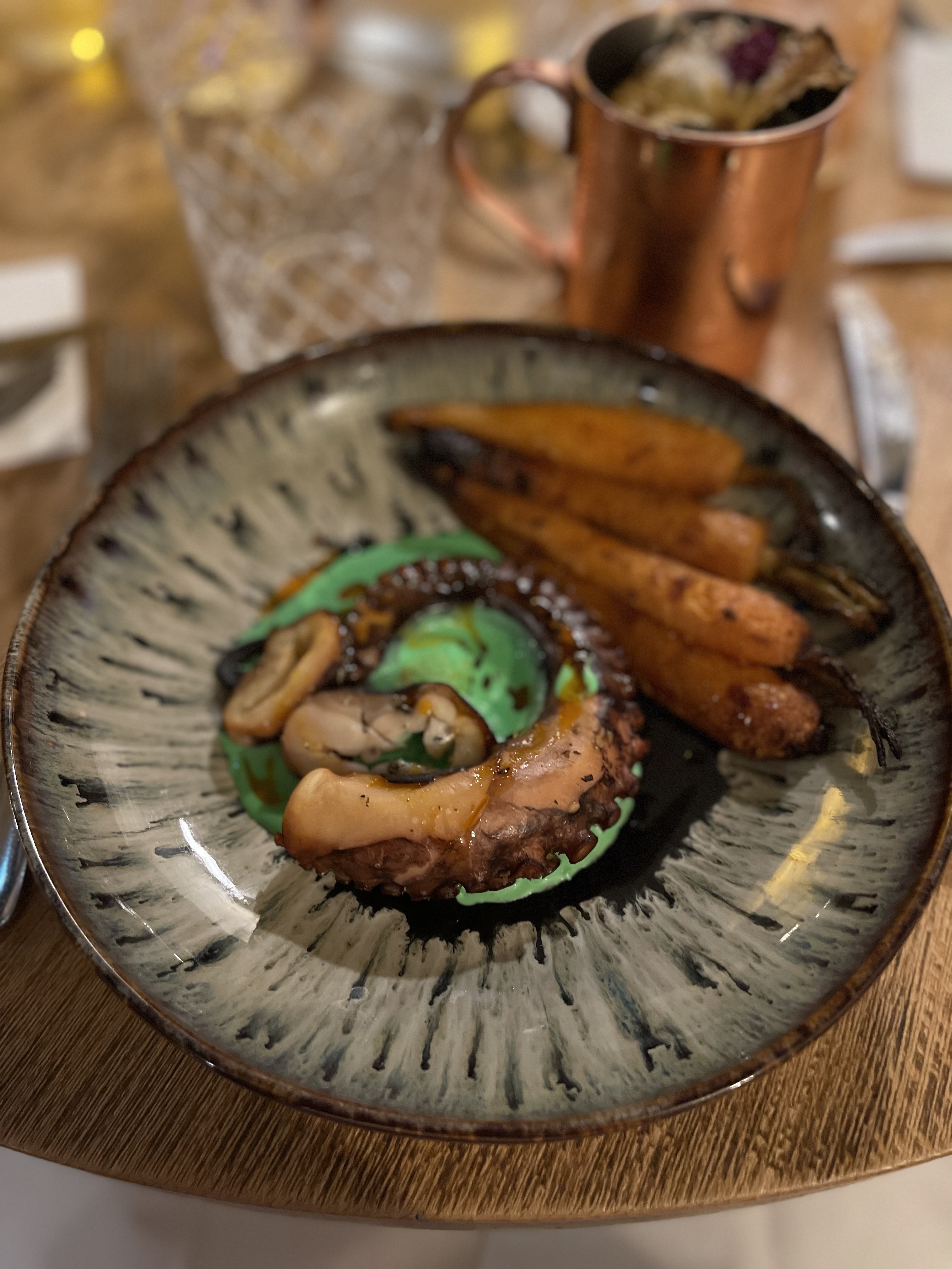 Beaucoup trop délicieux ! Des associations de saveurs recherchées sans pour autant être trop tarabiscotées. J’ai adoré la tendresse du poulpe avec l’association d’une sauce au pandan. Service impeccable, restaurant chaleureux. Je recommande.