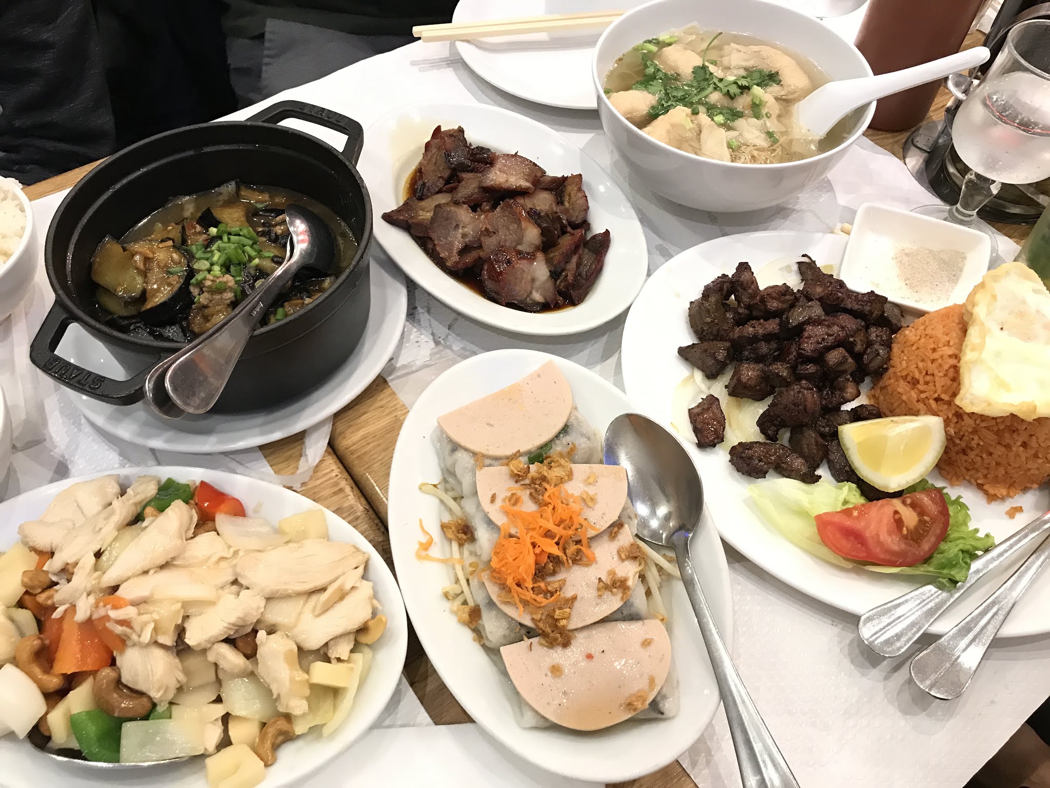Nous sommes venus spécialement pour manger un loc lac boeuf car le restaurant ou nous allons d'habitude était fermé. Pas mal mais viande trop cuite. Nous étions 4 et aucun plats n'ont été servis en même temps (service rapide mais plats tièdes). Les tables n'étaient même pas dressées. Le service n'est pas de qualité non plus. La soupe de ravioli était bonne même si les nouilles un peu fade. Néanmoins plats copieux