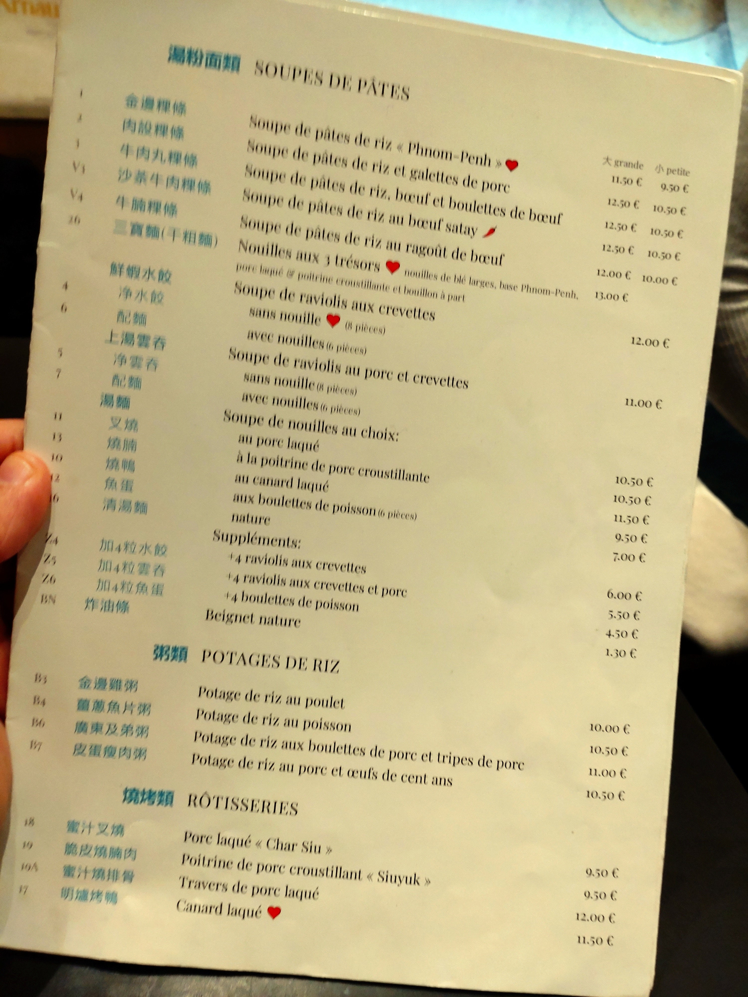 Cette cantine propose un grande variétés de plats vietnamiens, cambodgien et chinois. Les plats sont bien cuisinés. Les tarifs très corrects. Mais énorme bémol, la salle principal est très bruyante. Et même très tard (ca ferme à 2h du matin), il y a encore beaucoup de monde. Edit novembre 2018 : la carte a été revue, pas mal de plats ont été supprimés. les prix aussi, il me semble, ont changé, ils ont légèrement augmenté. Mais le pire c est que certains plats sont servis sans aucun légume. Par exemple, le riz 3 trésors, c est la 1ere fois de ma vie que je vois ce plat sans légume : riz + viande point barre. cf photos