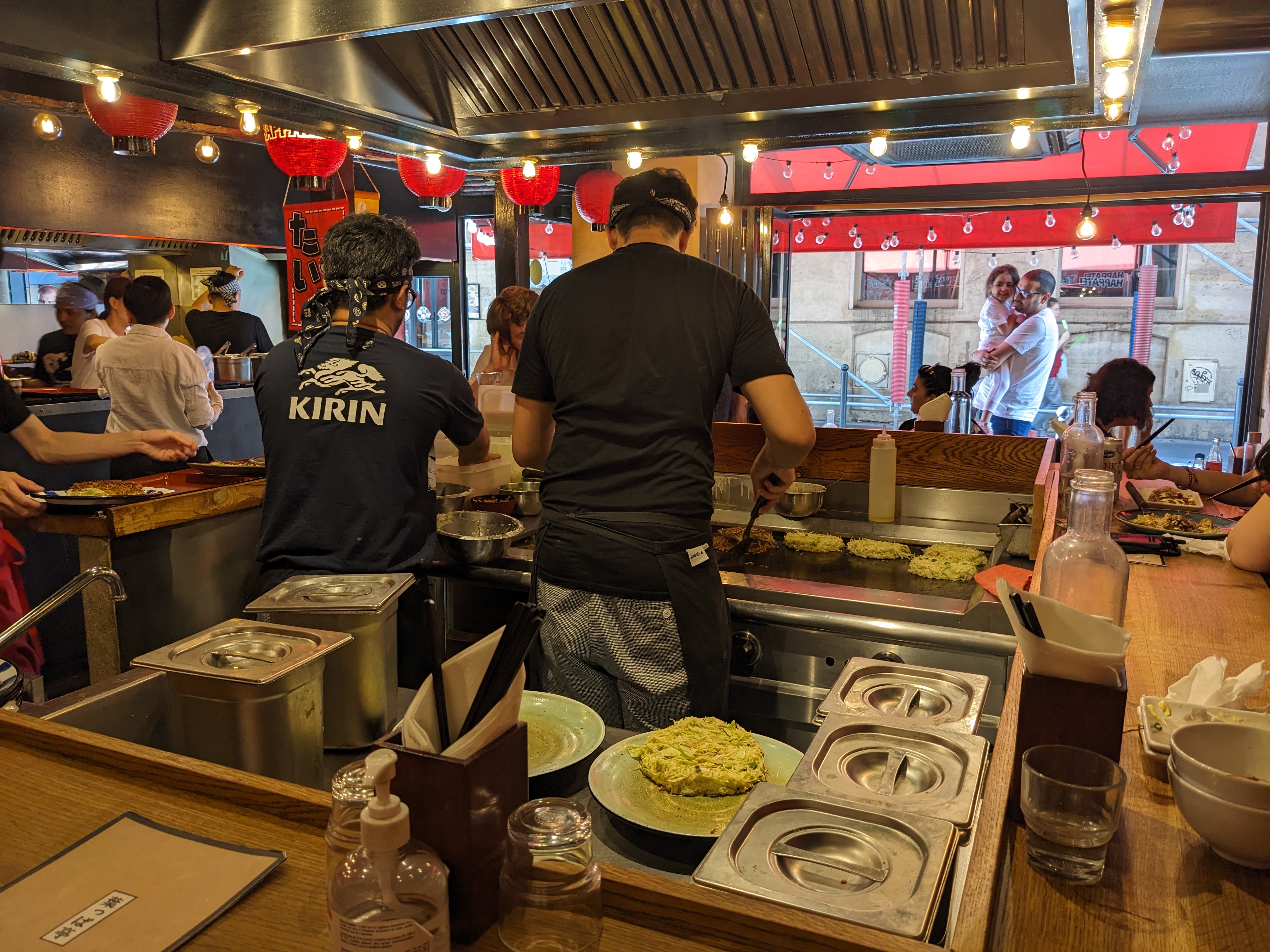 Le temps d'attente est un peu longue pour accéder au restaurant. Des tables étaient libres, mais le temps de débarrasser et d'installer les clients est assez long. Le cadre est sympathique, notamment si l'on est assis au comptoir pour le show des okonomiyaki. Les portions sont plutôt généreux. Les takoyaki sont très bons très bons également.
