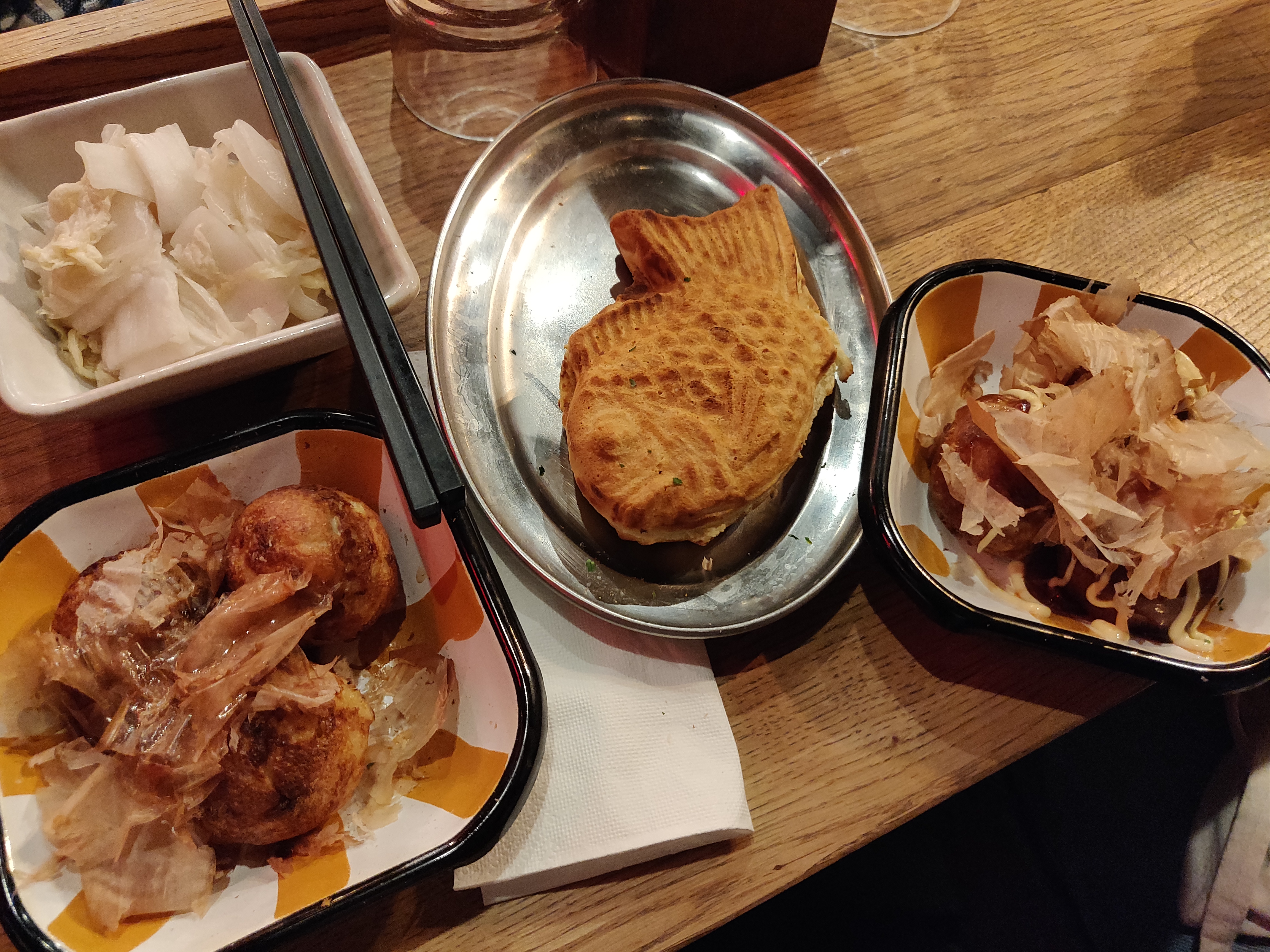 Takoyaki un peu trop coulant à mon goût mais j'ai adoré l'Okonomiyaki (porc). Taiyaki matcha plutôt chouette. Je reviendrai :)