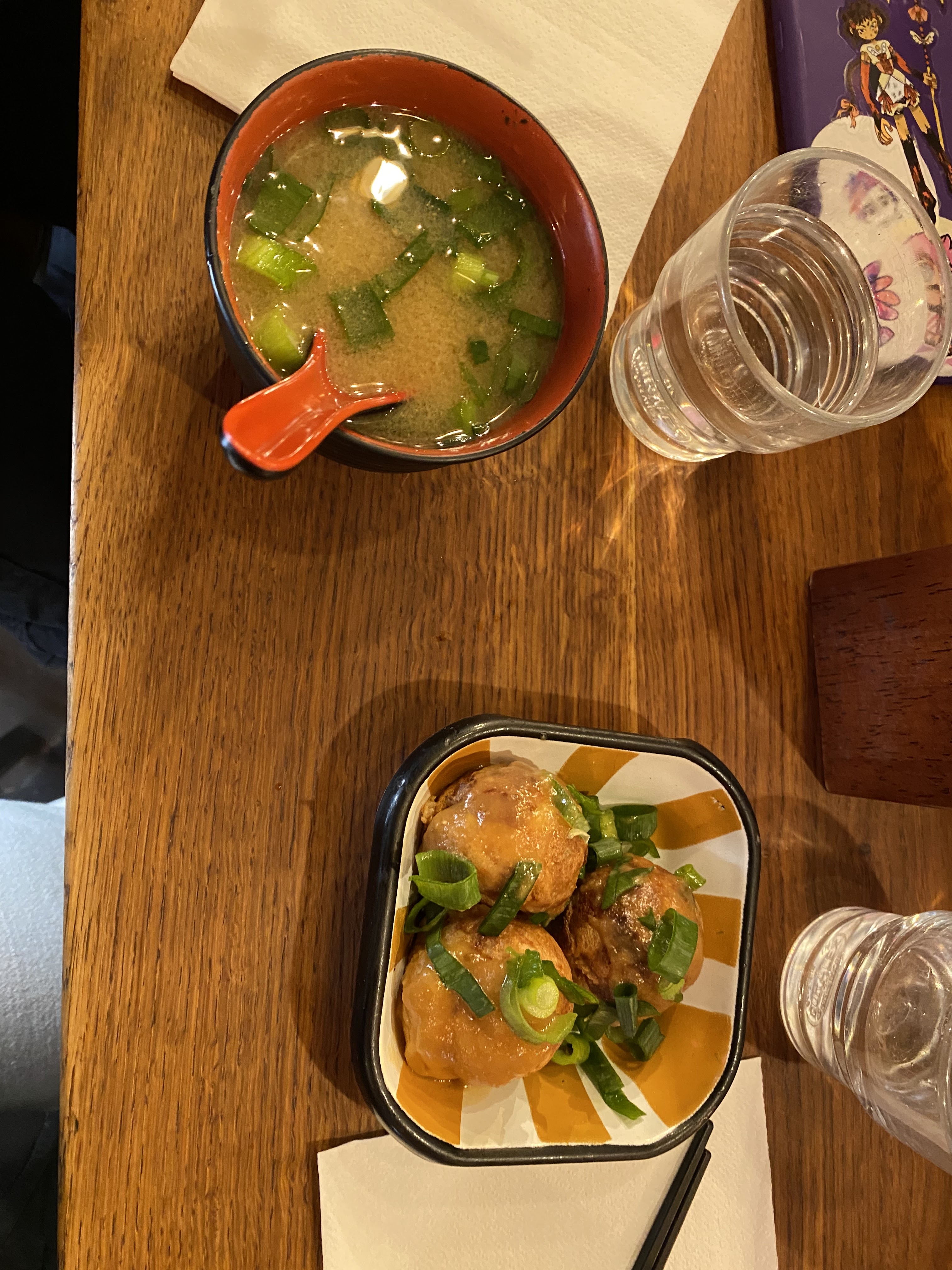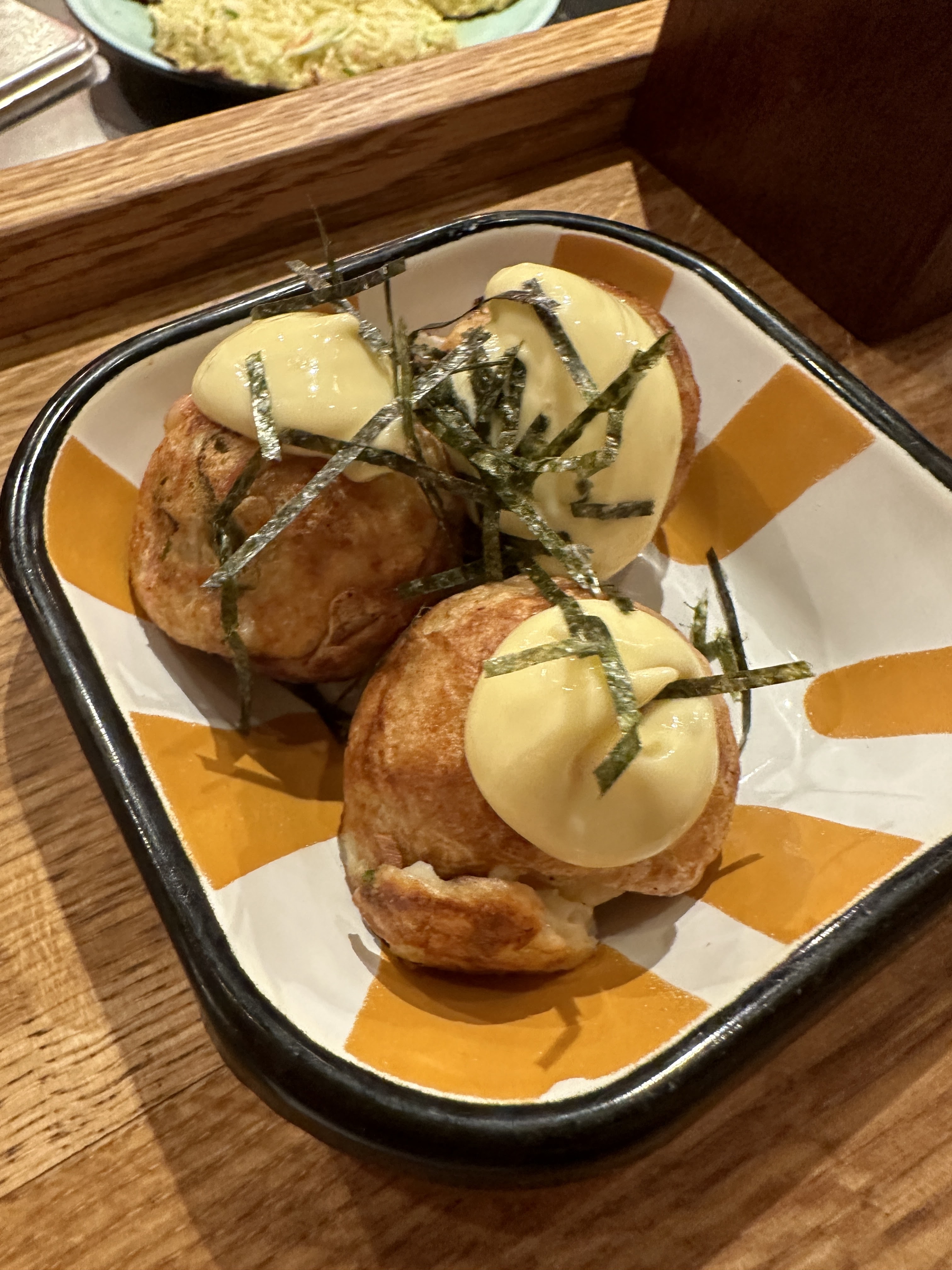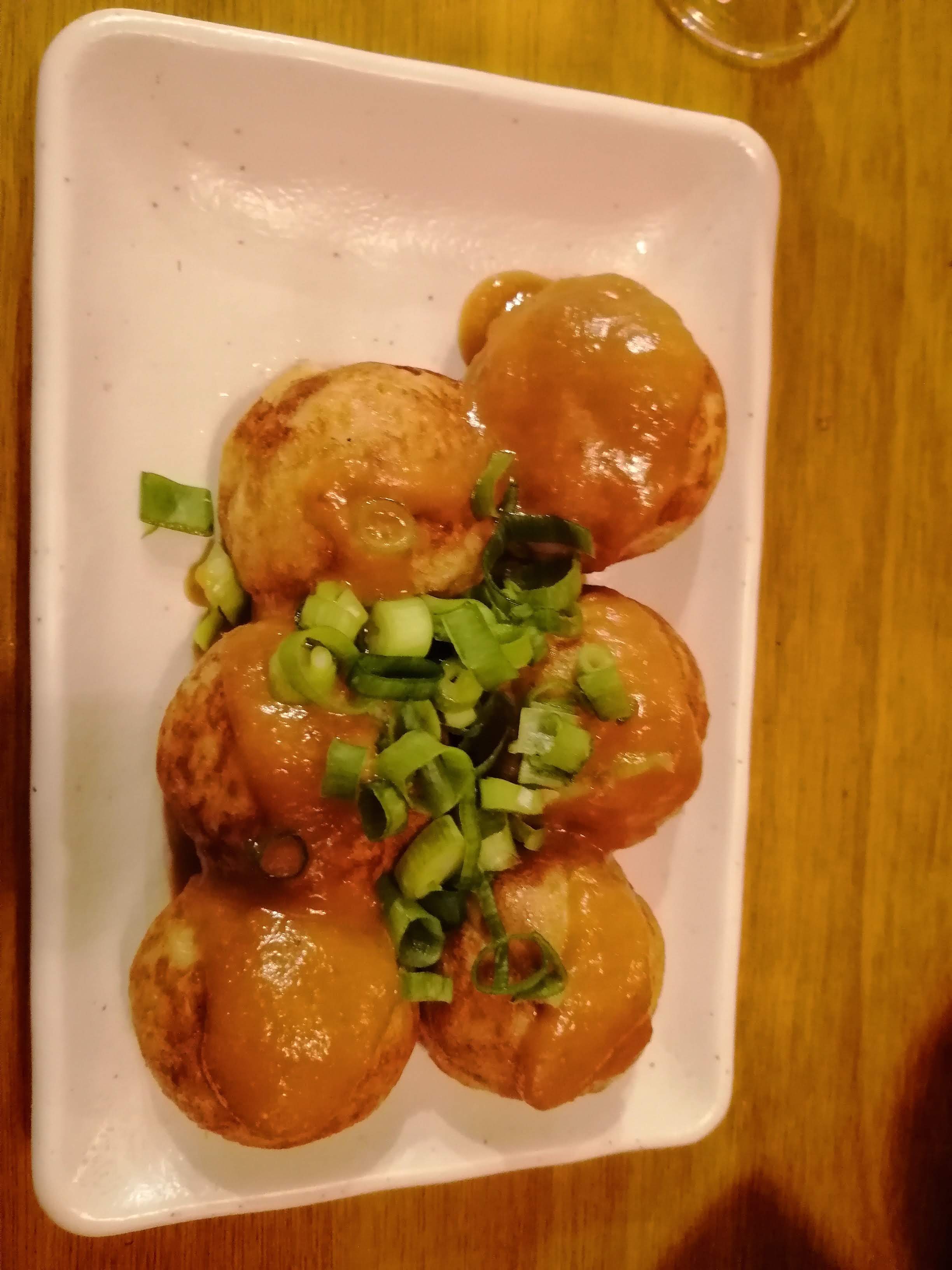 Super découverte! Nous avons pris un mix de boulettes de crêpes (mayonnaise yuzu ❤️ et sauce ciboulette) au poulpe et une salade de concombres. Service rapide. Le restaurant n'est pas très grand donc se remplit rapidement...