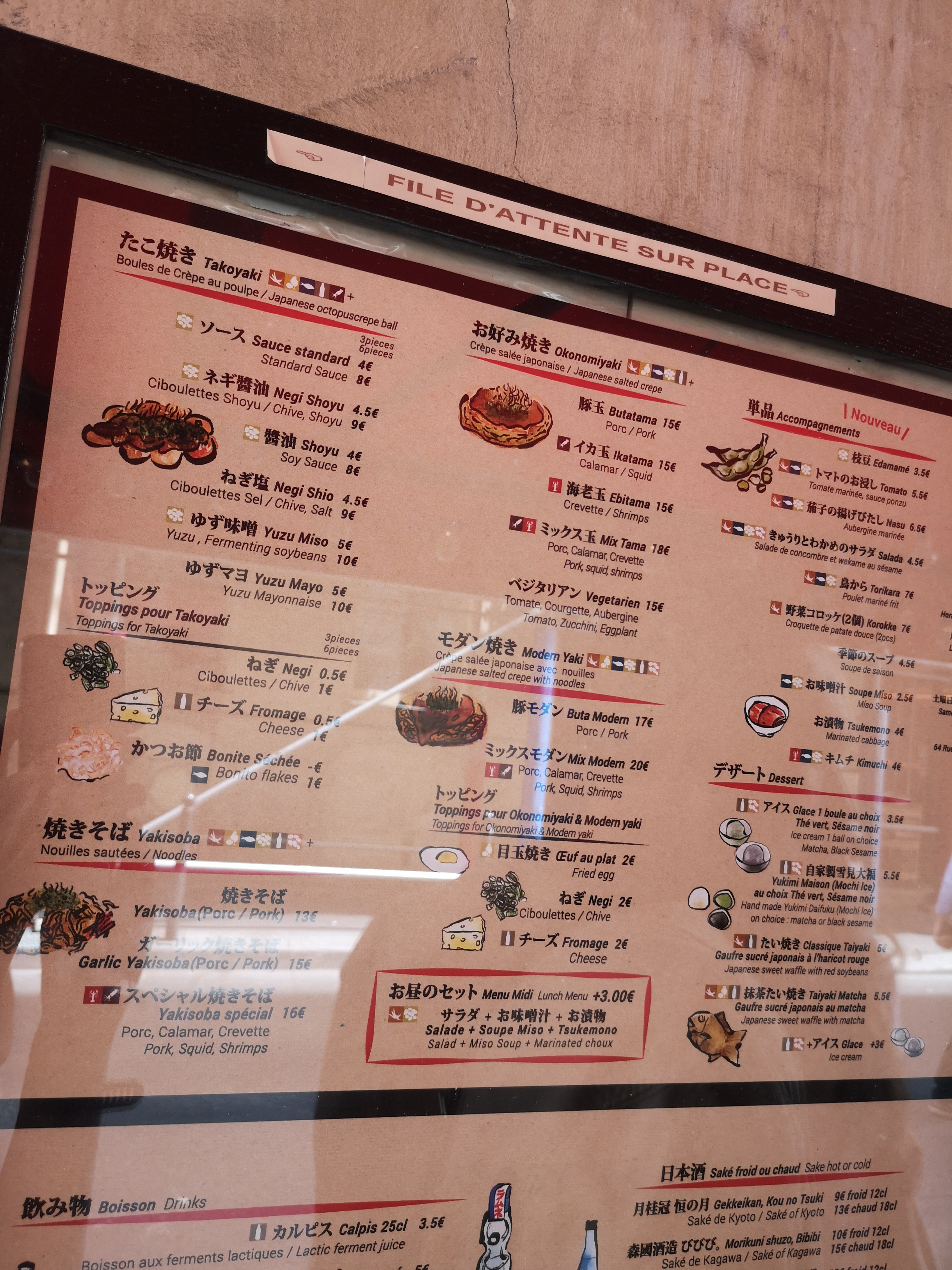 Il faut attendre un peu pour rentrer car ce n'est pas très grand. Sinon j'ai testé pour la 1ère fois les takoyakis et okonomiyaki au porc. La mayonnaise au yuzu est une tuerie ! Très bon :)