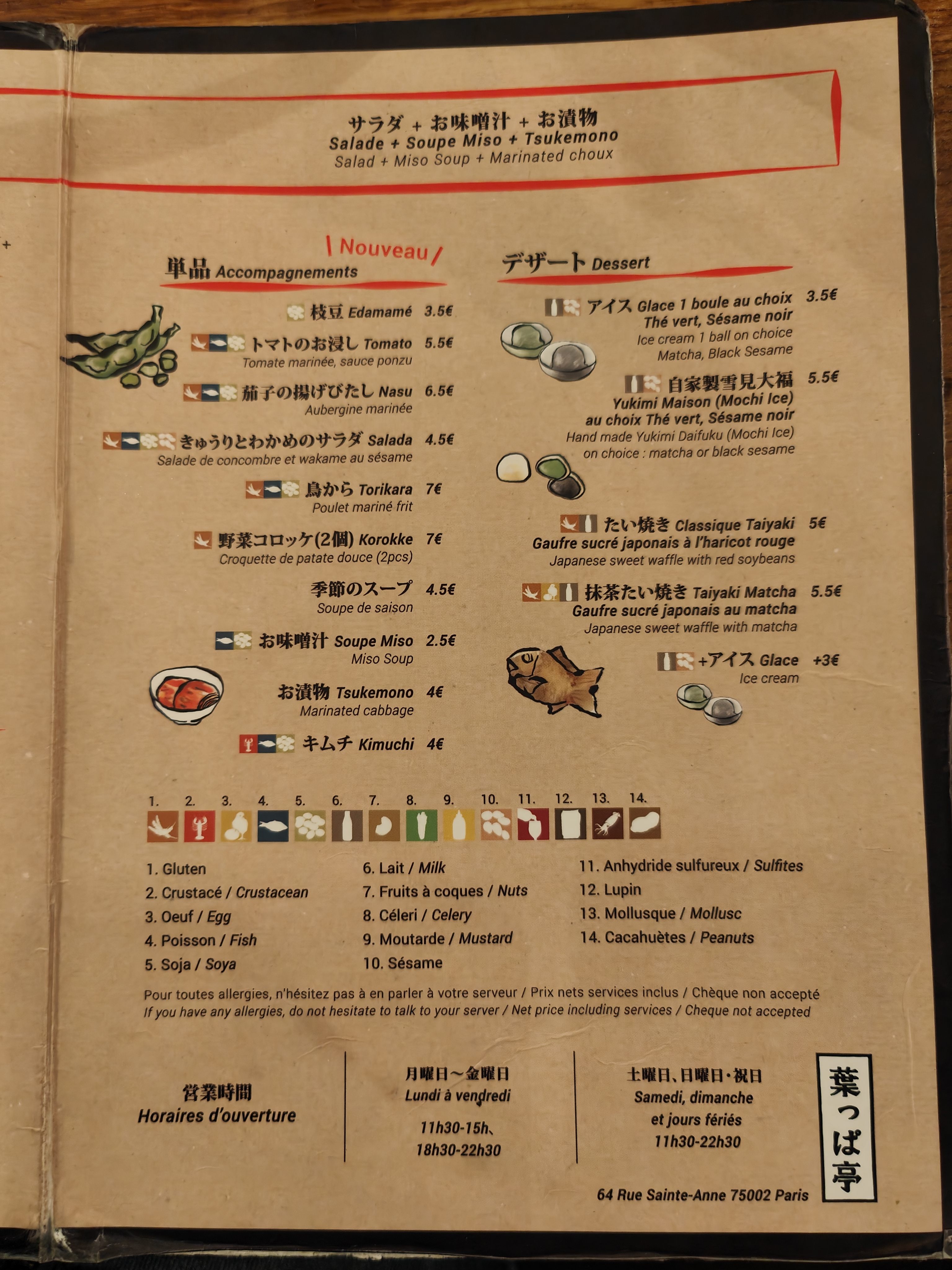 Prix : 19,5€ pour les deux plats sans boisson que vous voyez sur les photos. C'est copieux ! Peut-être un chouïa cher, mais les assiettes sont excellentes. Les produits sont frais, et la carte est typiquement japonaise. En plus sans réservation, on a réussi à avoir 8 places ! Mais allez-y à l'ouverture pour ne pas embêter le restaurateur et les autres clients, car il y a quand même une file dehors à partir d'une certaine heure.