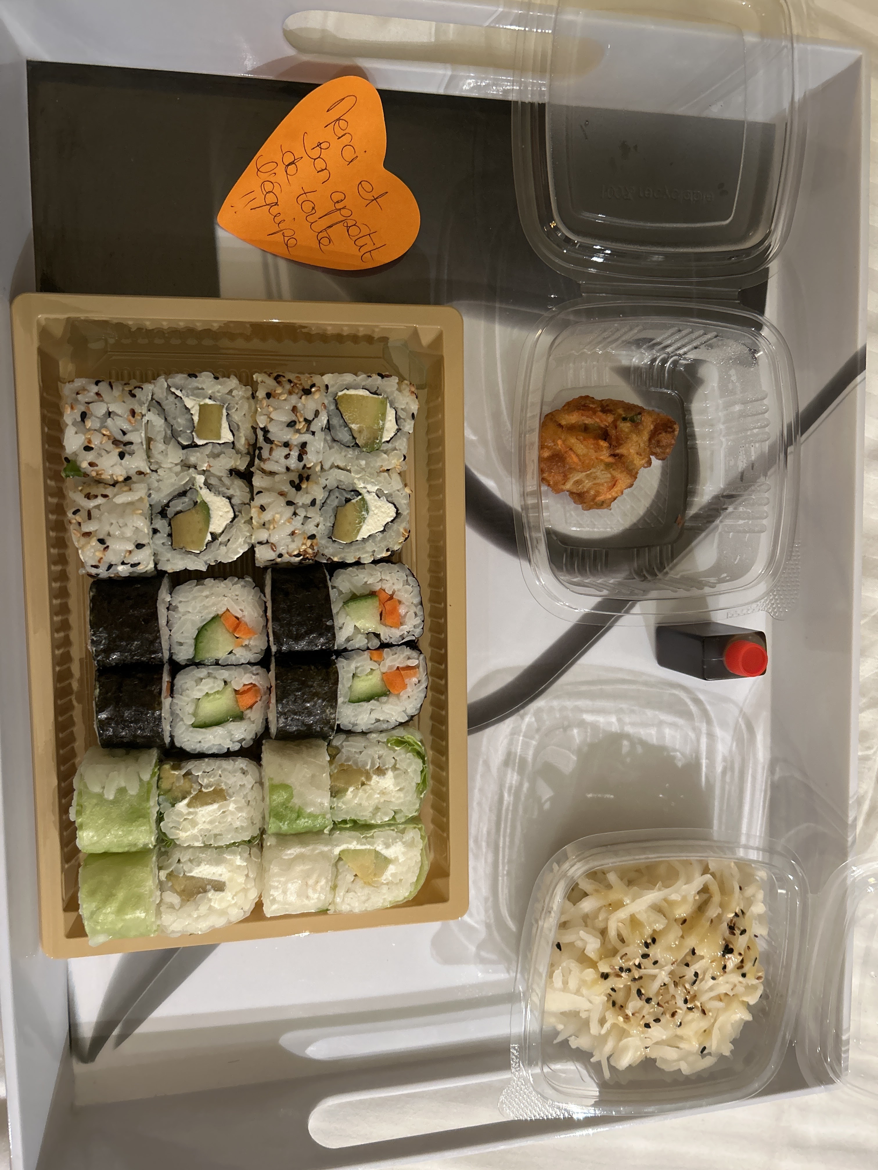 Trop bien ! Sushis super bon ! Avec un petit truc en plus que je n’avais pas commandé. Merci beaucoup!!!