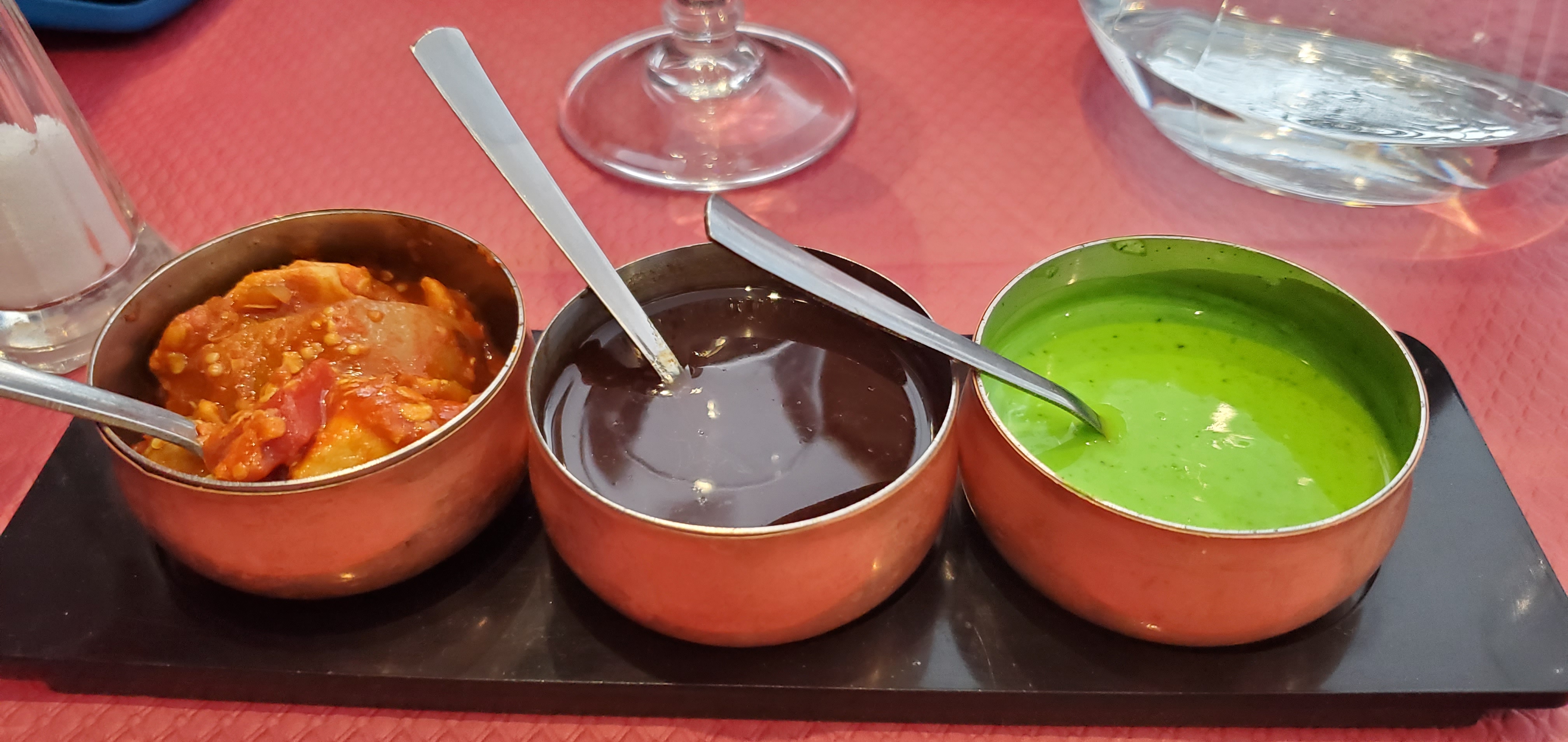 Après avoir mangé beaucoup de fromages et de viandes français pendant toutes les vacances, j'ai ressenti le besoin d'un curry décent. HP n'a pas déçu, des plats parfaitement parfumés tout au long du repas. J'ai eu des bahjees à l'oignon, du samosa aux légumes et un madras au saumon. Le saumon était parfaitement cuit, pas aussi chaud qu'on pourrait s'y attendre dans un madras britannique (apparemment, ses débuts pour la cuisine française et indienne), mais vraiment agréable et savoureux. Famille de 4 personnes nourrie avec 2 plats (les enfants avaient 3 sorbets mangue) pour 110 €. Garé dehors, parlant anglais. Je le recommande vraiment.