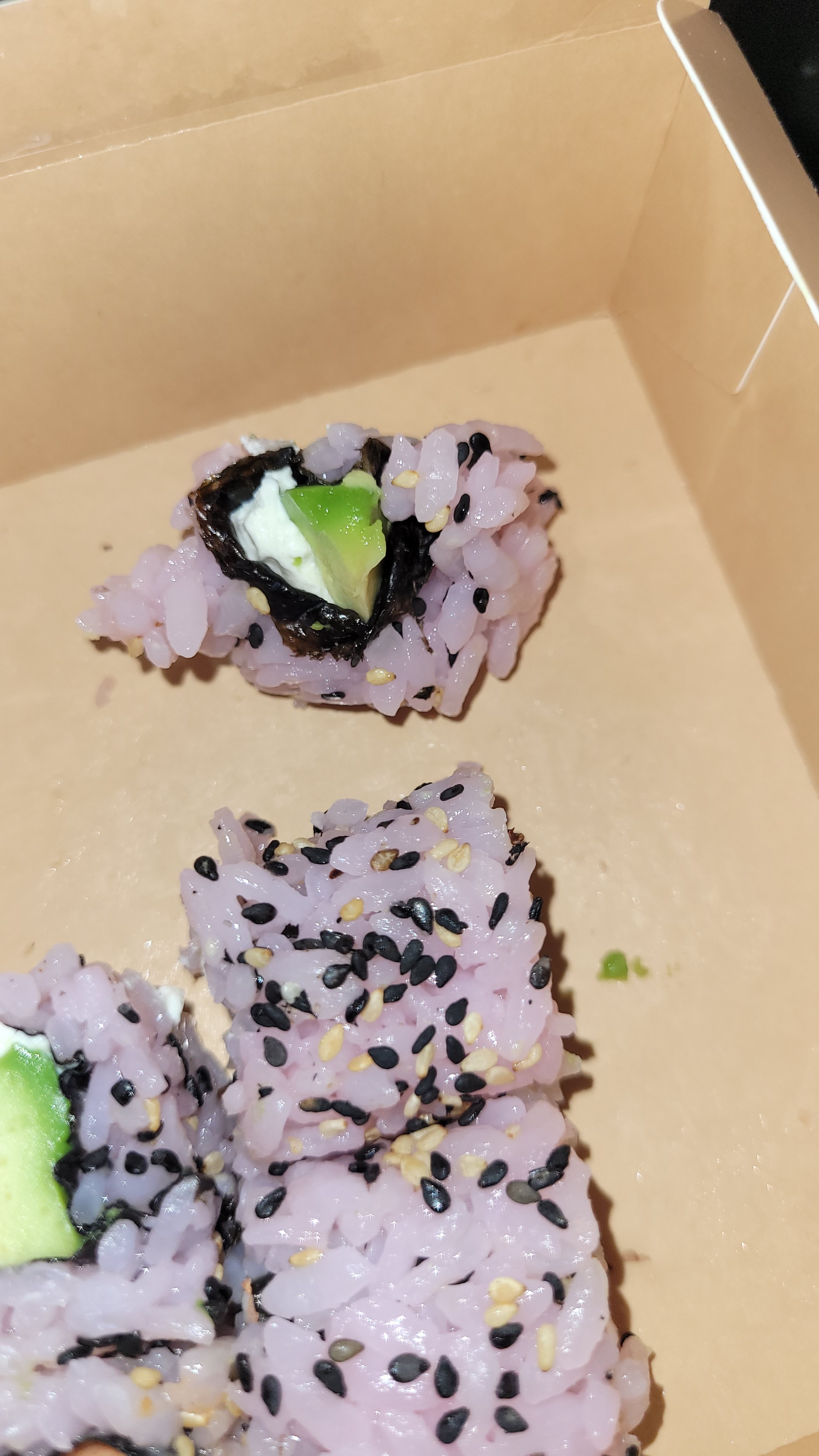 Les sushis sont de qualité et frais. Très bon rapport qualité prix. Quant à la couleur du riz : c'est une coloration avec de la betterave. Si vous aviez connu Haru Sushi dès l'ouverture, vous auriez eu la référence. C'est LA signature Haru Sushi.