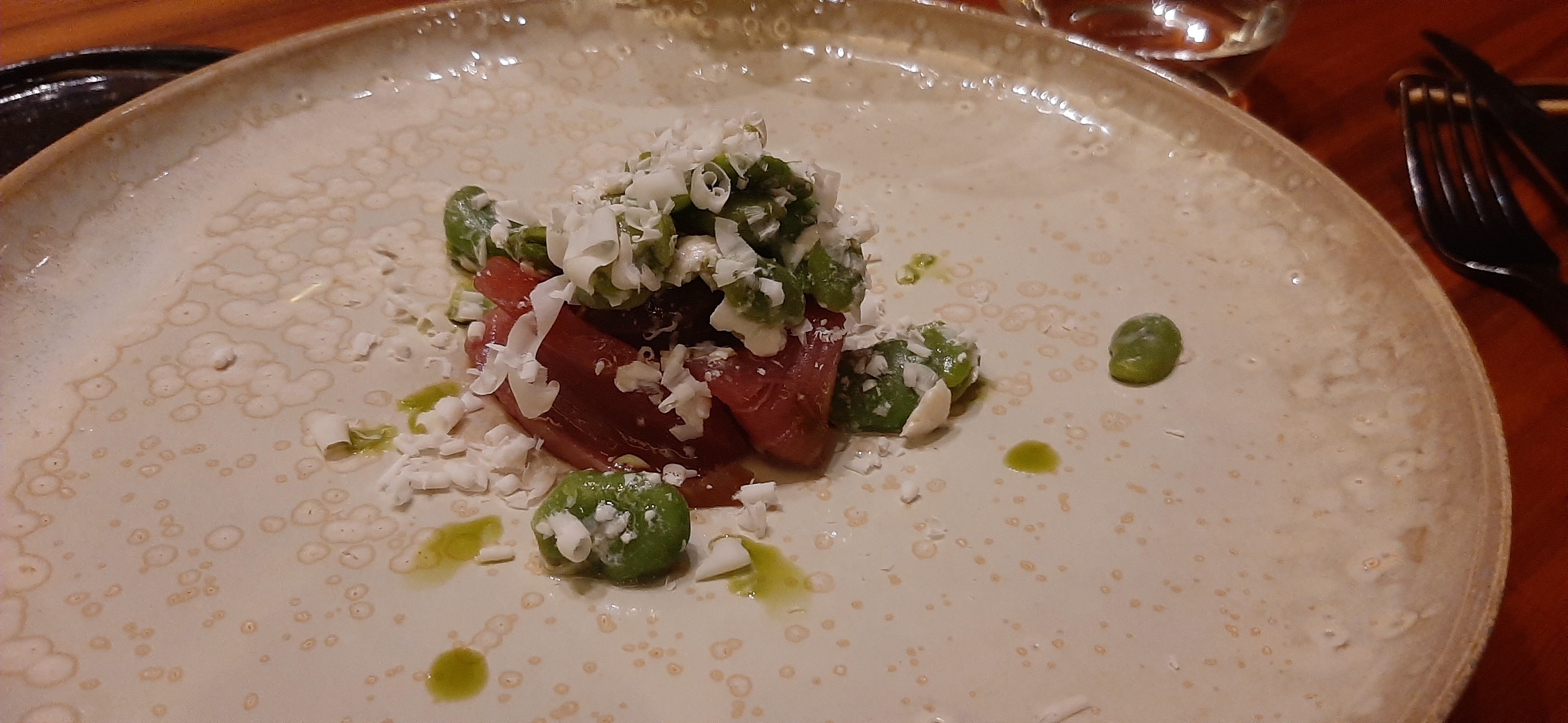 Avis mitigé sur ce dîner assez hétérogène. Très beaux plats qui donnent vraiment envie et qui subliment de très bons produits comme l asperge et le thon. Mais grosse déception sur d autres plats comme la daurade maturée dont la cuisson et la saveur laissent à désirer ou le céleri dont le parti pris ne m a pas transporté. Quant au vin : conseil très étrange qui n allait pas avec la majorité des plats. Il est à noter que le sommelier n était pas présent et le chef sans doute absent ce soir. Service très long (4h) mais sympathique et salle très froide… dommage
