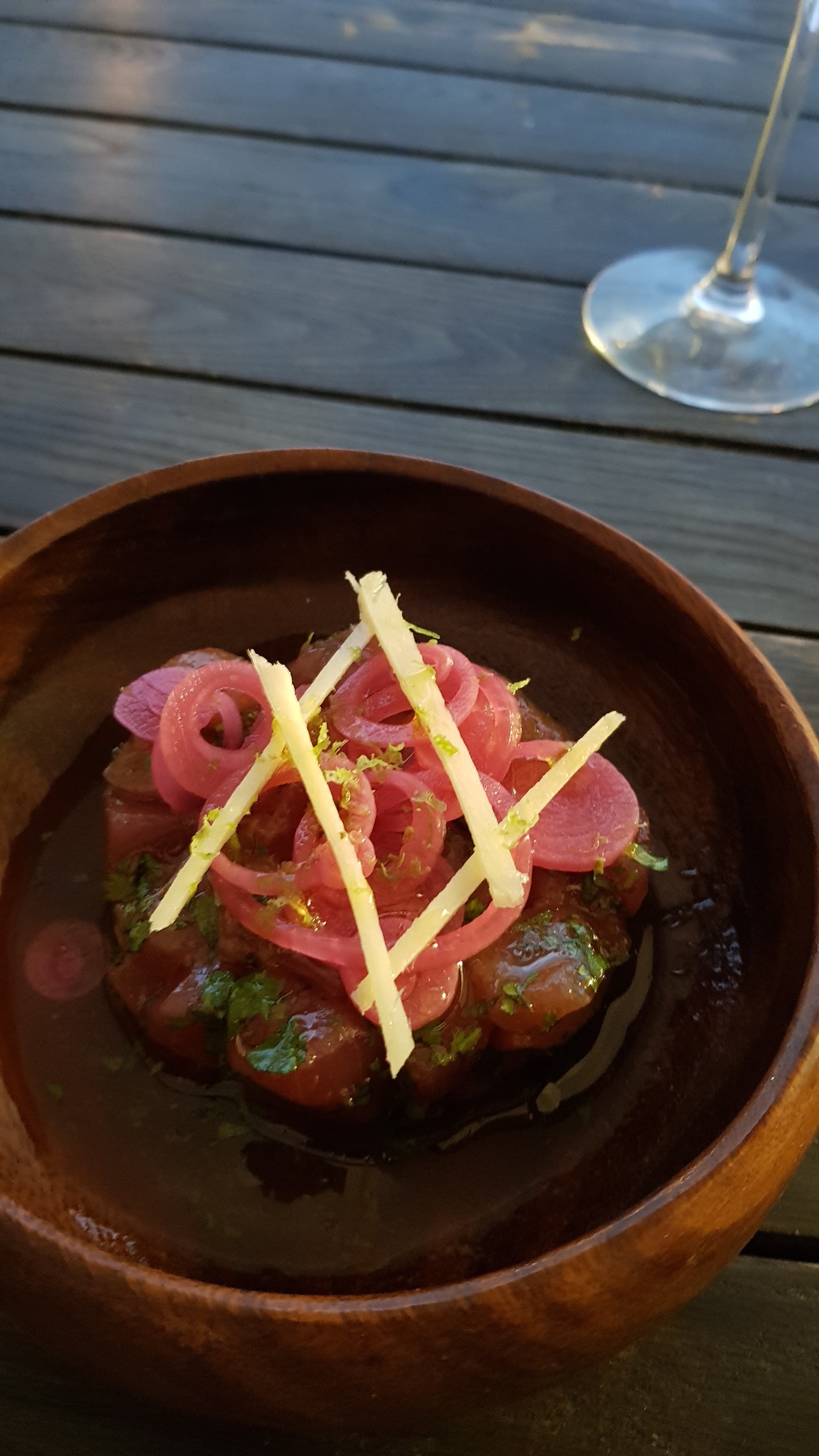 Je vais commencer par le positif : Bien que très petites, les entrées étaient vraiment bonnes. Beaucoup d'options de boissons, le vin était vraiment bon et le cocktail vierge était super. Le serveur était très gentil. Ce que nous n’avons pas aimé : Les portions sont vraiment petites, on pourrait penser qu'une entrée et un plat principal suffiraient mais nous étions loin d'être rassasiés en partant. Aucun plateau de fromages disponible et je ne pouvais pas manger de dessert car je suis diabétique et pas de salades d'accompagnement. Le menu est très limité, 3 entrées et 3 plats principaux, un seul plat était de la viande, tous les autres étaient du poisson donc on commence par du poisson et on termine ensuite par du poisson. L'un des plats était un tataki de thon, il nageait dans une mer de sauce soja extrêmement salée, j'avais déjà mangé ce plat dans d'autres restaurants et je l'ai vraiment beaucoup aimé. Et malheureusement, il n'y avait pas de bouteille d'eau disponible. Je pense que le restaurant a du potentiel mais les accompagnements (salade, pommes de terre, légumes) manquaient.