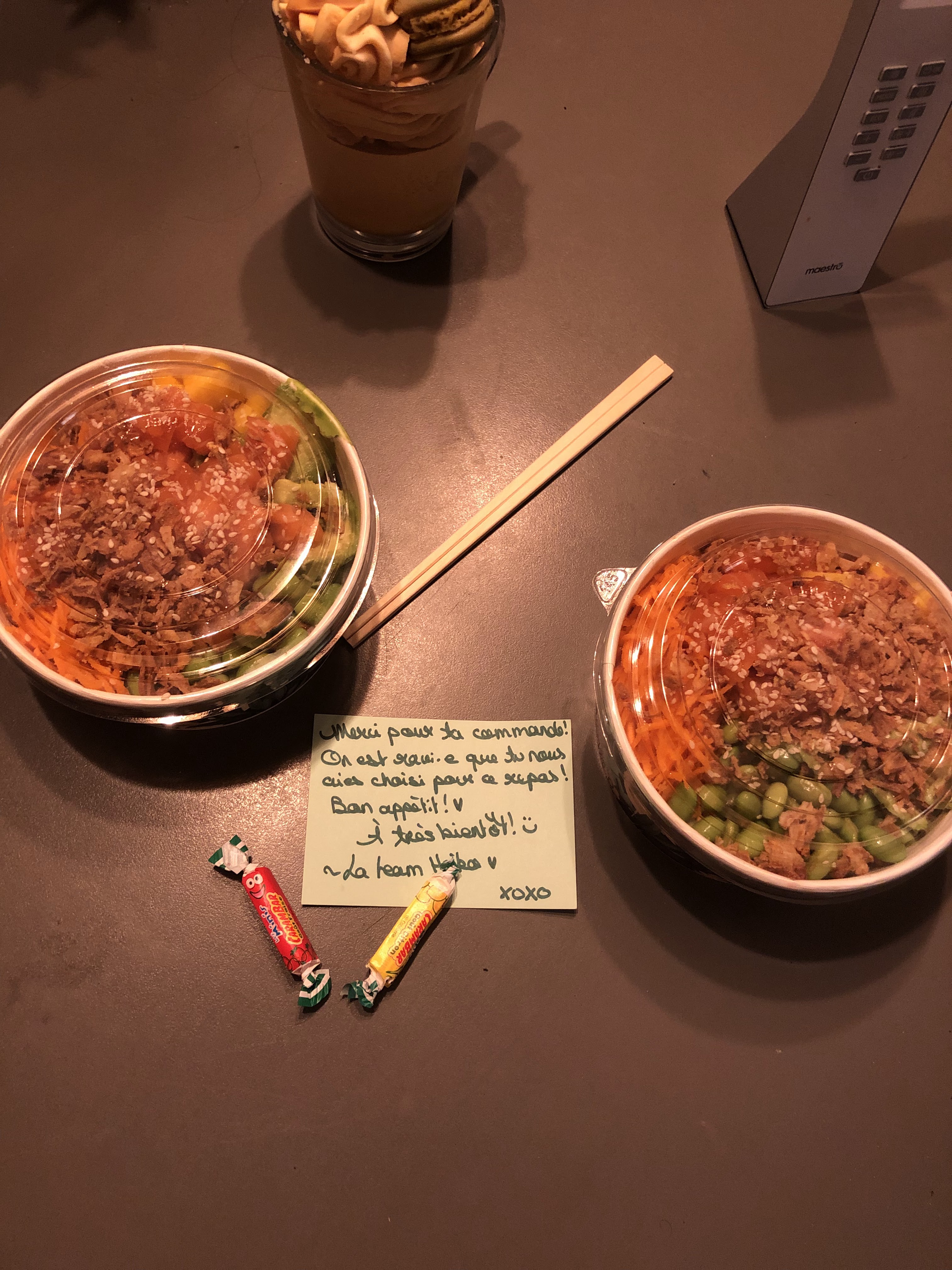 On commande très souvent ici ( c'est un bon moyen, quand on a pas le temps, de manger frais au lieu des autres choses beaucoup plus grasse proposées.) Je n'écris pas cette avis pour parler de mes habitudes alimentaires :) mais je veux vraiment remercier la personne qui mets des petits mots dans nos commandes c'est tellement plaisant et agréable merci. Ça remonte le moral je trouve :) :) :) Merciiii encore. (On ne l'a pas eu la dernière fois et c'est comme si il manquait quelque chose à la commande lol)