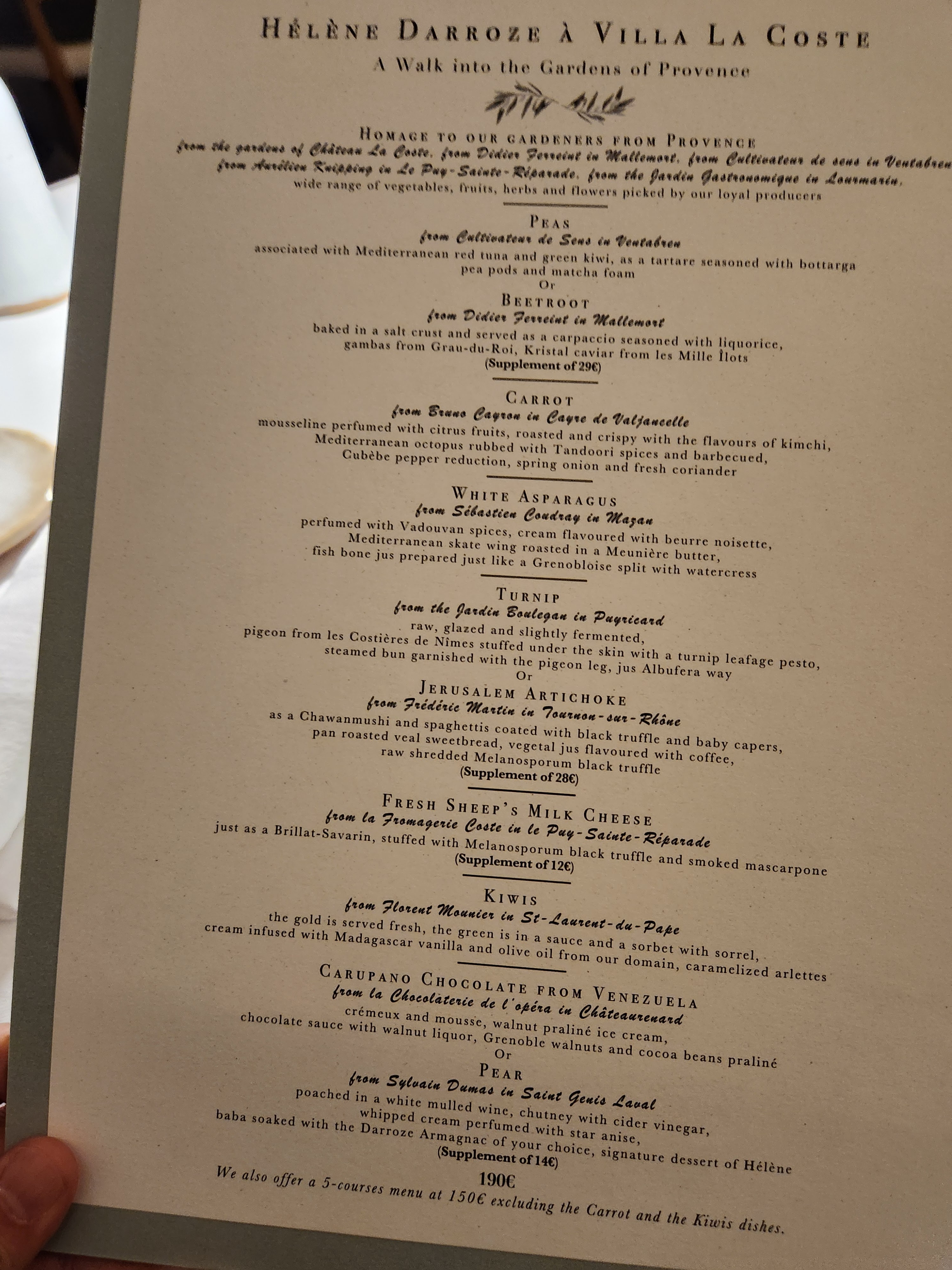 Un cadre exceptionnel, un service parfait et c’est à peu près tout! Bien que la proposition paraisse alléchante, une cheffe de renommée mondiale que l’on sait très exigeante l’on s’attend à un voyage exceptionnel. Énorme déception, une carte unique sur laquelle il faut ajouter un supplément. Des assiettes très peu garnies comme par exemple l’agneau dont la côtelette se mange en une bouchée! Impossible d’avoir le goût en bouche compte tenu de la furtivité du plat! Que dire du dessert dit « signature » pour lequel il faudra ajouter un supplément et qui franchement est d’une banalité déconcertante! Enfin, que dire du sommelier qui annonce un prix pour l’accord mets et vins, qui disparaît au milieu du service car il est tard et qu’au final le prix annoncé et facturé le double. Une étoile glanée sur la notoriété de Madame Darroz mais certainement pas sur les assiettes servies. Il y a assurément de bien meilleur table dans la région à commencer par le Saint Estephe a Aix en Provence.