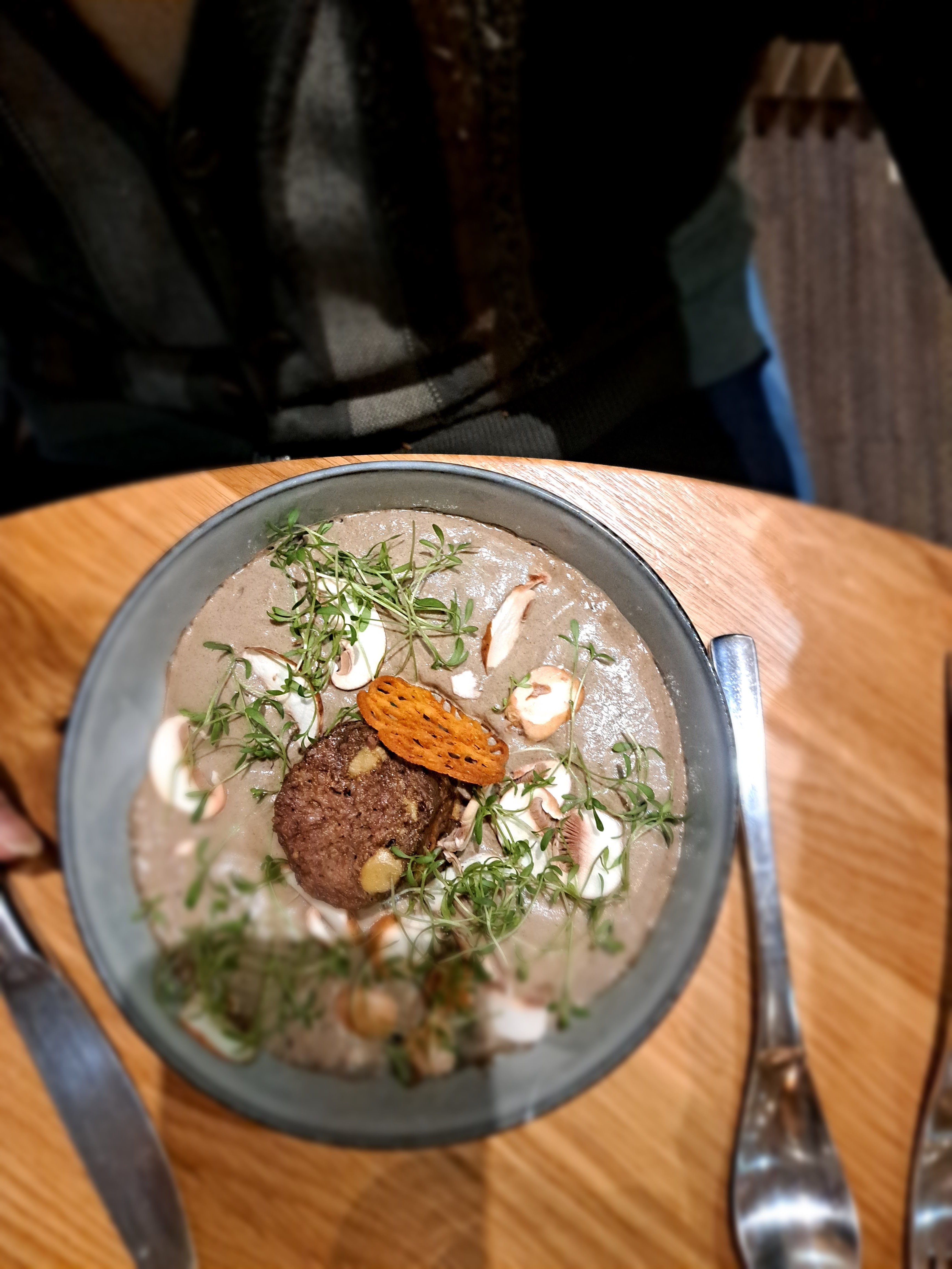 Nous avons apprécié un excellent déjeuner avec de la crème de champignons en amuse-bouche, une salade de betteraves rouges, des coquilles Saint-Jacques, du canard et du poulet local.
