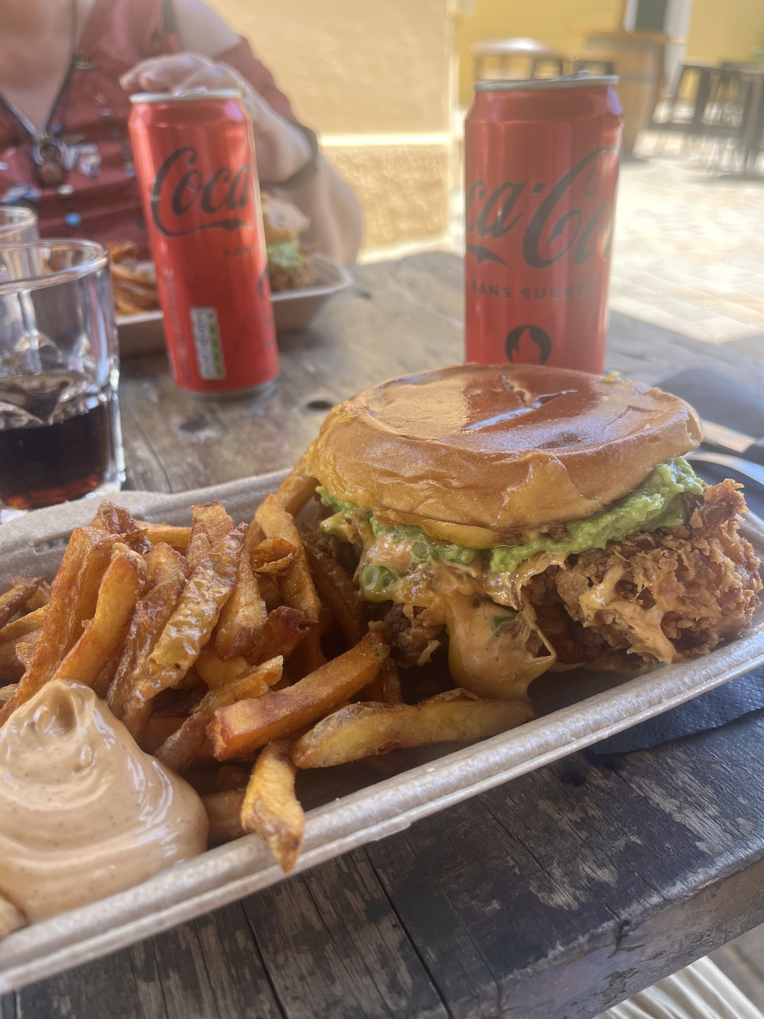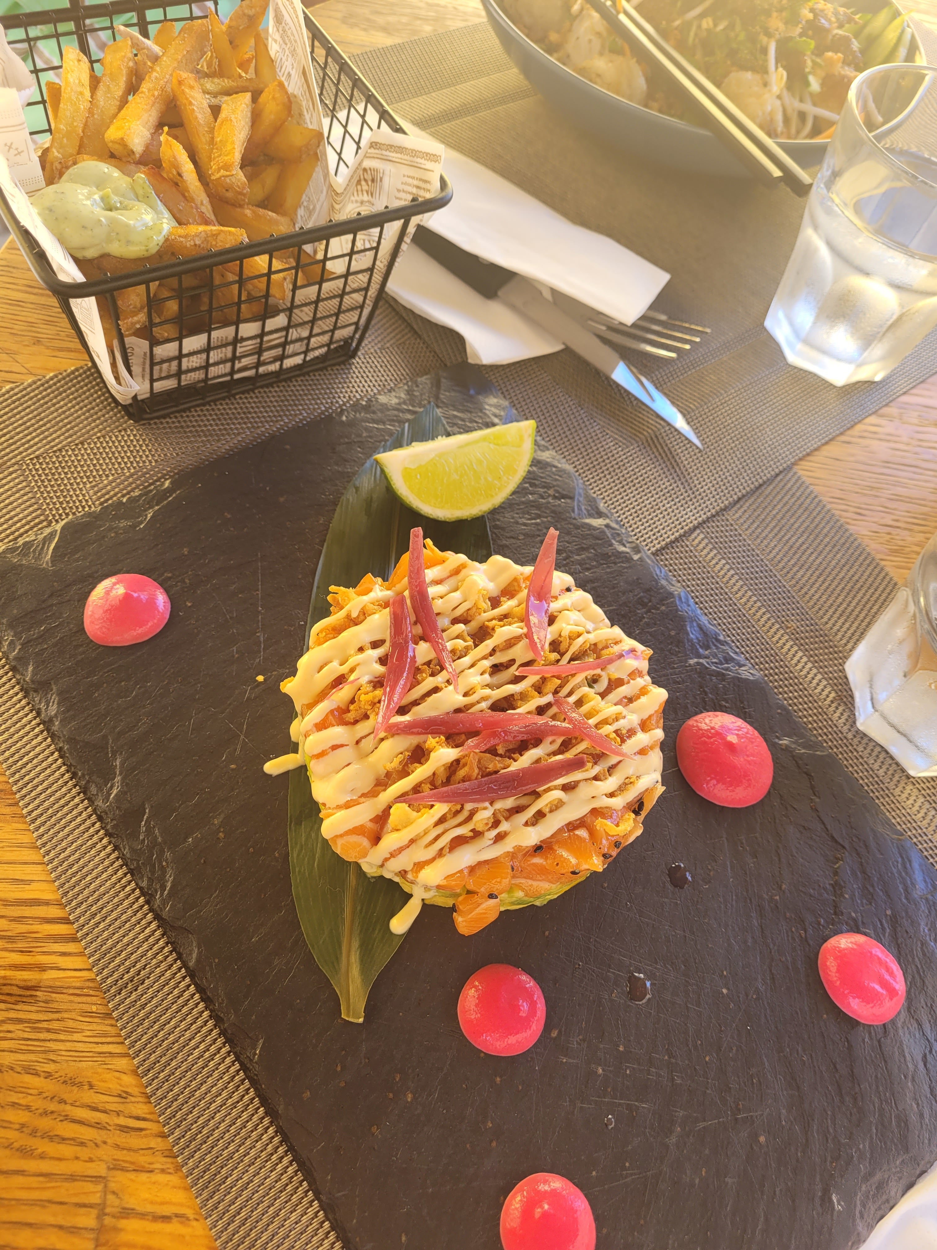 Un repas juste fantastique, j'ai pris un hamburger au poulet croquant mariné, simplement le meilleur hamburger qu'il m'est été donné de manger, pourtant on en trouve de partout, on commence à en trouver souvent des bons, mais là, c'était un tout autre niveau, le poulet était superbement préparé, fondant, des saveurs que je ne saurais décrire, la sauce maison était extra... Et ce n'était que le burger Ma compagne a pris un tartare de saumon, sur lit d'avocat et mangue, délicieusement assaisonné En arrivant le patron nous a reçu et convaincu en nous présentant avec passion les plats qu'il proposait, il aura ainsi réussi l'examen orale avant la pratique, un sans faute