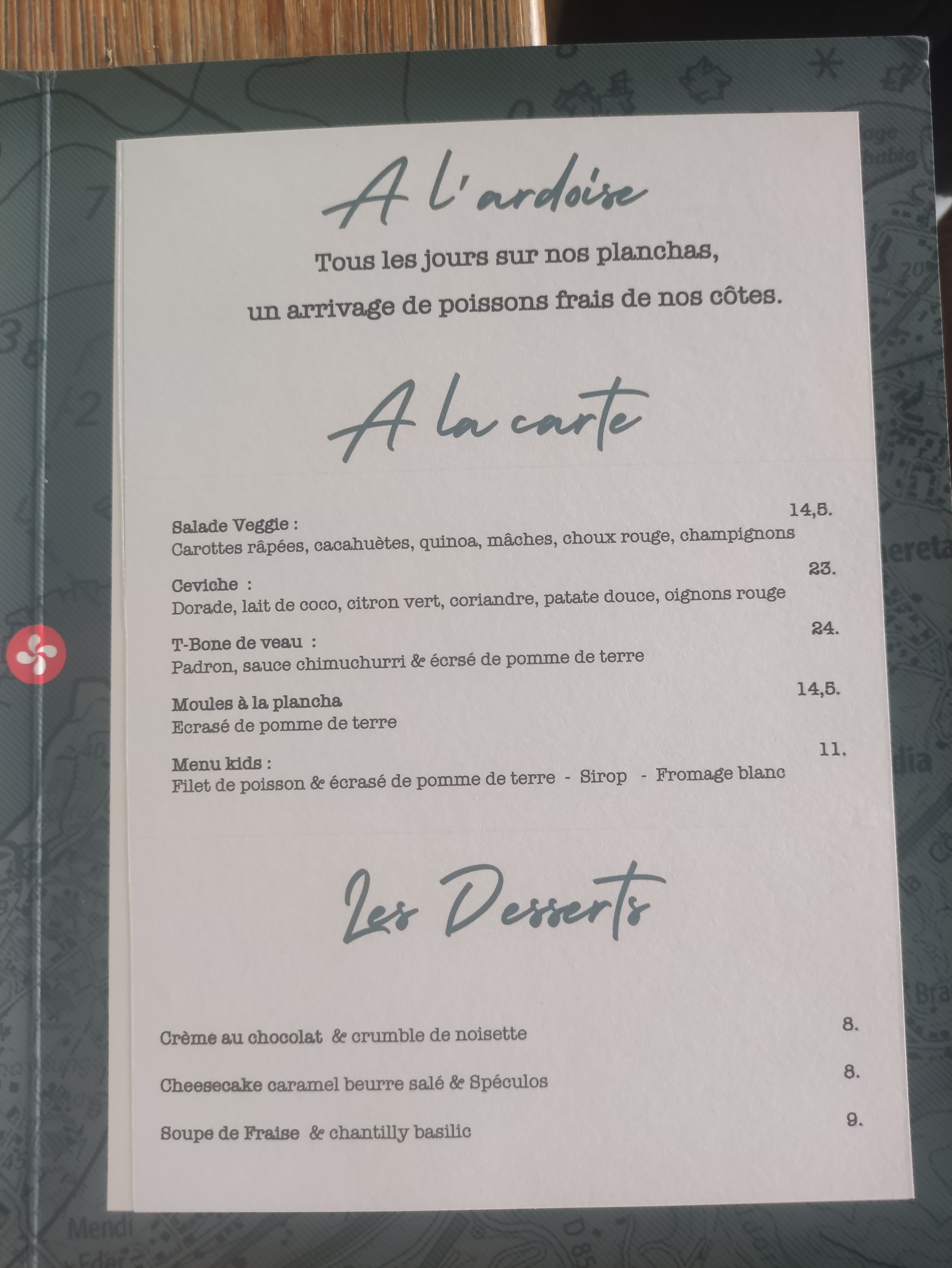 Carte qui donne l’eau à la bouche. Le lieu est sympa ! avec un peu de chance, une petite vue mer en prime. Le service était très bien, équipe agréable et souriante. (Léger point d’attention sur la vaisselle, j’ai du tomber sur le mauvais récipient pour mon dessert au chocolat. La verrine était en fin de vie et en la refermant > éclat de verre projeté) Côté cuisine, pas mal mais un peu cher pour le résultat. Le poisson de mon invitée était un peu trop cuit, dommage ! Et sa soupe de fraise manquait… de fraises ! Cocktails réussis.