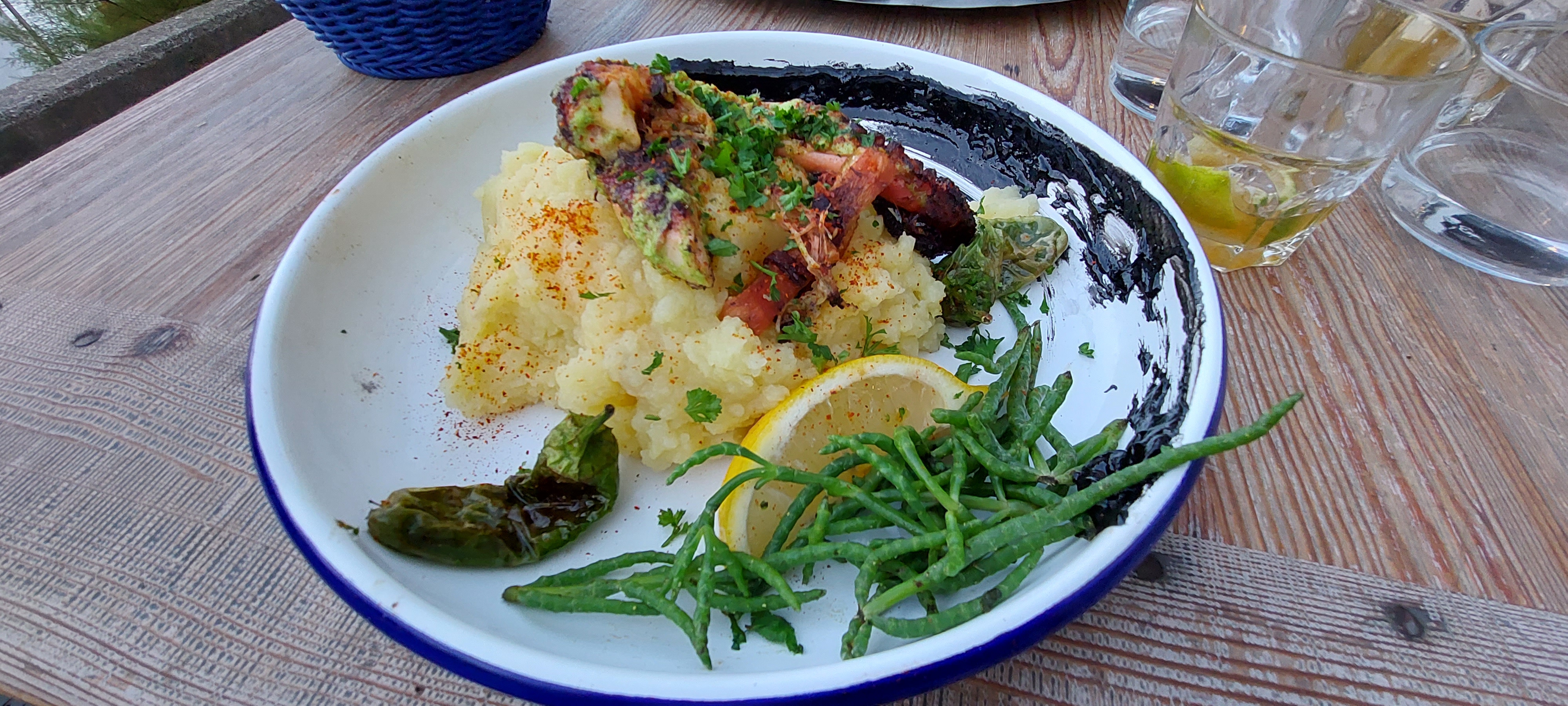 Restaurant bénéficiant d une terrasse à la vue exceptionnelle et d une déco intérieure surprenante d originalité .Service efficace malgré une importante fréquentation , les plats sont simples tournés vers la mer savoureux et copieux fraîcheur remarquable et maitrise des cuissons . Le poisson est servi chaud et entier , les filets sont levés à la table , le poulpe est moelleux aĩoli a l encre et écrasé de pomme de terre ou petits légumes aux saveurs légèrements orientales ..desserts originaux ...sangria et vin ..Personnel jeune et dynamique ..bref un sans faute malgré une météo changeante ..pensez à réserver ..nous reviendrons sans hésiter .