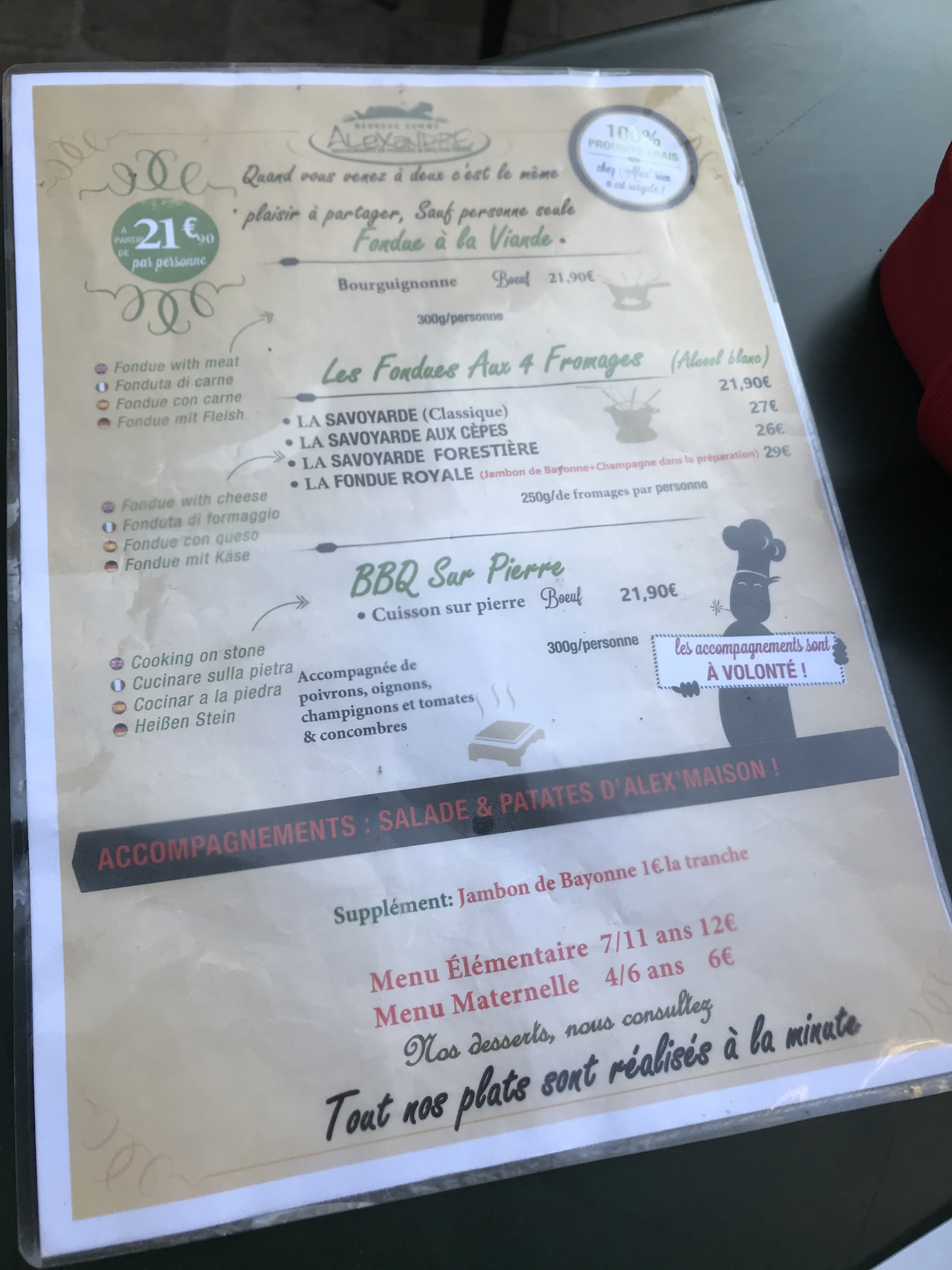 Heureux comme Alexandre. Je confirme ! Petit restaurant très chaleureux. Un peud de vent frais en terrasse ? Pas de soucis, on vous couvre pour ne pas avoir froid voir même vous déplace pour profiter du soleil ! Adorable serveur qui souhaite uniquement à vous mettre bien ! Nous avons tous les quatres super bien mangé ! La fondue savoyarde avait un très très bon goût et le vin blanc est au rendez-vous. Contrairement à ce qui a pu être dis en commentaire, elle ne regorge pas de gras lorsqu'on sait se servir du caquelon. Un super moment, merci au serveur pour son accueil ! Je valide !!!!!!