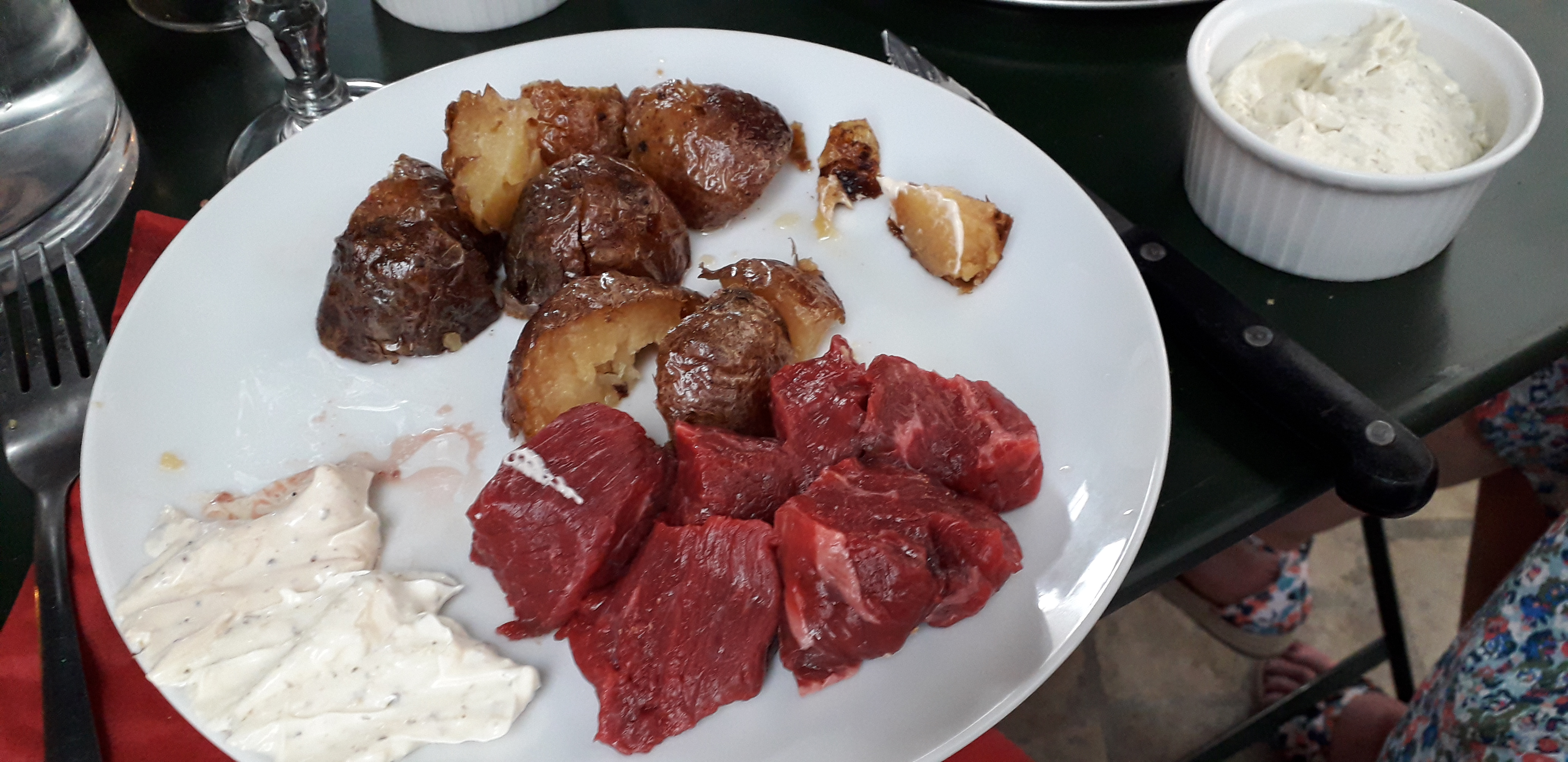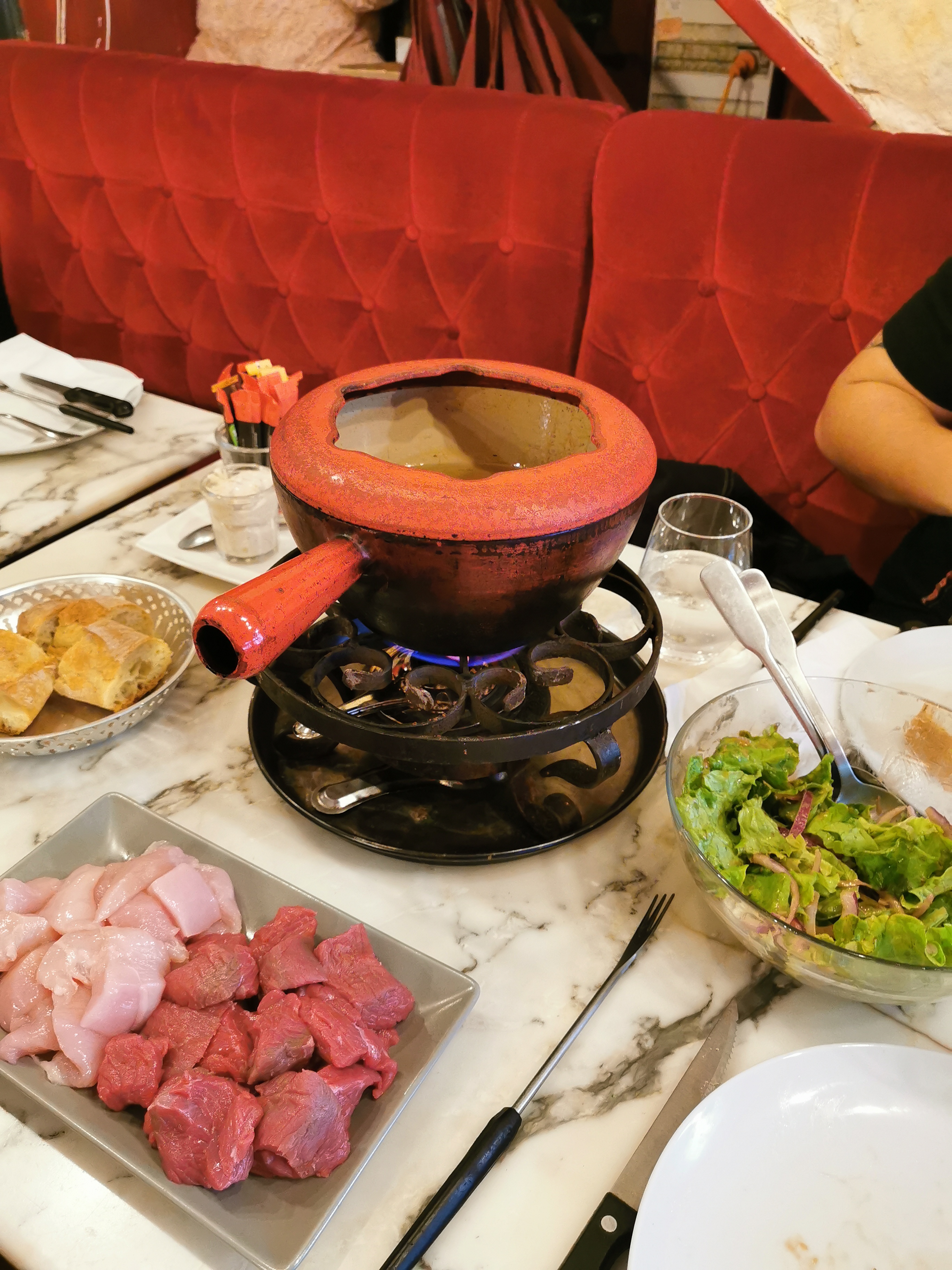 On y a été en couple, une soirée tard en Juin 2022. On a commandé deux fondues bourguignonnes (21€90 par personne), qui sont venues avec de la salade, et des pommes de terre à volonté. La viande était de très bonne qualité, 300g par personne (selon le menu, en tout cas on n'est surement pas reparti avec la faim!). Les sauces étaient très bonnes, surtout celle au poivre. Les pommes de terre étaient exceptionnelles! On a adoré. Le serveur/chef cuisinier était très gentil aussi, la soirée a été très agréable.