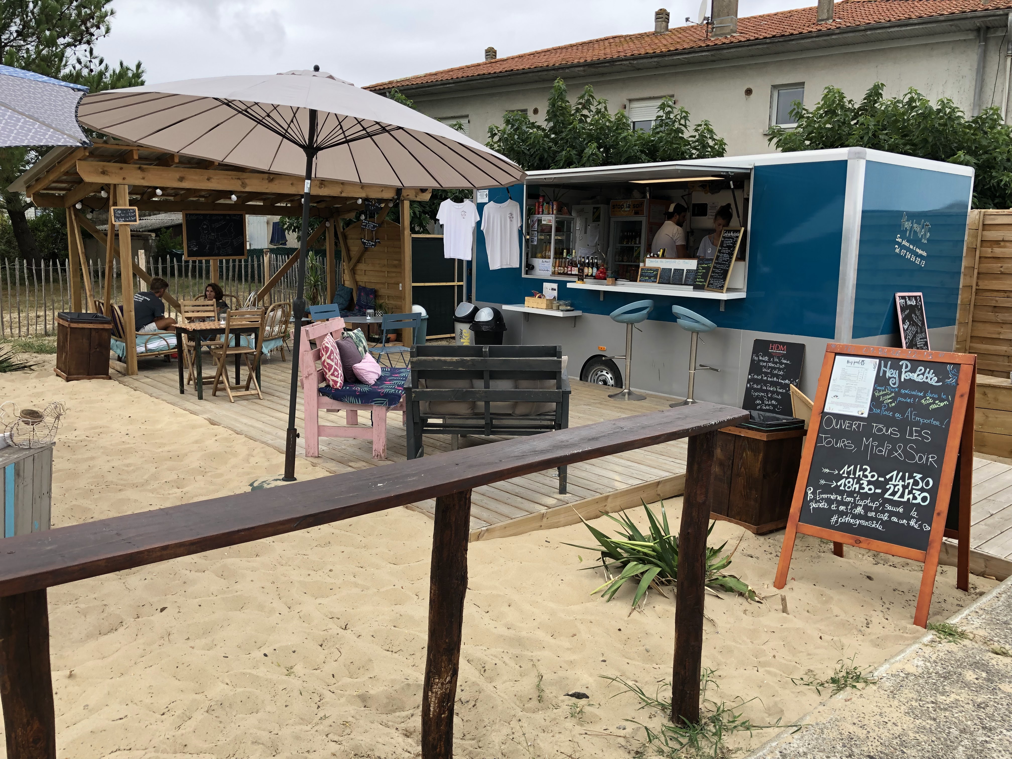 Super food truck au sud de Mimizan. Des recettes élaborées avec des produits frais. Une charte écologique bien définit et des plats végétaliens. Sur la super terrasse qui donne sur le courant. Un bon big bucket, un thé glacé et des cookies vegans. Les recettes sont vraiment travailler et améliorées avec des saveurs variées, le poulet fond dans la bouche, les patatas croquantes et vous ne pouvez ps partir sans goûter les boulettes poulet béchamel. Et si ça ne suffit pas à vous convaincre venez pour la gentillesse de Mathieu et le sourire d'Alizée. La bise aux poules.