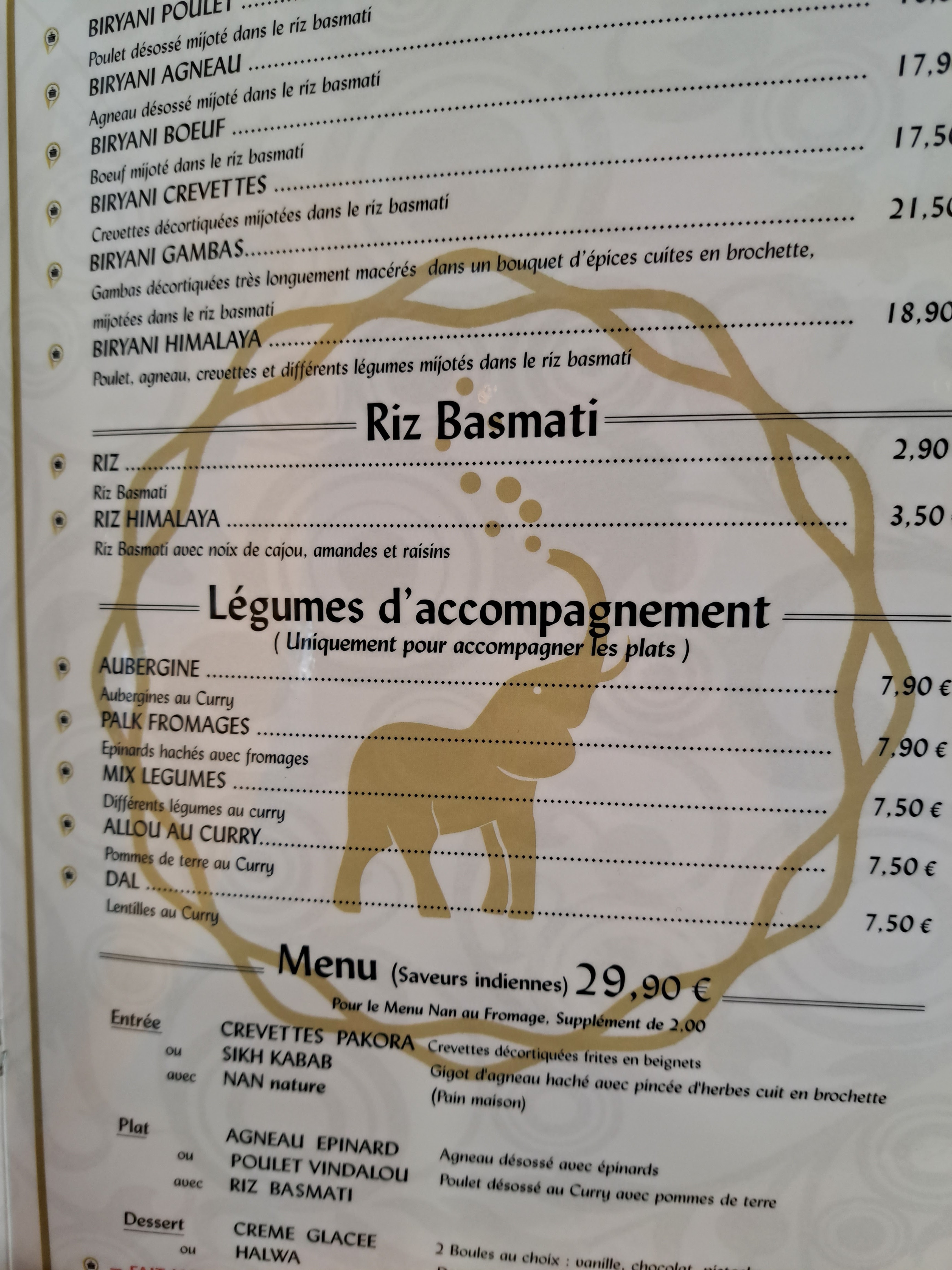 Rien a redire, c'est bon, fait maison, une carte assez variée, si on aime l indien je pense qu on ne peut être que satisfait. Seul petit point noir, pas de menu abordable (peut être en semaine ?)