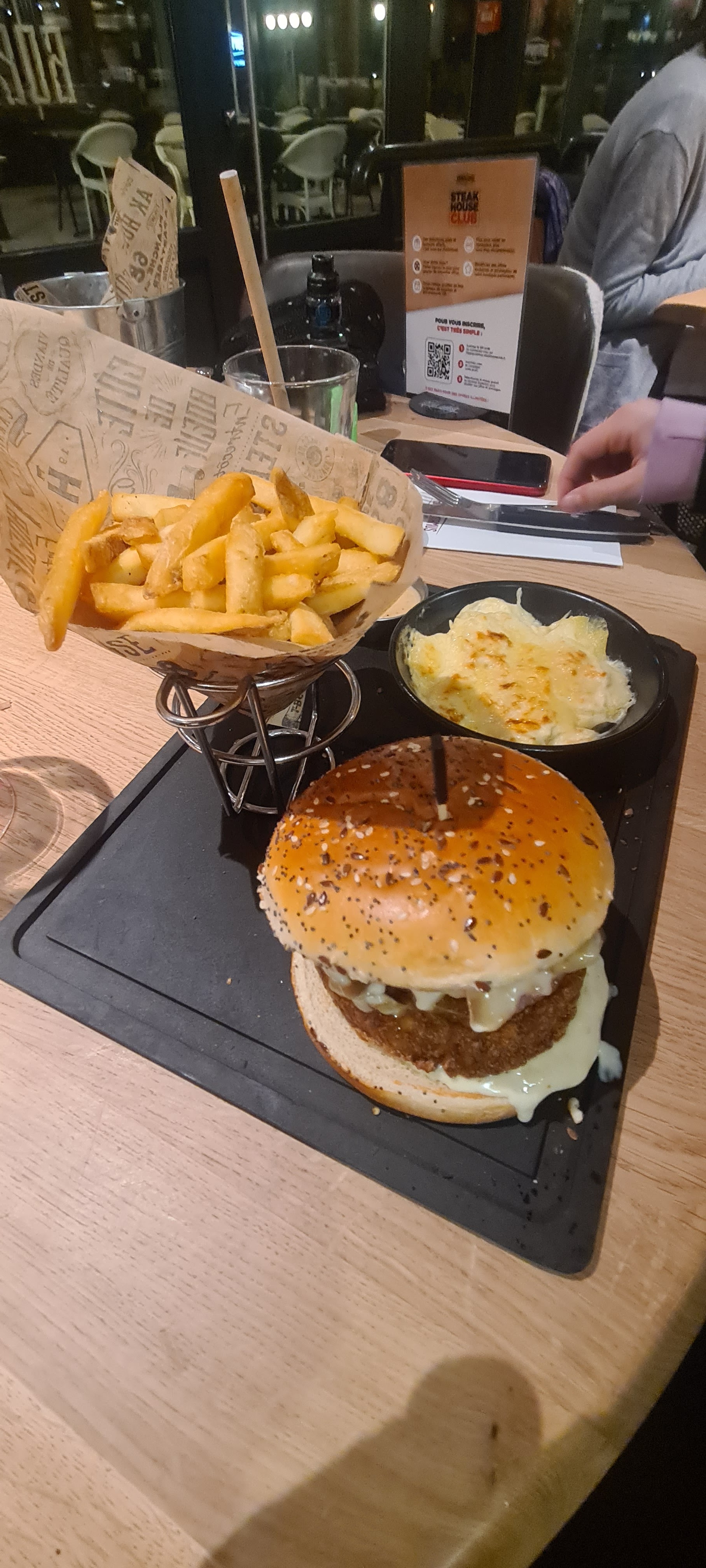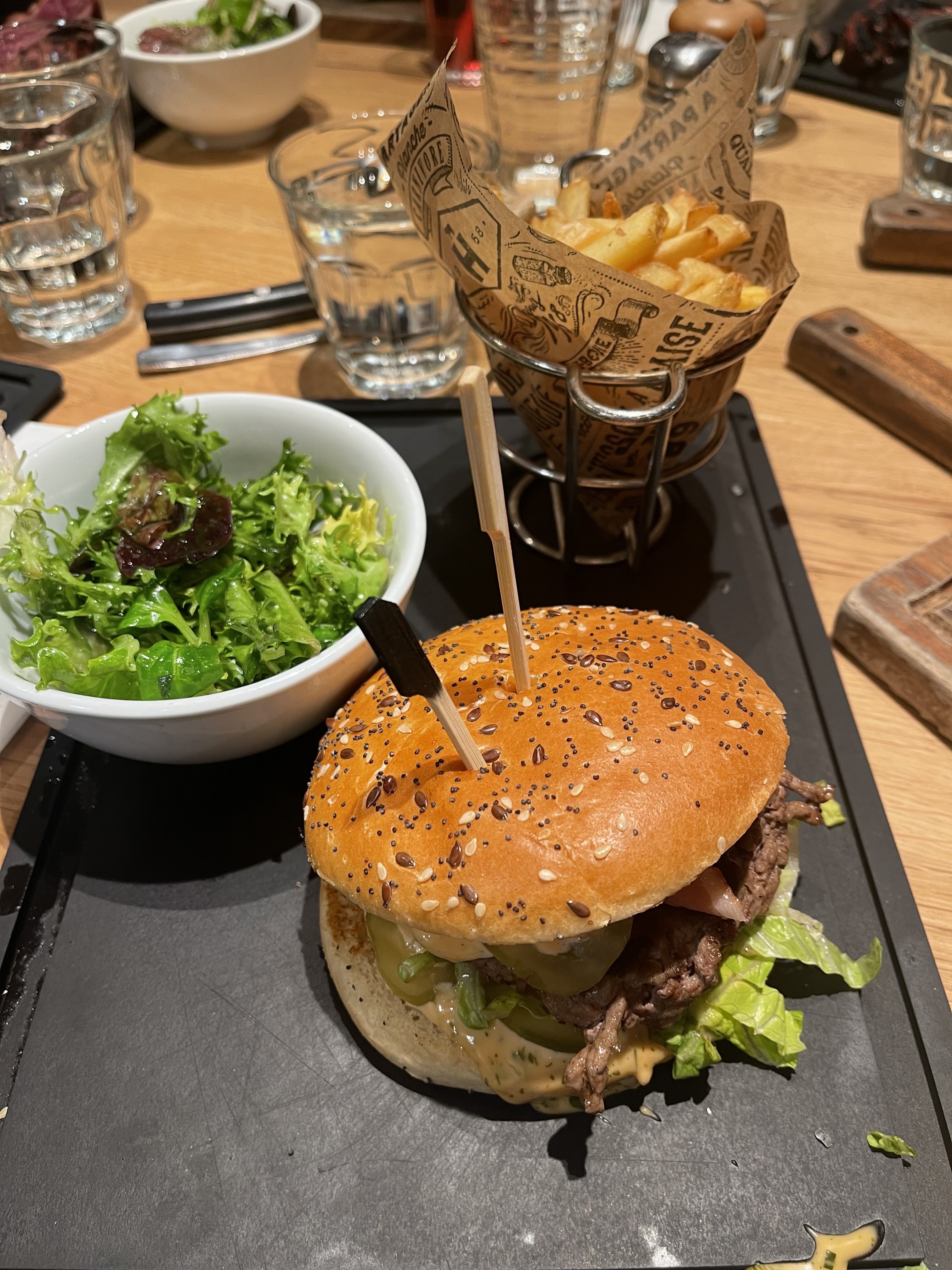 Nous sommes venus dîner à trois. Le service en salle était déplorable, peu aimable, nous avons attendu, et les plats n’était pas tous chauds. Nous avons pris des Cheeseburger, entre le pain et le steak garniture à sa plus simple expression. La serveuse tend les plats sans faire le tour de la table, des clients se présentent à l’accueil et repartent au bout de cinq minutes car personne n’est venu à leur rencontre, c’est vraiment dommage parce que cet endroit était bien chaleureux il y a encore six mois.