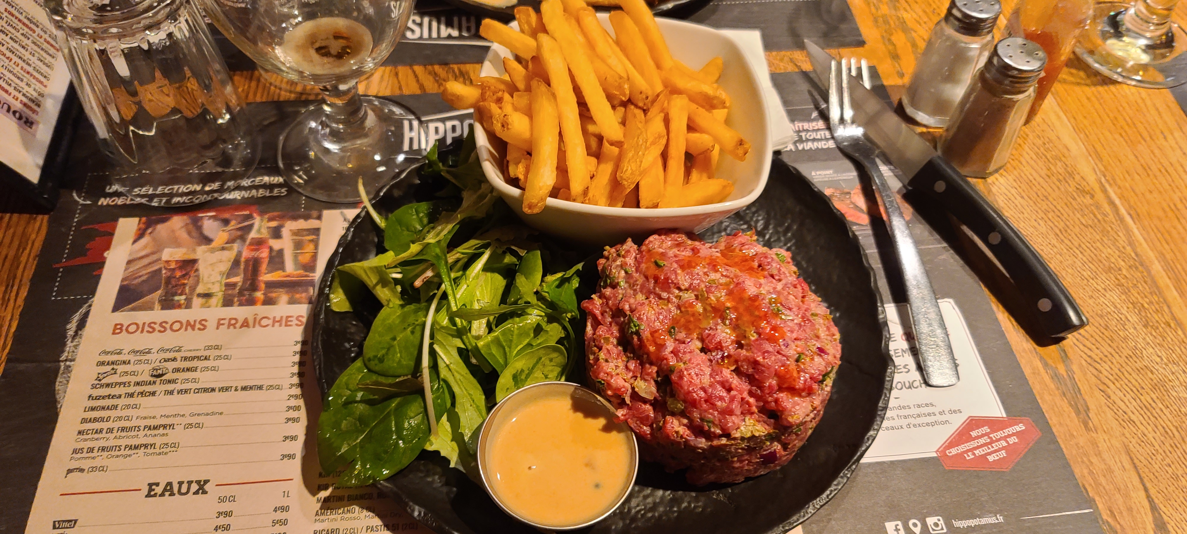 Une erreur sur la commande (et attente de 15 min de plus pour être servi, avec les excuses du personnel), pas de geste commercial pour cet incident (une boisson ou un dessert aurait pu être offert par exemple), une andouillette gustativement proche d'un produit hypermarché, le tartare était pas mal, l'assiette a grignoter très correcte, les frites auraient pu gagner a être moins sèche, heureusement se termine avec des desserts copieux et bon.