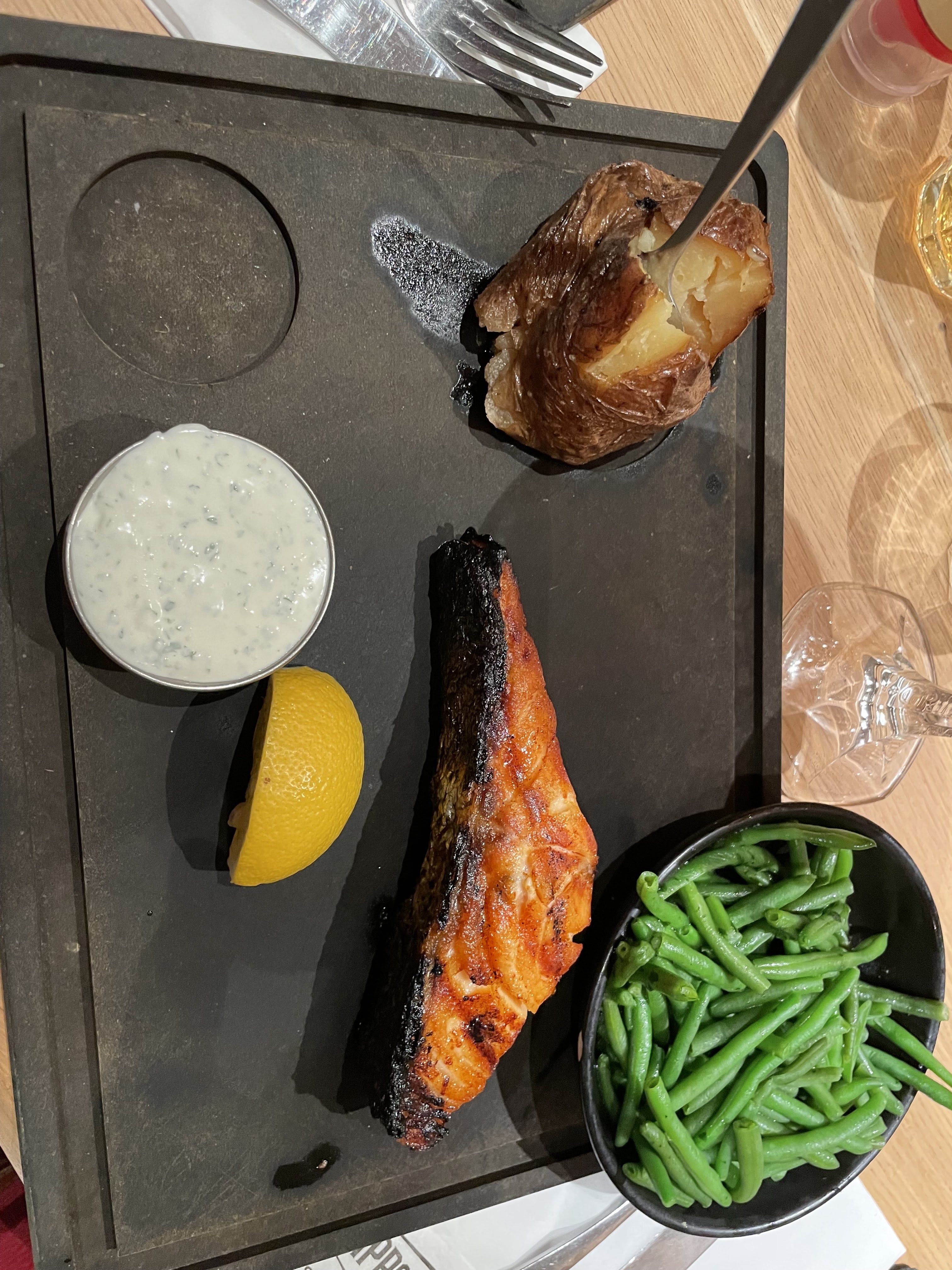 Scandaleux. Le restaurant a changé au fil des années… 1- Service déplorable: elle vous évite, quand vous lui parlez elle ne vous répond pas. Coca servi sans verre, et elle dit ne pas pouvoir donner de verre car menu enfant, seule une paille est proposée 2- 1h d’attente pour avoir les plats malgré les relances par contre très rapide pour avoir l’addition 3- La cuisson des plats pas bonne. Saignant quand on a demandé bien cuit et saumon arrivé.. cramé !! Voir photo.