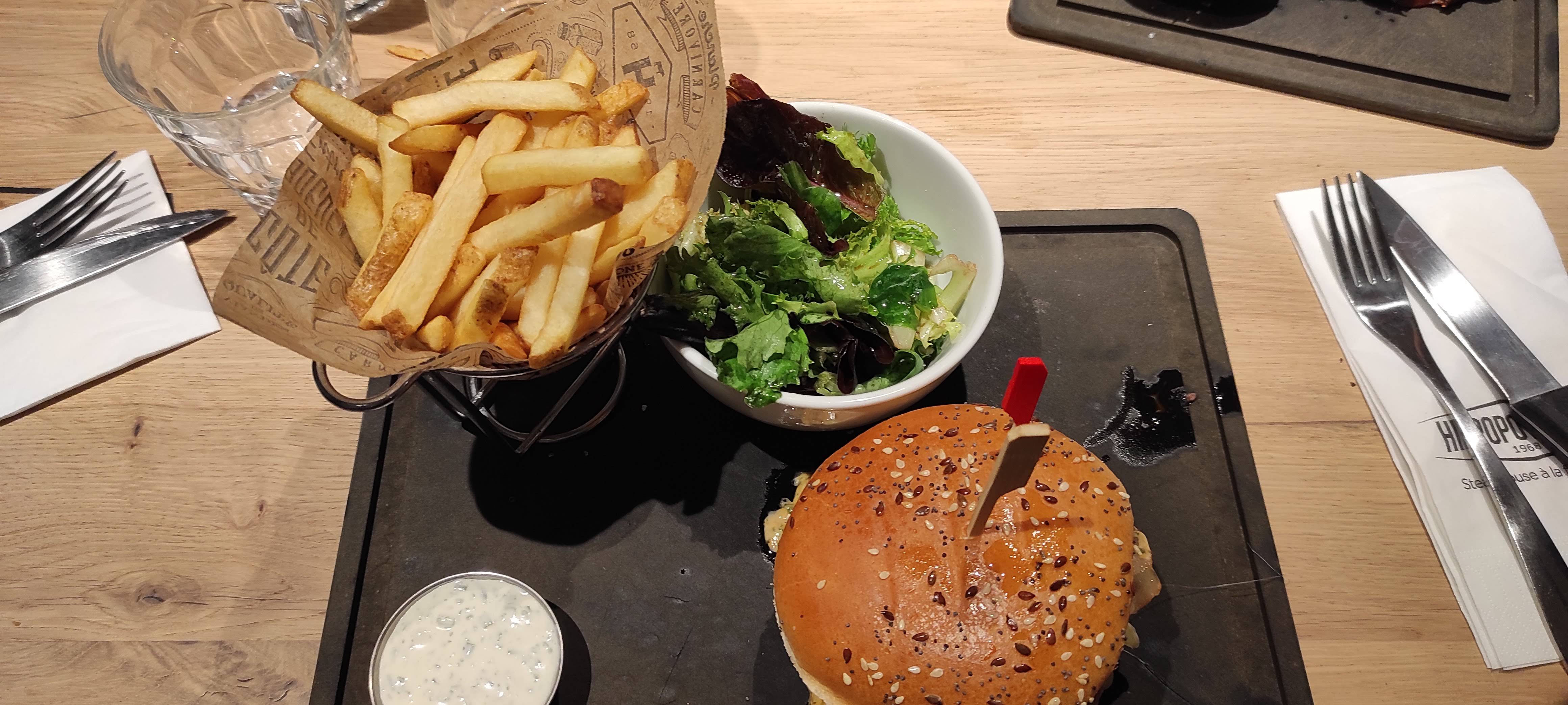 Personnel et accueil sympathique. Cadre agréable. Mais la nourriture catastrophique. Chips d'apéritif immangeables : le pot d'épices avait été renversé dessus ! Les sauces accompagnant les frites étaient diluées à l'eau (et pas qu'un peu), donc totalement liquides et sans saveur (rien à voir avec l'onctuosité des sauces dans les autres hyppopo pratiqués jusque-là). Le plat (hamburger) était sans saveur et presque vide (mais riche en salade...) : la sauce semblait elle aussi diluée. Une catastrophe.