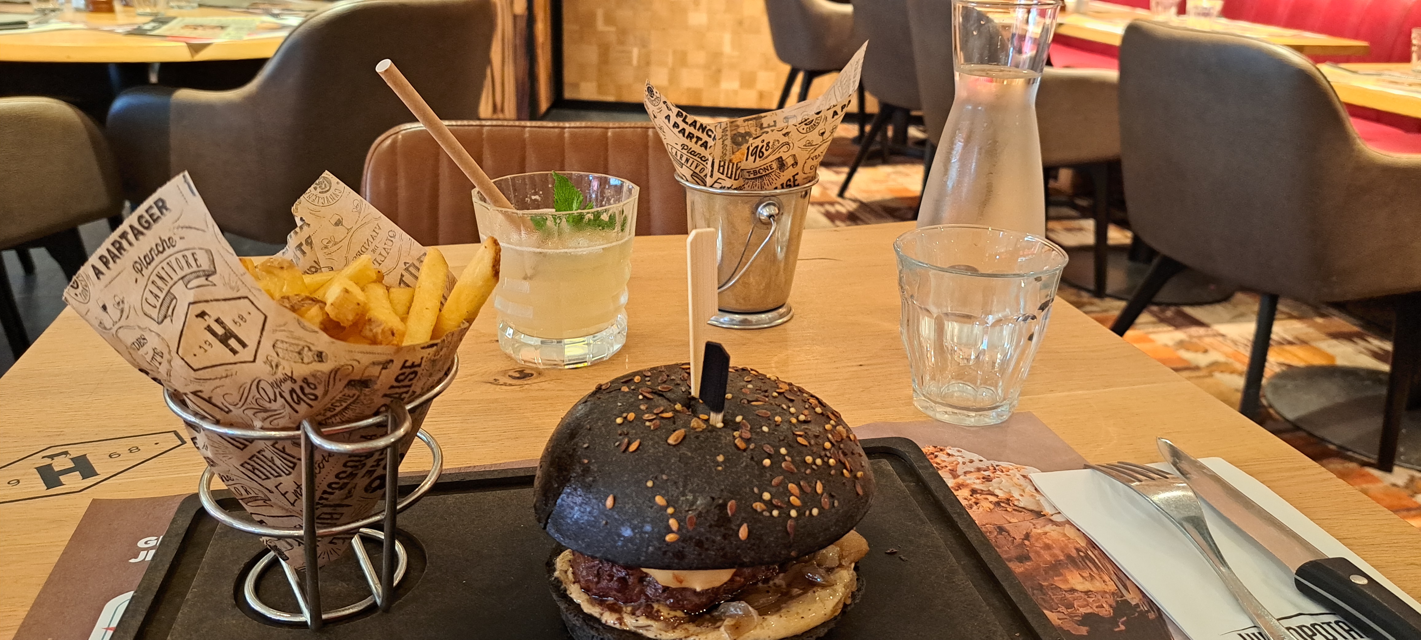 Attente de 30minutes pour prendre ma commande et 40 minutes de plus pour avoir mon plat et mon steak haché trop cuit. Salle top mais service non sympa et très très lent. Non recommandé . Sachant que j’étais seul en plus… au vue de la lenteur, je n’ai pas tenté le dessert..