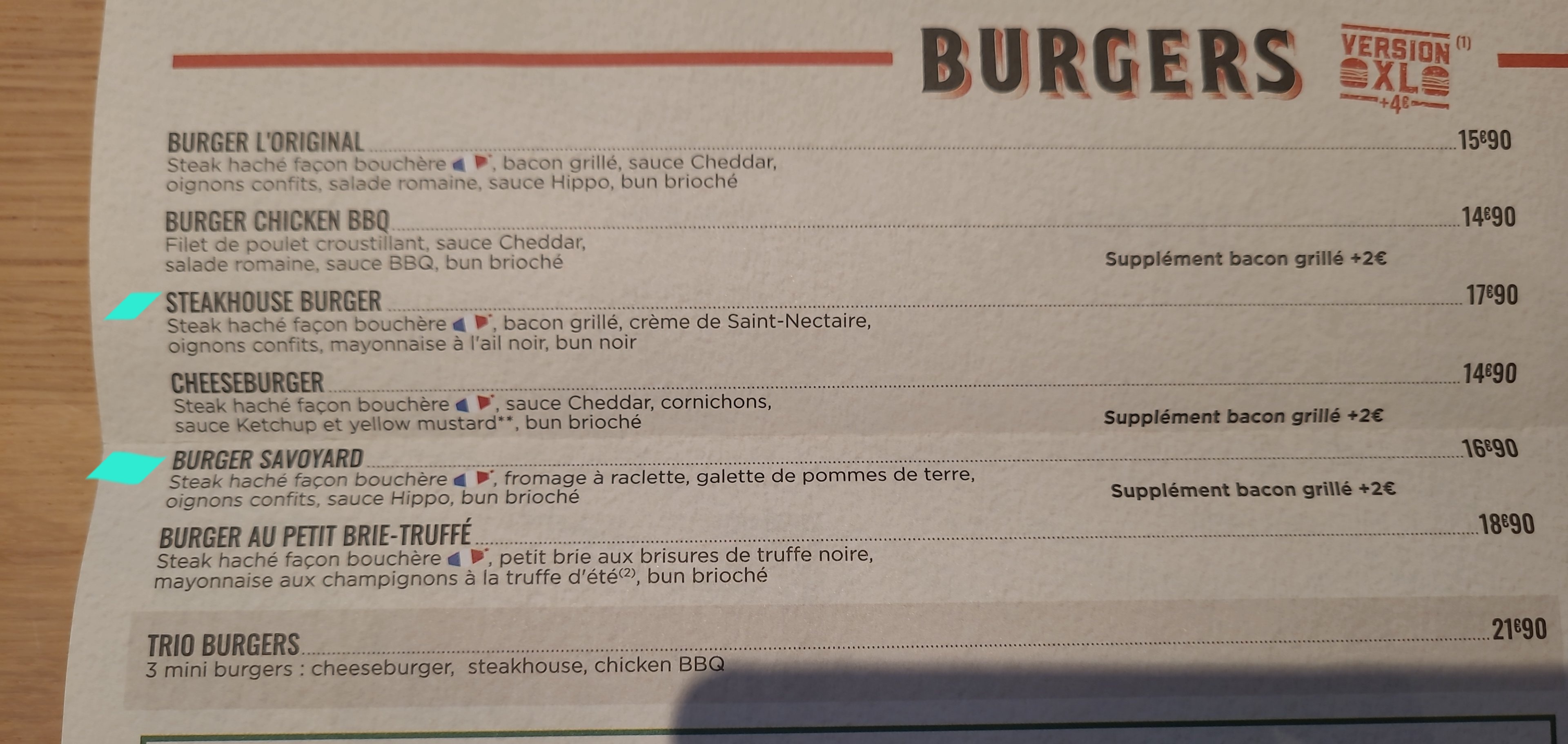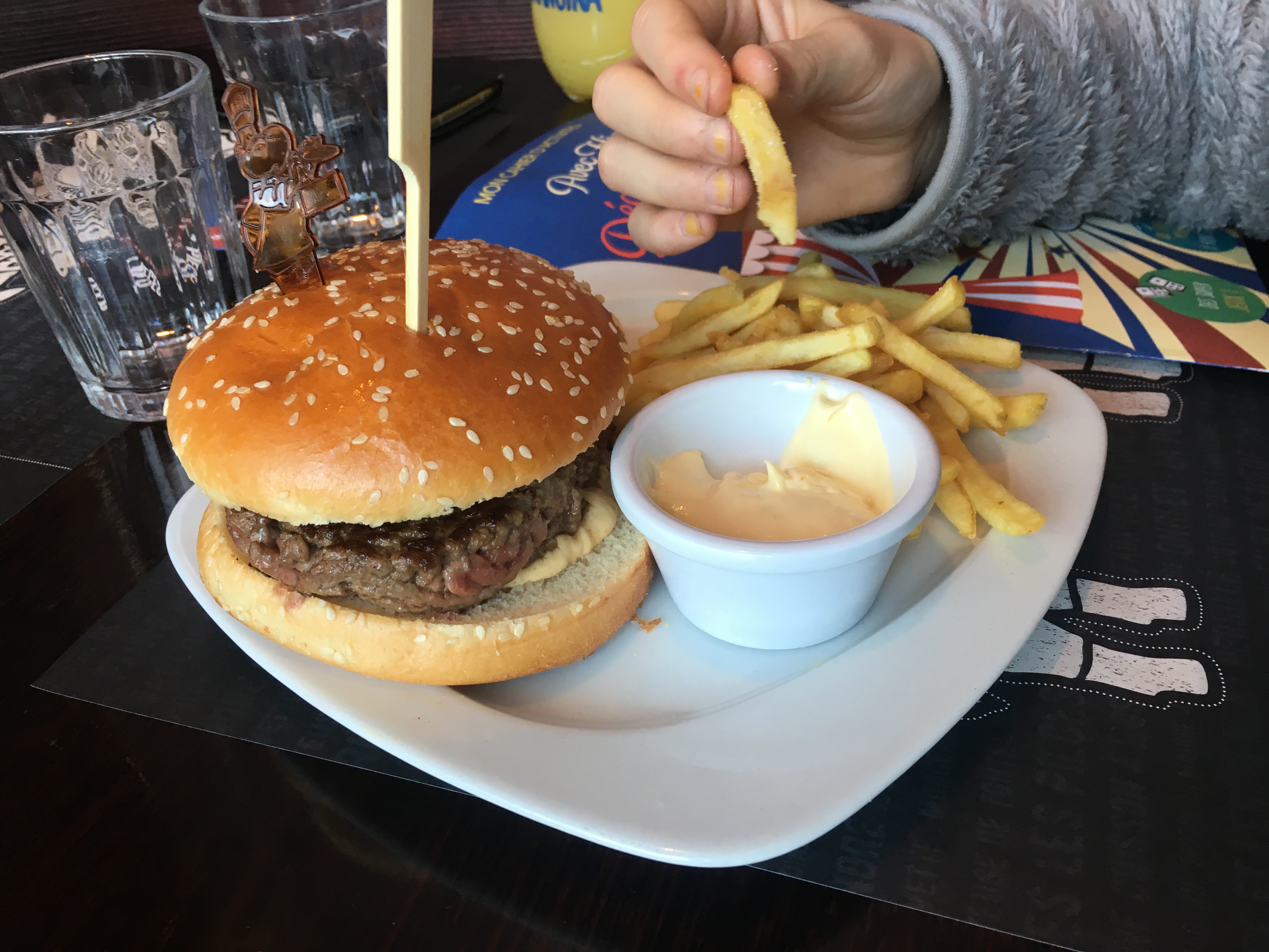 Des petites parts pour un prix assez cher, présentation très moyenne., une petite salade sous le Burger aurait été apprécié, une petite purée et quelques frites pour mes collègues, onglet de bœuf très petit pour mes collègues.. Enfin un menu pour enfants.