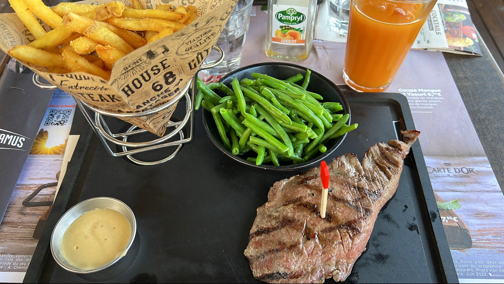 J’ai pris une entrecôte avec une pomme de terre au four La pomme de terre était pas incroyable mais la viande super bonne, malgré une petite partie qui avait trop cuit mais sinon super bonne, fondante en bouche La sauce béarnaise avec était délicieuse J’ai pris un œuf à la provençale en entrée, excellant aussi ! J’ai super bien mangé en plus d’avoir une superbe vue juste à côté !