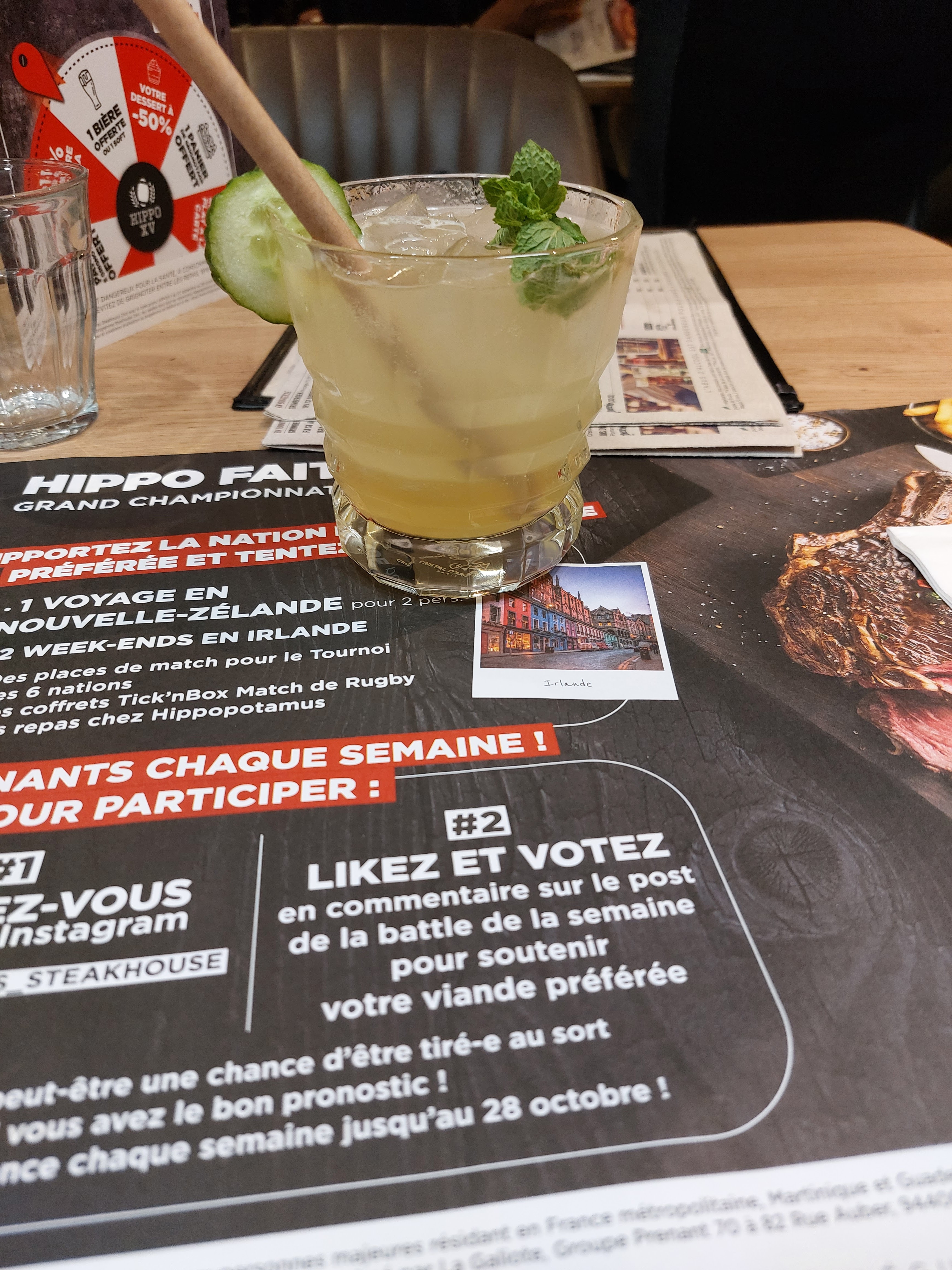 Pris en charge par le serveur Mamadou, il a été impeccable au niveau du service du début jusqu’à la fin sachant que nous sommes très exigeant. Passons au cocktail: le Paradis le mojito passion et le raspberry moon était bon cependant on a du renvoyer le cosmo is dead qui n’était pas bon et mal dosé, pareil pour le Sex on the beach qui était vraiment abject (d’où sort la liqueur de melon vert, Revoyez la recette!!!) Passons à la cuisine: les ribs sont toujours très bonnes rien à dire en revanche le magret de canard était extrêmement dur à couper et à mâcher, revoyez la cuisson! Première fois que nous ressortons mitigés d’Hippopotamus