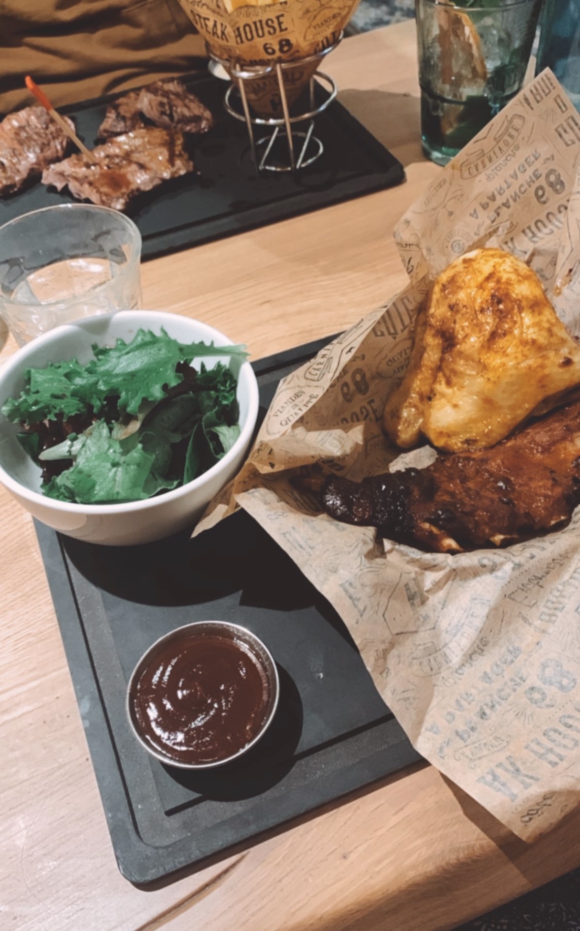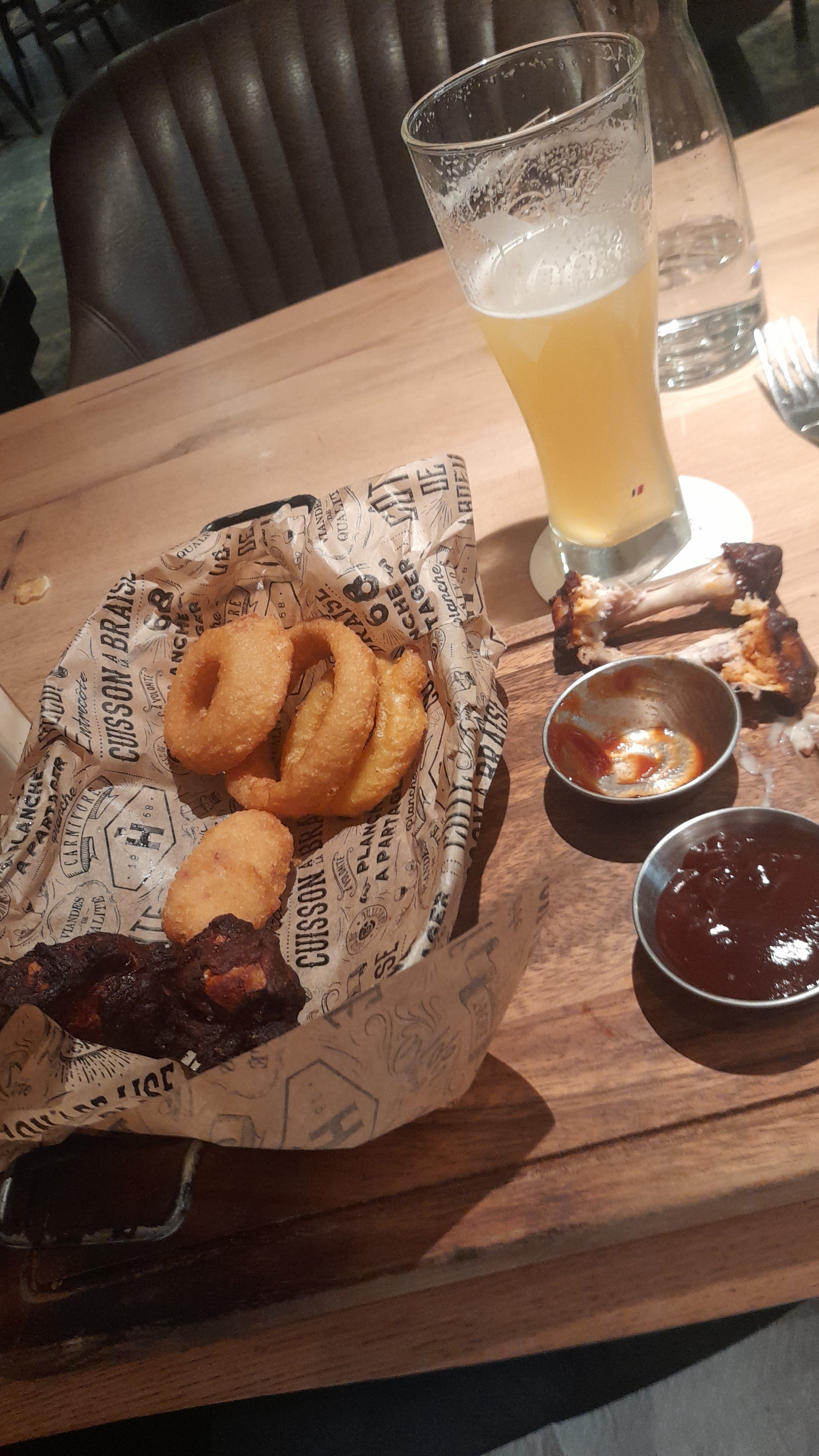 Personnel sympa Service assez rapide Mention spéciale à la personne qui prépare les cocktails ils étaient vrmt bon. Pour les plats le ribs était très bon, bon goût bonne cuisson La moitié de poulet rôti été trop cuit la viande sèche Le riz aux chorizo euh ils sont ou les chorizos ? Riz pas top du tout Pomme de terre au four rien de particulier ni bon ni mauvais . Le saumon été trop cuit et les légumes pas extra . Les nuggets et frite étaient bon.
