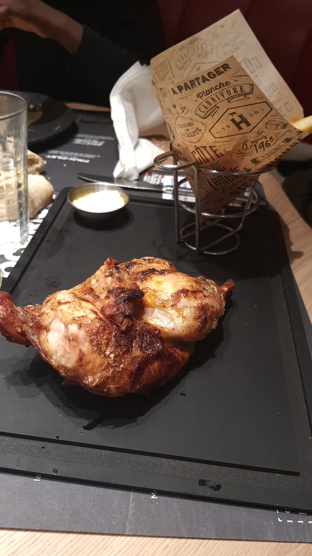 Endroit sympa propre avec un personnel souriant et serviable. Dans les 3 plats que j’ai commandés, pour ma part, un seul était moyen « le haché italien » car il n’était pas assaisonné et la mozzarella n’était pas fondue / coulant «elle a eu le temps de durcir » et le plat n’était pas assez chaud. Ceci dit, Le demi poulet rôti et le pavé de rumsteck Angus argentin étaient bons. Enfin, Je ne savais pas qu’il était possible de choisir deux garnitures, la serveuse ne nous a rien dit… et la réduction de 10% s’applique uniquement sur un seul plat et non sur l’addition de la table.