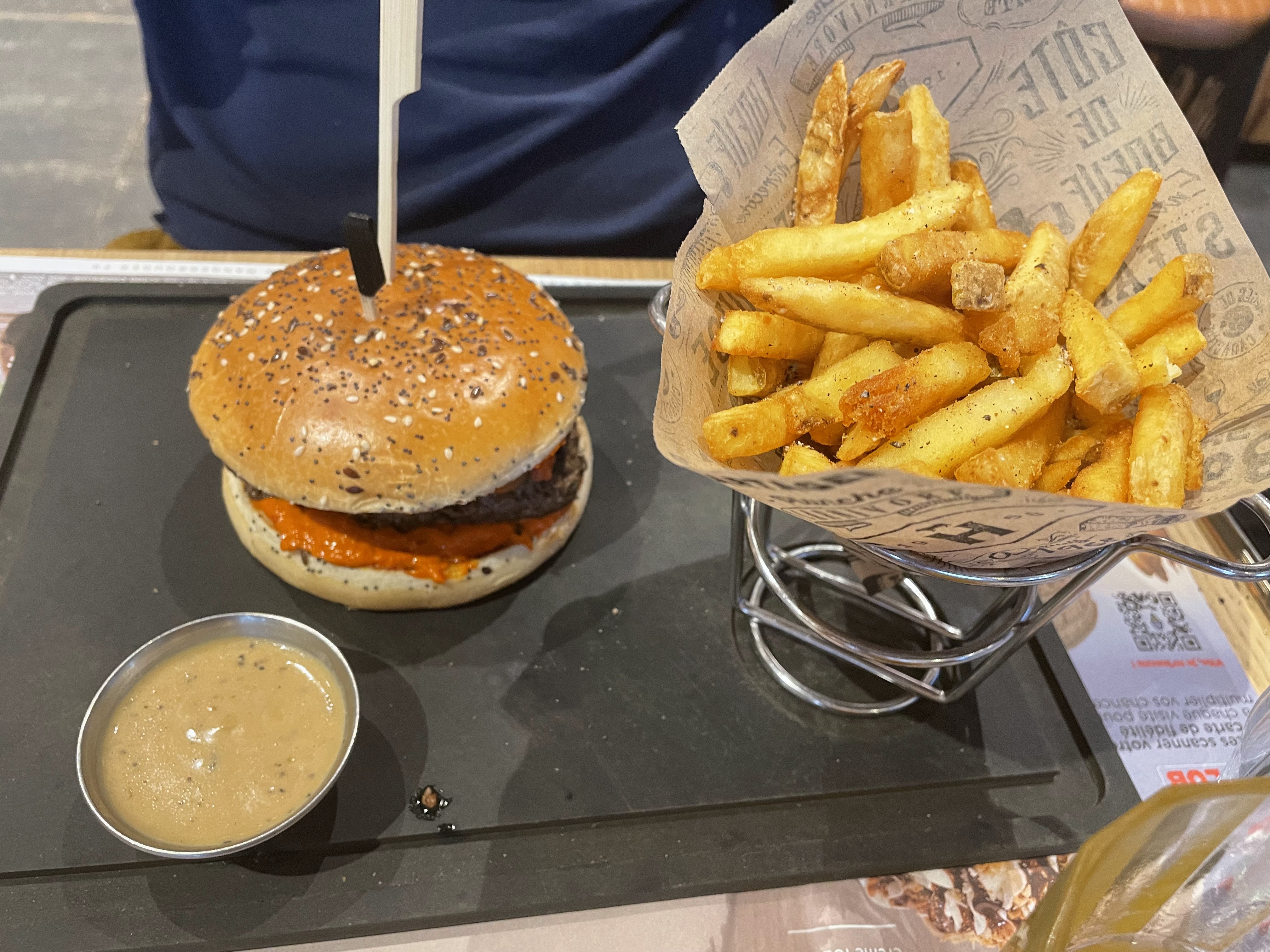 Le goût et la qualité du burger est top , par contre leur assiette est vraiment triste 6 frites qui se battent en duel ( dommage elle sont bonnes ), il aurait au moins proposé les frites à volonté j'aurais augmenté ma note . pas une petite salade en accompagnement histoire de donner au moins un peu de volume à l'ardoise servi. Le tiramisu est excellent certes mais c'est une mignardise comparé à beaucoup d'autres endroit , le prix est trop élevé selon moi pour la quantité servi ( on peux trouver beaucoup mieux dans cette gamme de prix en adresse dans les alentours ) pour avoir fait énormément d'adresse .l'attente été un peu longue pour le dessert . La déco est sympa les serveurs sont plutôt sympas également. Bref ça dépanne bien quand on as pas eu le temps de chercher