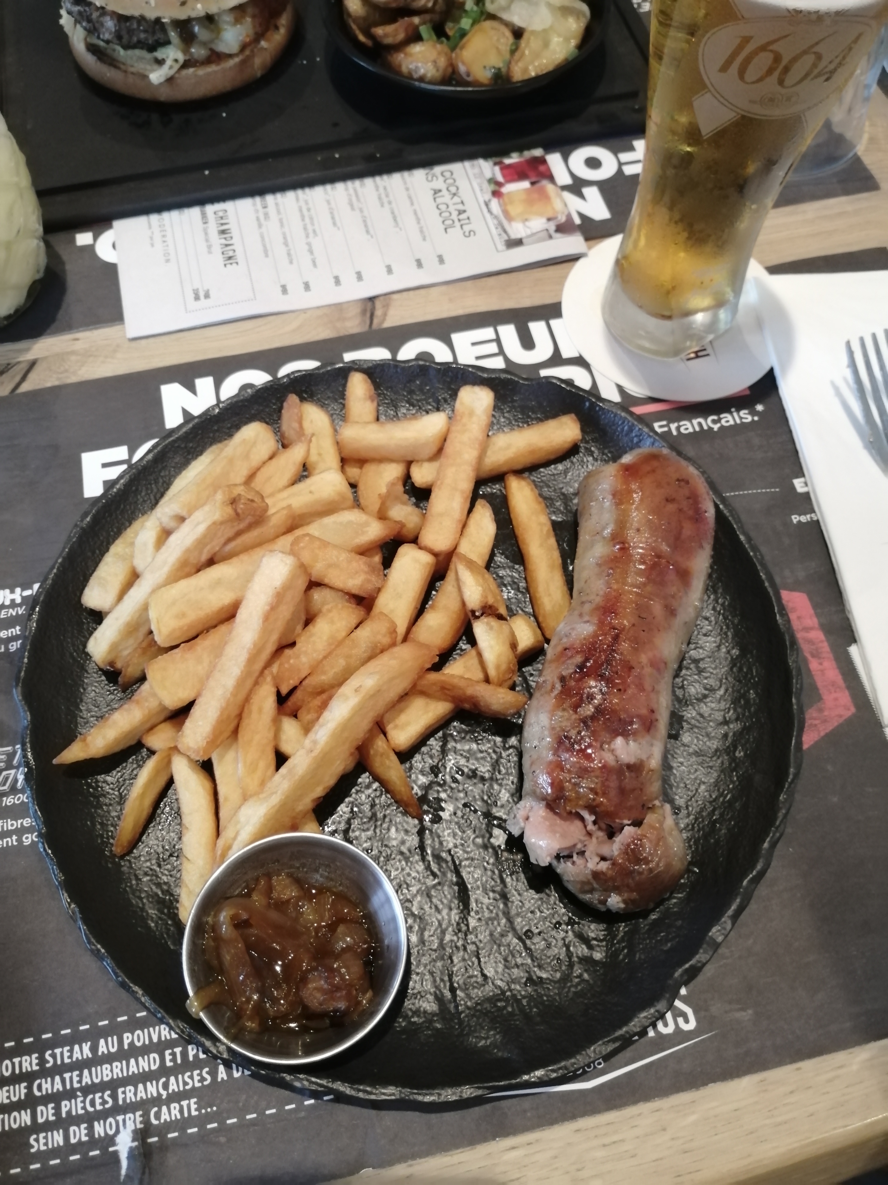 En ce dimanche soir, nous nous réjouissions de savourer un bon repas en famille, connaissant le lieu et la carte pour les avoir déjà testés à deux. Premier bug, nous demandons le burger Steakhouse au St-Nectaire SANS oignons, le serveur prend note et précise qu'il n'y a pas d'oignons dans ce burger, ce qui nous surprend par rapport à ce qu'on a vu sur la carte mais bon, tant mieux ...et le burger arrive avec son confit d'oignons. Nous rappelons le serveur, désolé, qui propose spontanément de remplacer le burger, mais pour ne pas faire attendre les autres convives, notre invité retire tous les oignons et dit que c'est ok. Les plats sont très bons, chauds, bien servis, nos demi-poulets étaient bien cuits, le tartare de boeuf à l'italienne a eu du succès. Arrive le moment de choisir les desserts, nous prenons un café gourmand et un thé gourmand, ainsi que deux dames blanches. Déception de voir arriver d'un côté le joli plateau du café gourmand avec cinq mini desserts, et de l'autre le plateau du thé gourmand, beaucoup plus petit, avec seulement trois petits desserts... Pourquoi?? Parce que la cuisine s'est trompée? Allez savoir. Encore une fois, c'était bon, mais finir sur cette fausse note nous a donné envie de rentrer, peut-être plus tôt que prévu. Notre serveur était très aimable, attentif et rapide (au passage je le remercie d'avoir si bien emballé les restes de poulet pour mon chien) et nous reviendrons, cela ne remet pas en cause ce que nous apprécions dans ce restaurant. Mais il fallait que je vous dise tout cela, pour que la prochaine fois ce soit de nouveau cinq étoiles!
