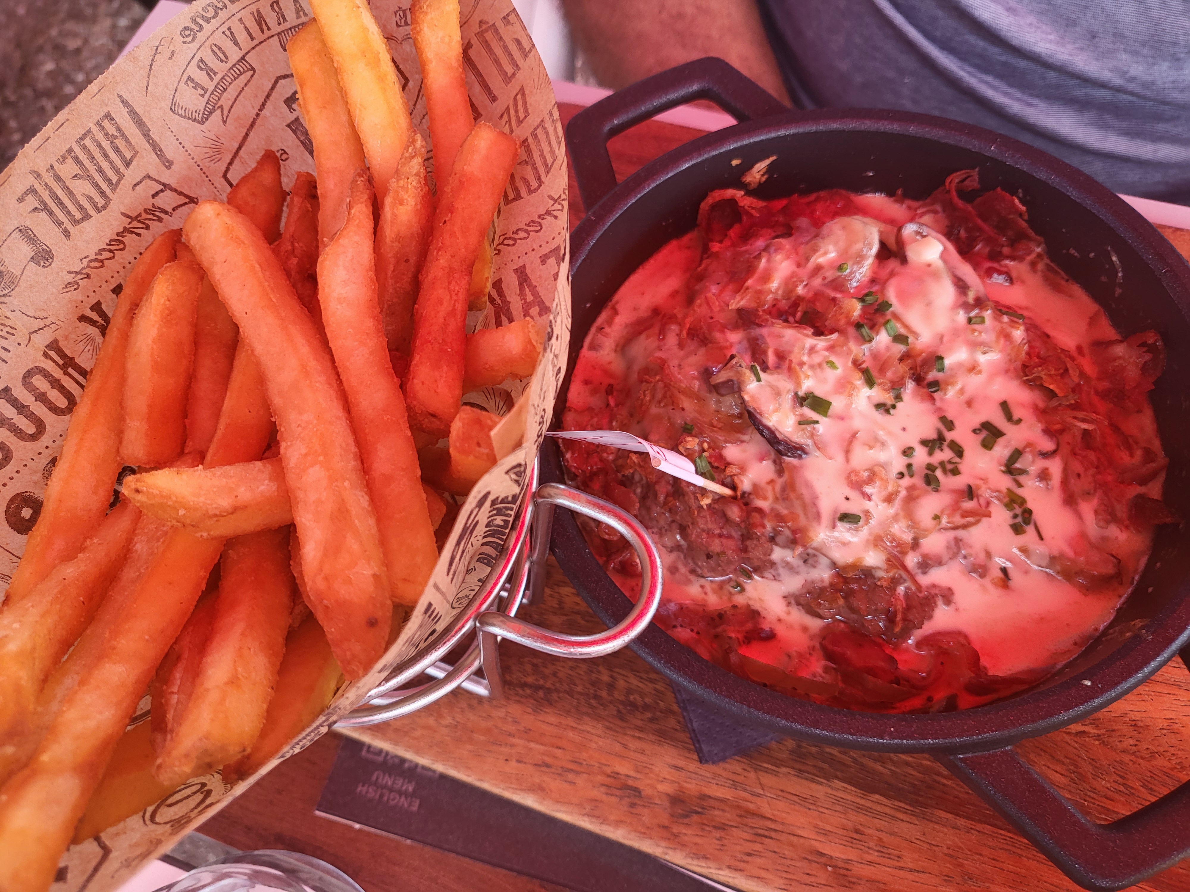 Alors viande tres correct malgré trop de sel sur la pièce de viande pour deux, mais alors un manque crucial de personnels une attente trop longue entre la prise de commande, l'entrée et le plat. Servir la viande et 6/7 mins et plus tard l'accompagnement et regarder la viande refroidir merci non merci ouf il faisait 30° dehors, et pour un samedi soir de pont du 15 août seulement 1 personne pour gérer la terrasse bof bof, ne pas proposer une carafe alors qu'il fait 30° à 21h30 ou revenir nous voir pour savoir si ça allait, donc pour un ticket de 93€ pour deux 🤨 Bref viande correct mais réellement un manque de serveurs malgré une bonne volonté dommage.