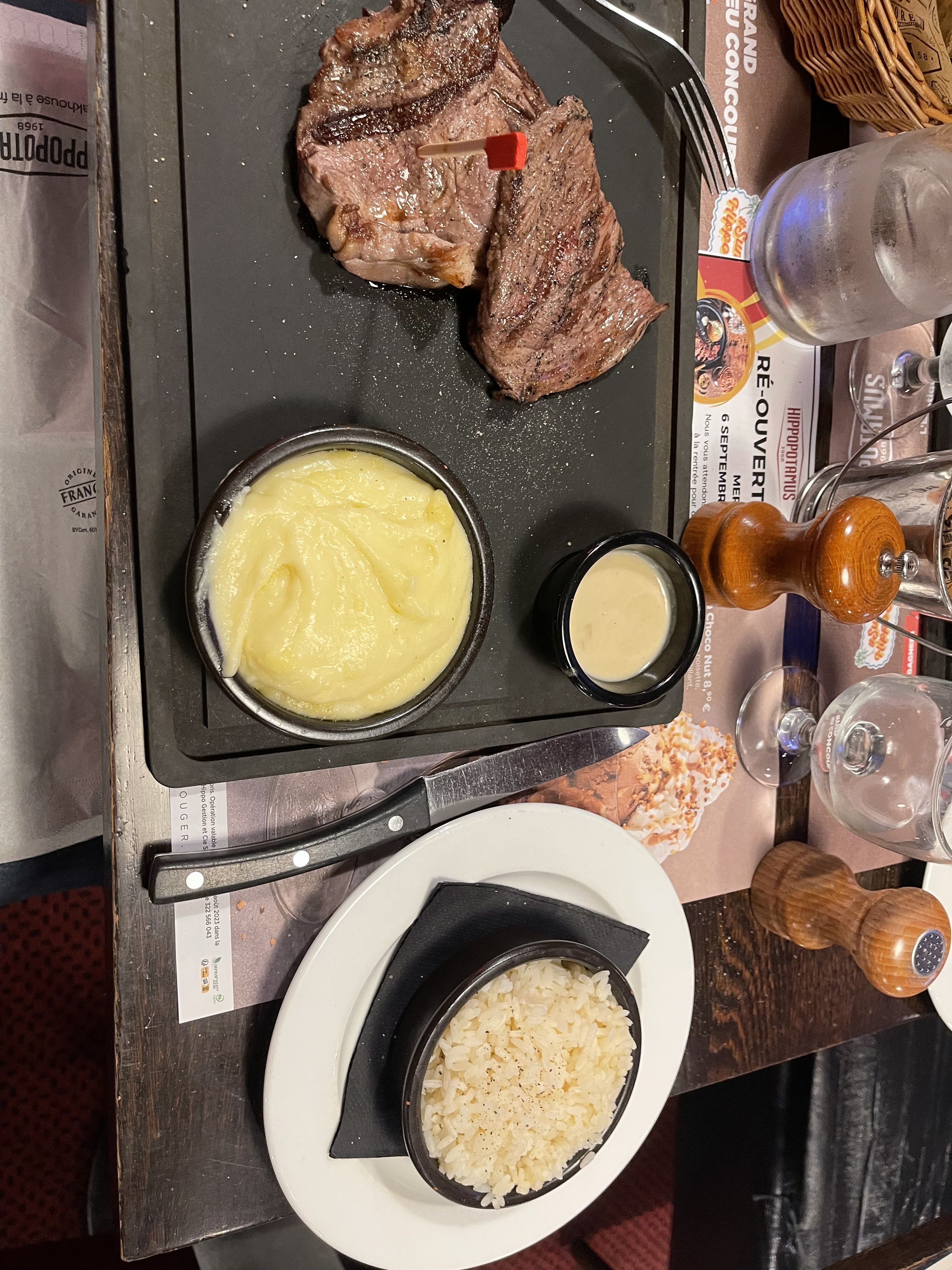 Nous venions du Royaume-Uni lors d'un voyage de hockey. Nous étions 13 pour le déjeuner, ce qui ne devrait pas poser de problème car il n'y avait pas beaucoup de monde. La nourriture était horrible. Quatre d'entre nous ont renvoyé nos repas. J'ai commandé du médium rare, c'était très rare ! Les frites avaient le goût d'avoir été réchauffées la veille ! Mon mari a payé quatre repas coûtant 142,00 €, boissons comprises, ce qui représente beaucoup d'argent pour un repas insatisfaisant !?