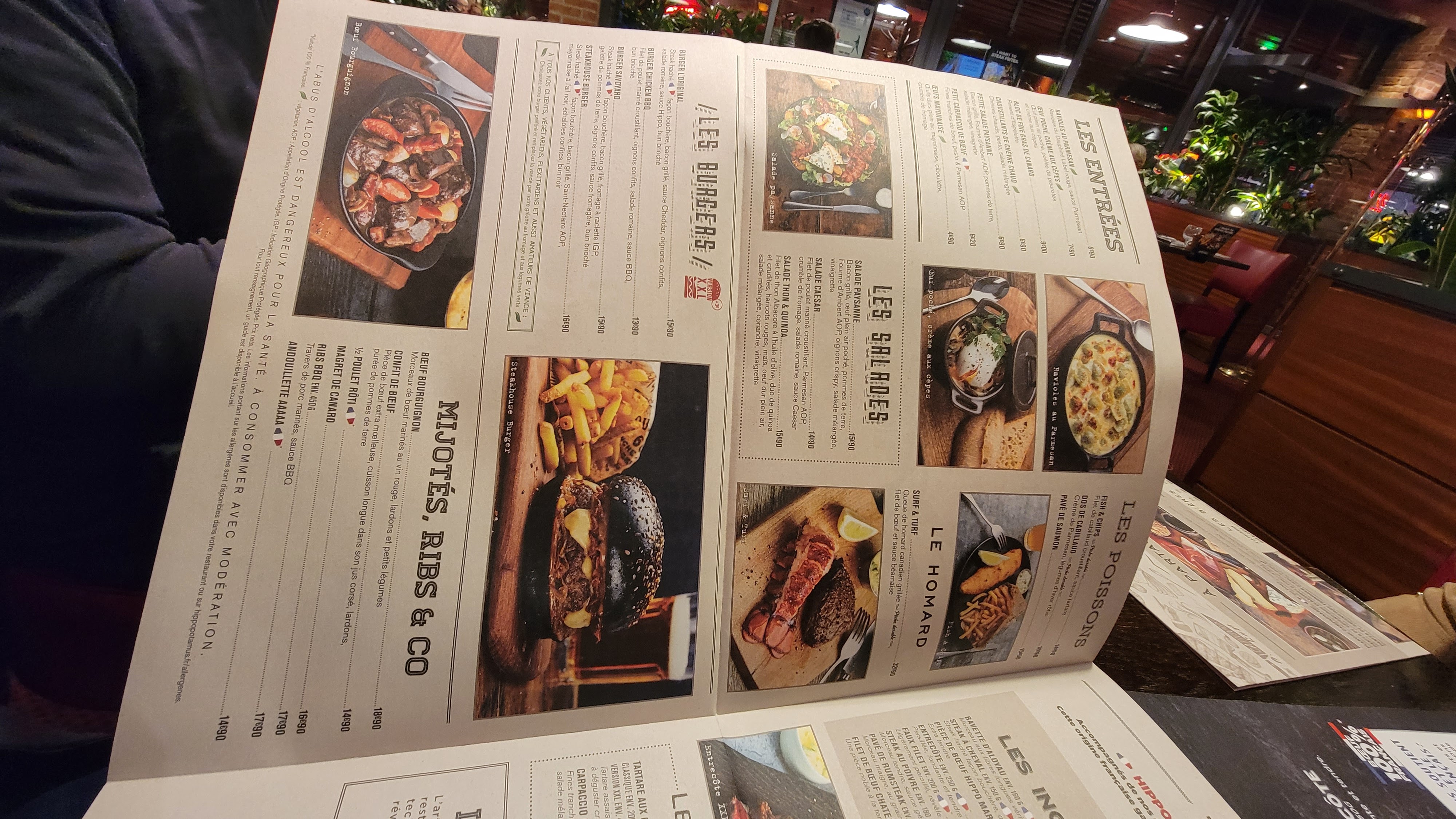 J'ai diné avec au programme le menu complet entrée, plat, dessert, boisson à 25,90€. En entrée rillette de thon = bien, le plat un classique fish&chips = poisson froid, frites pas cuites toutes molles (que je n'ai pas mangé), en dessert une île flottante assez énorme mais sans goût. Le vin blanc est basique. Repas assez moyen. Cela fait plusieurs fois que j'y mange et assez régulièrement j'ai des soucis : trop cuit ou pas assez, souvent les plats chauds sont froids. J'ai même eu une glace chaude complétement fondue. Je vais donc passer mon chemin... Dommage c'était assez pratique. Mise a jour novembre 2023. Voilà 2 dîners que je fais et ça va mieux : les plats chauds sont chauds, la glace est froide. Ouf ! En ce lundi soir, il y a du monde : attente un peu longue et c'est bruyant. Côté repas, c'était bon. Le boeuf un peu ferme, mais le reste était bien.
