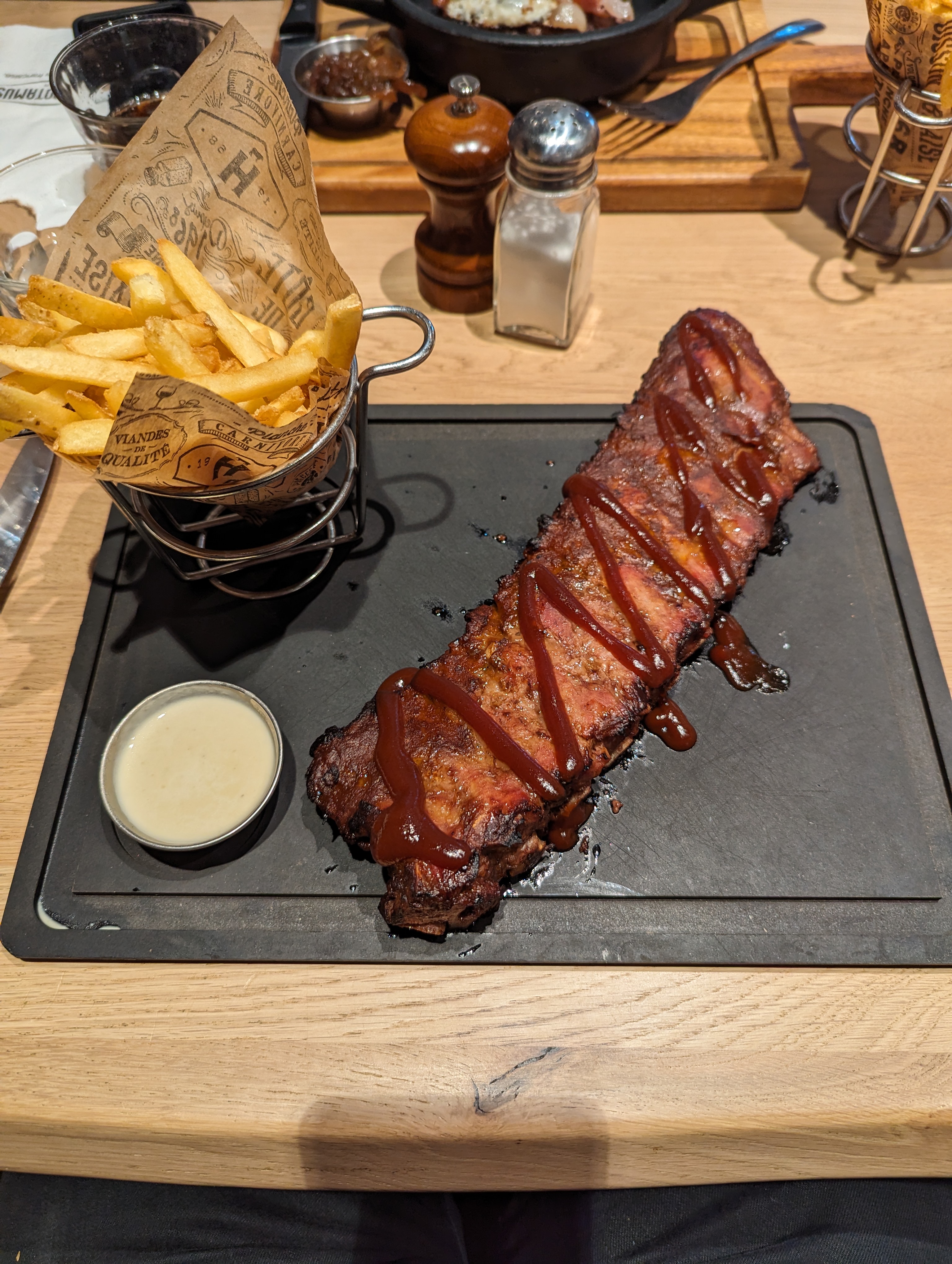 Arrivés à 20h, servis à 20h54 pour un plat unique chacun et après relance auprès de la serveuse. Nous avons dû demander un verre pour notre enfant ( 2 verres pour 3)une carafe d'eau( c'est l'été en +). Après presque une heure d'attente pour un plat chaud chacun, nous avons encore attendus pour les desserts alors que nous les avions commandés en même temps que le reste. Nous sommes sortis de table 2h après notre arrivée et le resto n'était pas rempli, bien au contraire. Le mot que répètent les employés sans soucis. Et bien si, soucis... Y a du boulot pour contenter les clients, vous n'êtes pas au point ! Hier soir, 10/12/22, deuxième visite pour voir si il y a du mieux... Eh bien non... Nous avons commandés deux apéritifs, qui ont été oublié... Résultat nous n avions pas encore eu nos apéritifs que les plats arrivaient. Les bâtonnets fish pour enfants ressemblaient à du plastique.. Cuits et récuits... Inmangeable. Les haricots verts oubliés. Les frites déjà froides.... Les ribs trop cuits voir cramés... Le tout pour 60€ sans entrées et sans dessert Cette fois ci c'est clair, nous ne reviendrons plus.
