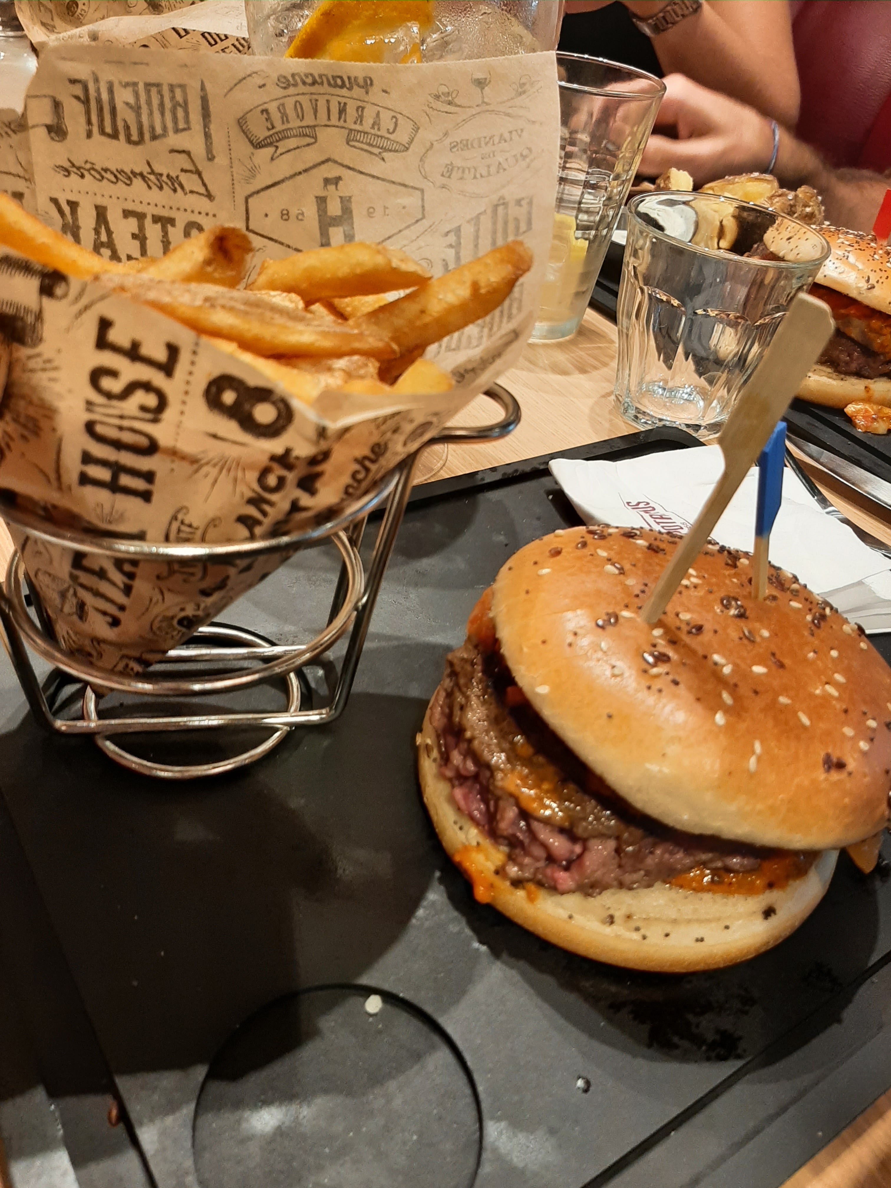 J’aime beaucoup à la déco. Les chips de pommes de terre, faite maison je pense, servi à l’apéro sont très sympa 😊 Si vous aimez la viande, c’est un bonne adresse. J’ai pris un steak sauce chorizo et poivron mais je n’ai pas eu le goût du chorizo en bouche. Mon conjoint a commandé un steak sauce au poivre mais pas de poivre en bouche. Malheureusement s’était fade ! De plus, nous avons commandés les desserts que le serveur a oublié d’envoyer en commande. Il revient à notre table pour nous redemander notre commande … c’était long.